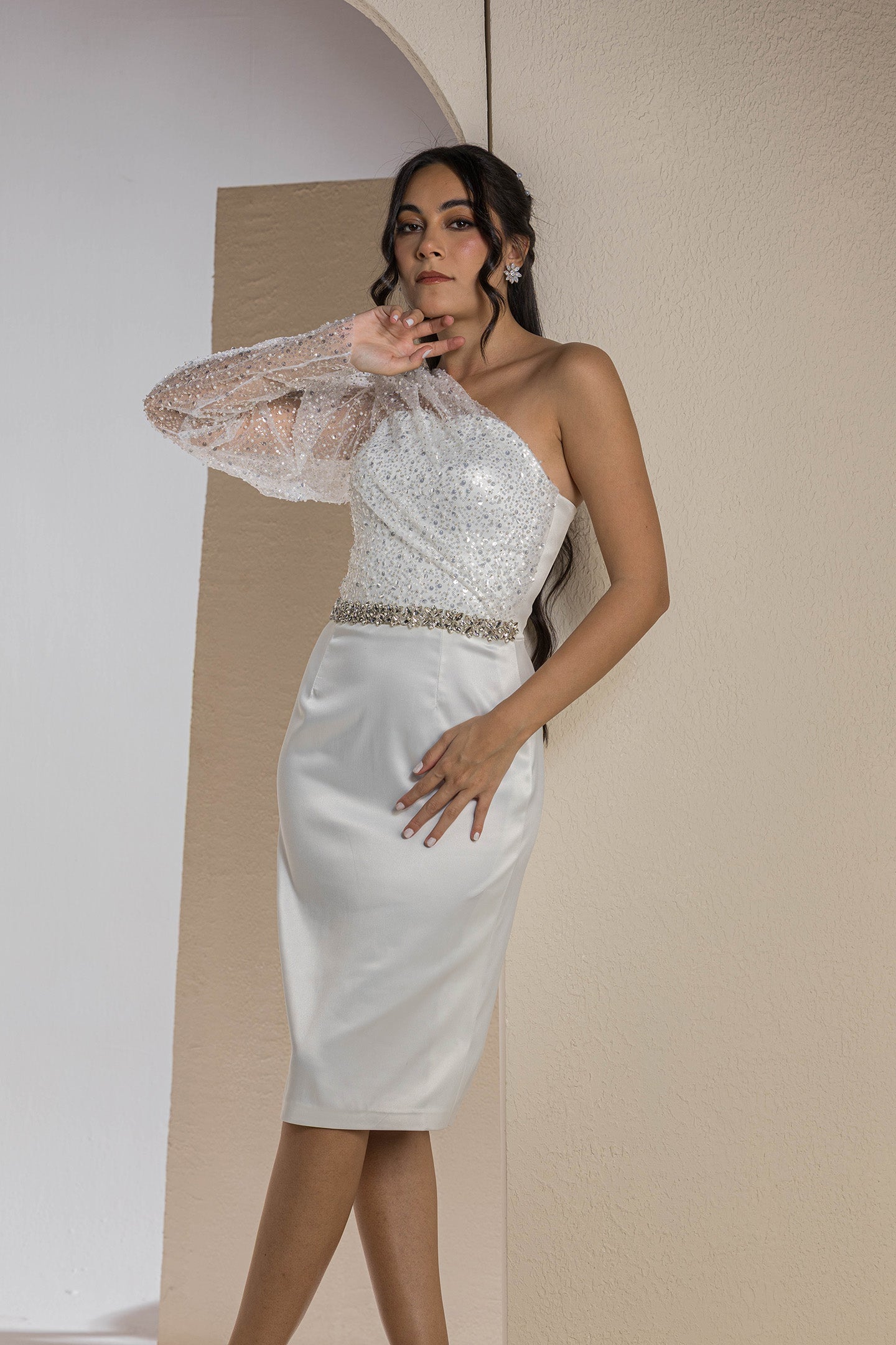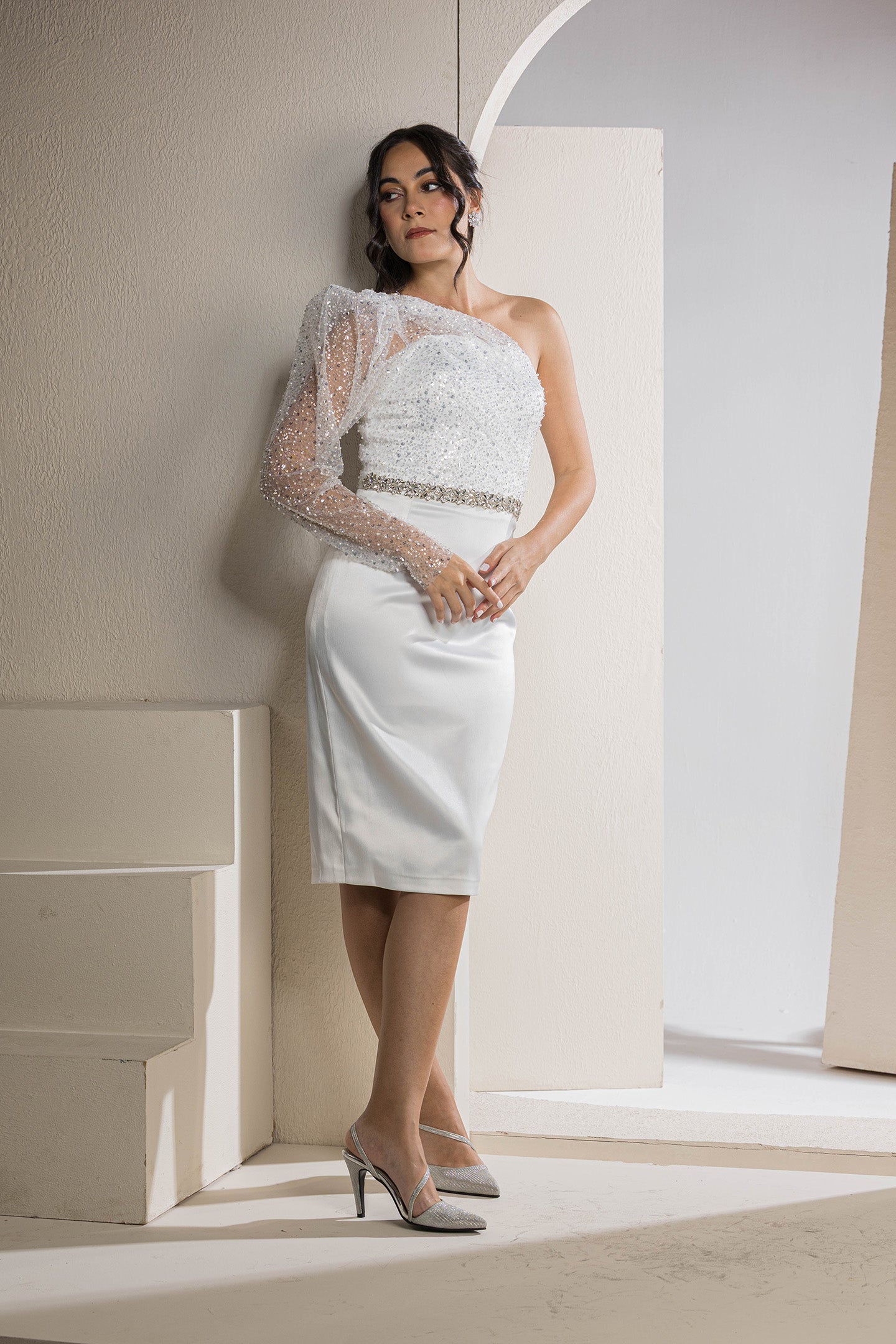 Dazzle with sophisticated elegance in this stunning one-shoulder midi dress. The asymmetric design features a beautifully embellished bodice adorned with sparkling beads and sequins, extending into a magnificent sheer sleeve that shimmers with every movement. The single shoulder creates a striking, modern silhouette. A delicate, crystal-encrusted belt cinches the waist, highlighting your figure, while the sleek, form-fitting skirt drapes gracefully to a chic midi length. Crafted from a luxurious white fabric, this dress combines intricate detailing with a contemporary cut, making it perfect for your engagement day.