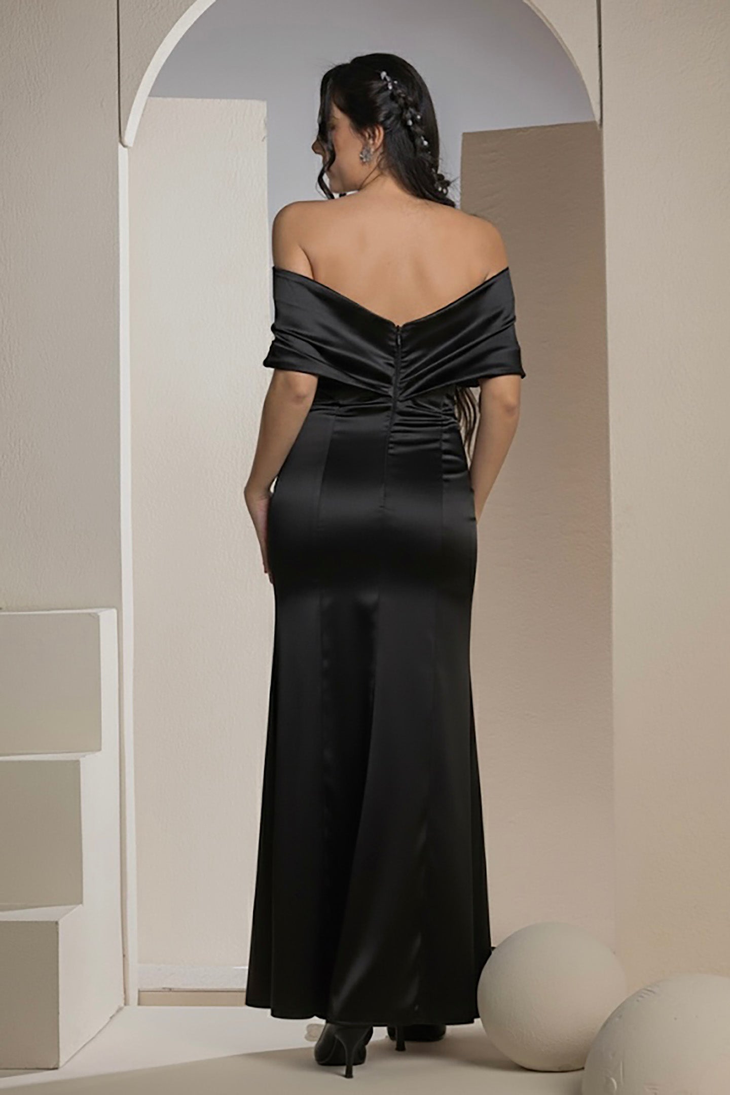 The Pearl Bow Gown in Black redefines evening elegance. Designed with a lustrous satin finish, its off-shoulder drape and pearl-detailed knot offer a perfect balance of drama and refinement. The sleek, floor-length cut elongates the figure, creating an effortlessly timeless silhouette. Ideal for black-tie events, formal engagements, or elegant soirées, this gown reflects Rafeya’s commitment to sophistication, inclusivity, and effortless allure.
