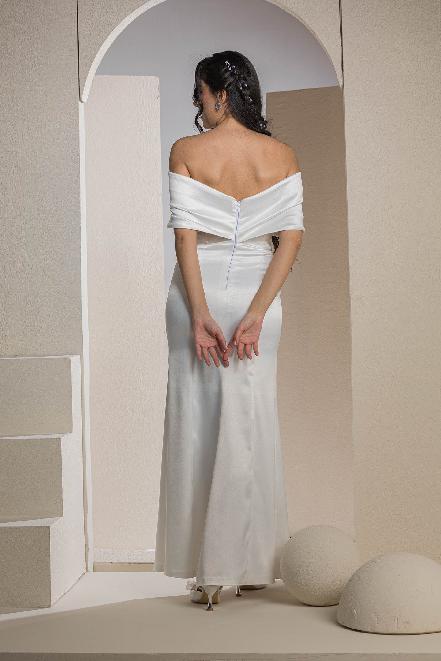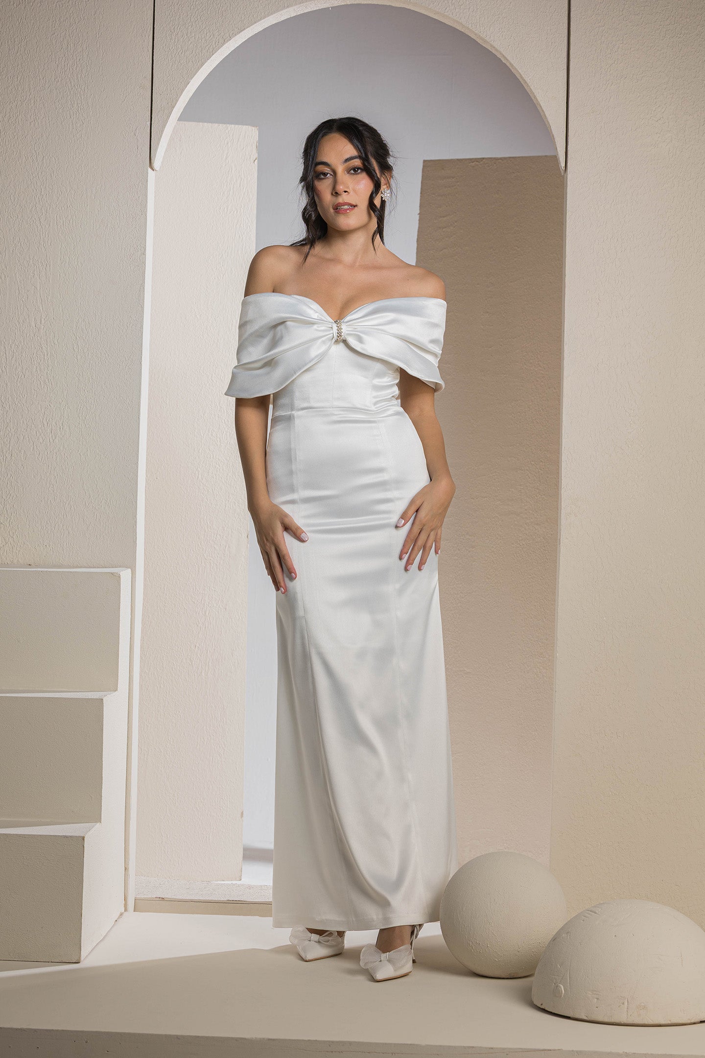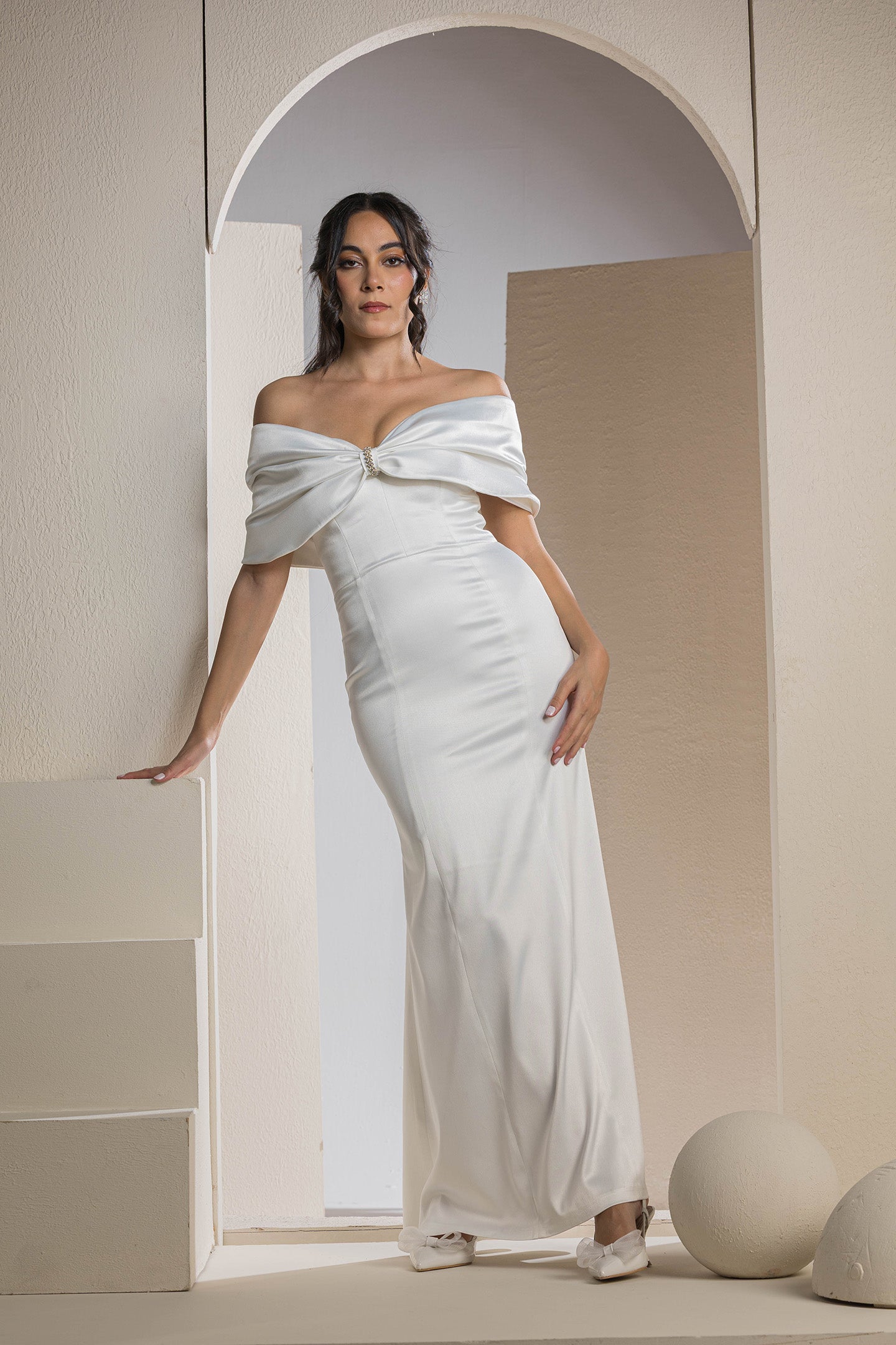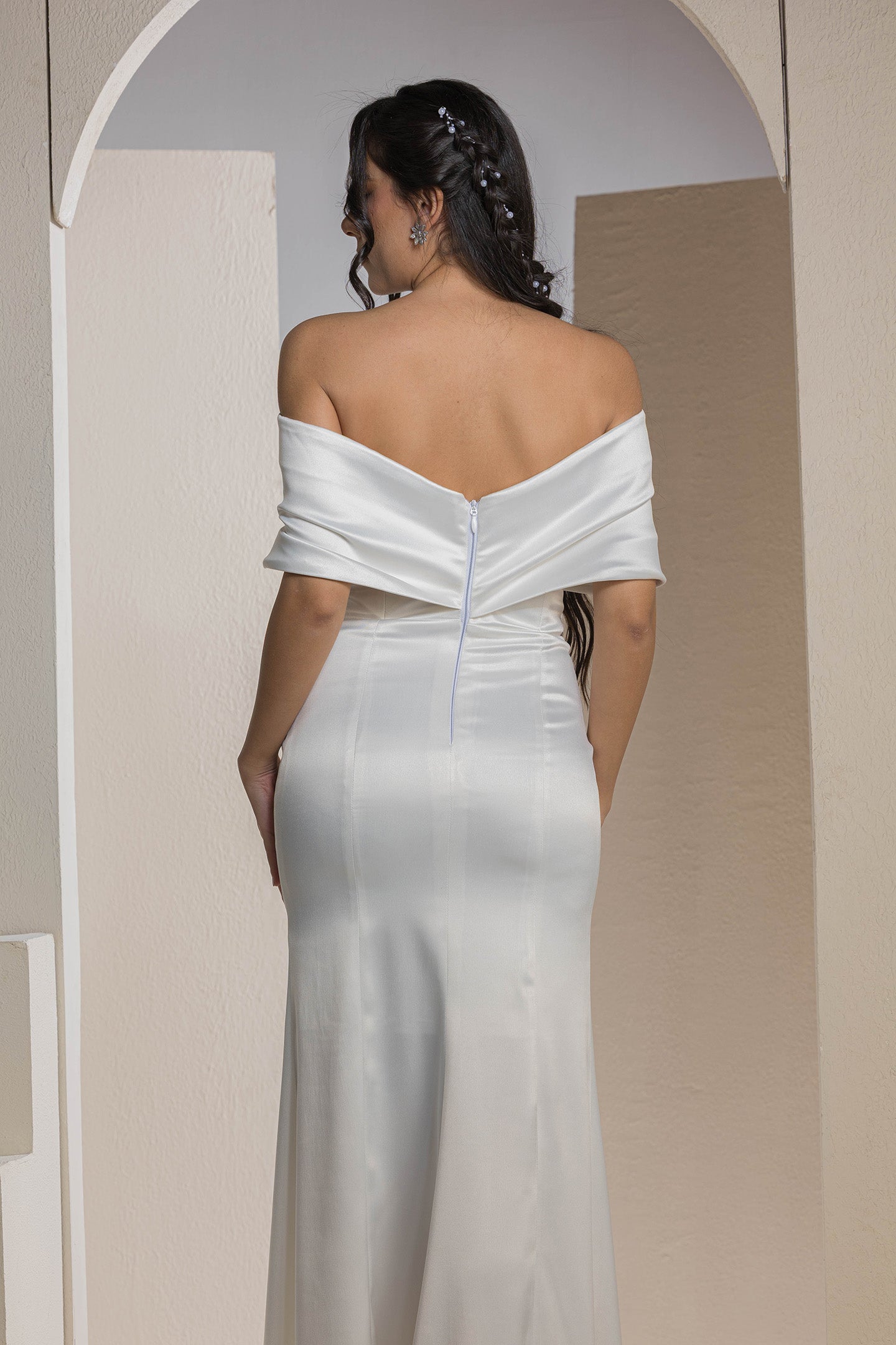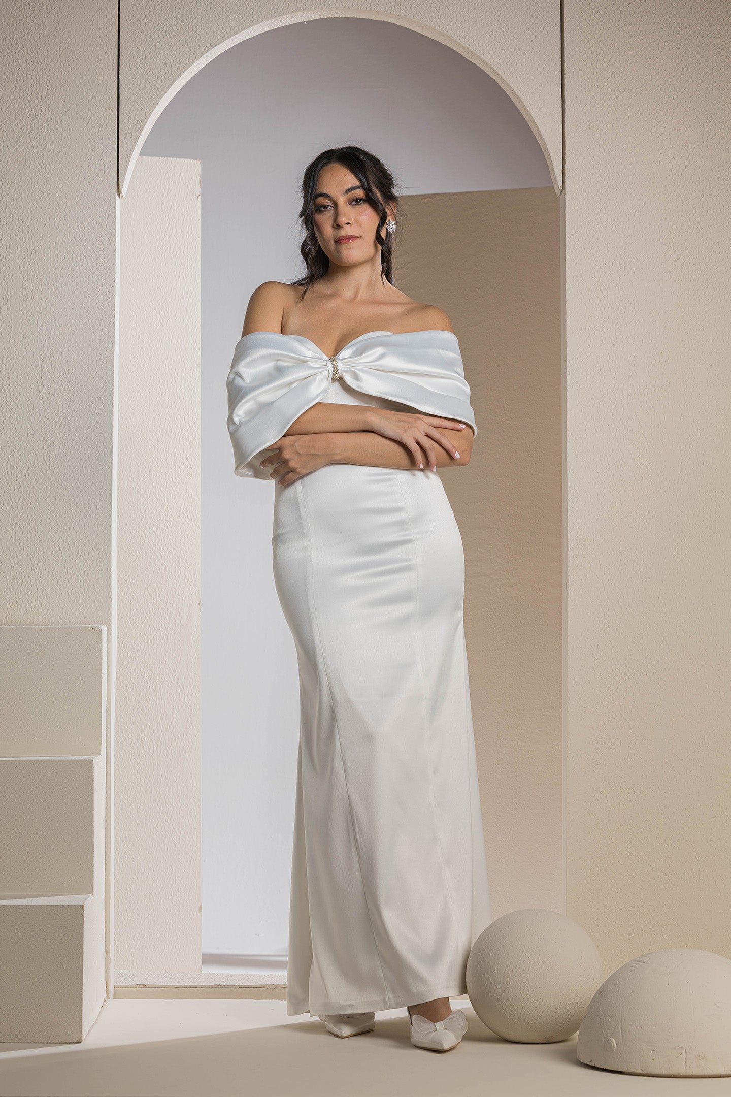 The Pearl Bow Dress redefines timeless elegance with a contemporary touch. Crafted from luxurious satin, this off-shoulder silhouette features a softly draped bodice gathered at the center with a delicate pearl and crystal detail. The fitted cut flows effortlessly into a floor-length skirt, creating a refined, statuesque look. Perfect for engagements, bridal soirées, or intimate celebrations, this piece embodies the essence of understated glamour—graceful, confident, and endlessly sophisticated. True to Rafeya’s vision, it celebrates every woman’s beauty through impeccable design and inclusive fit.