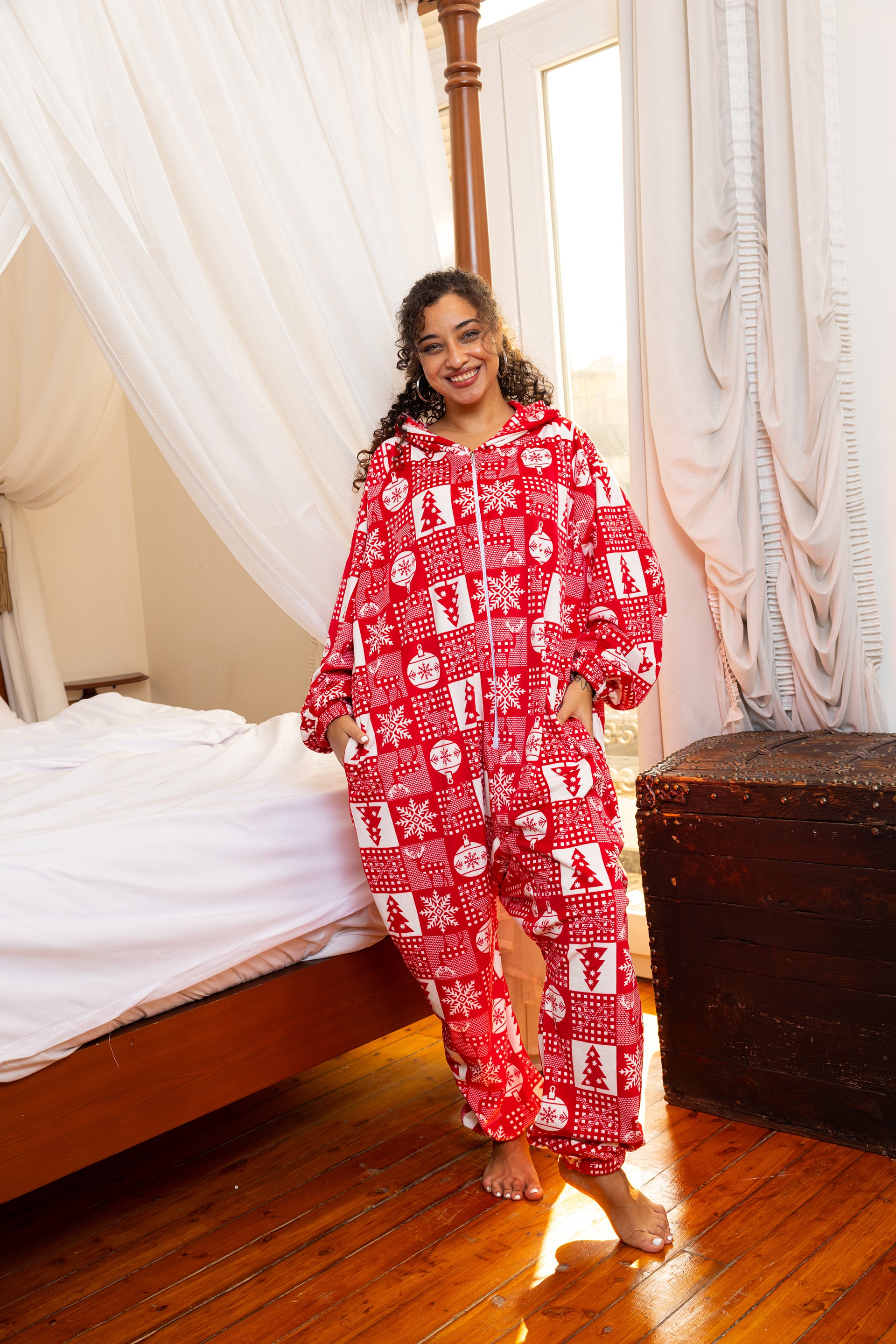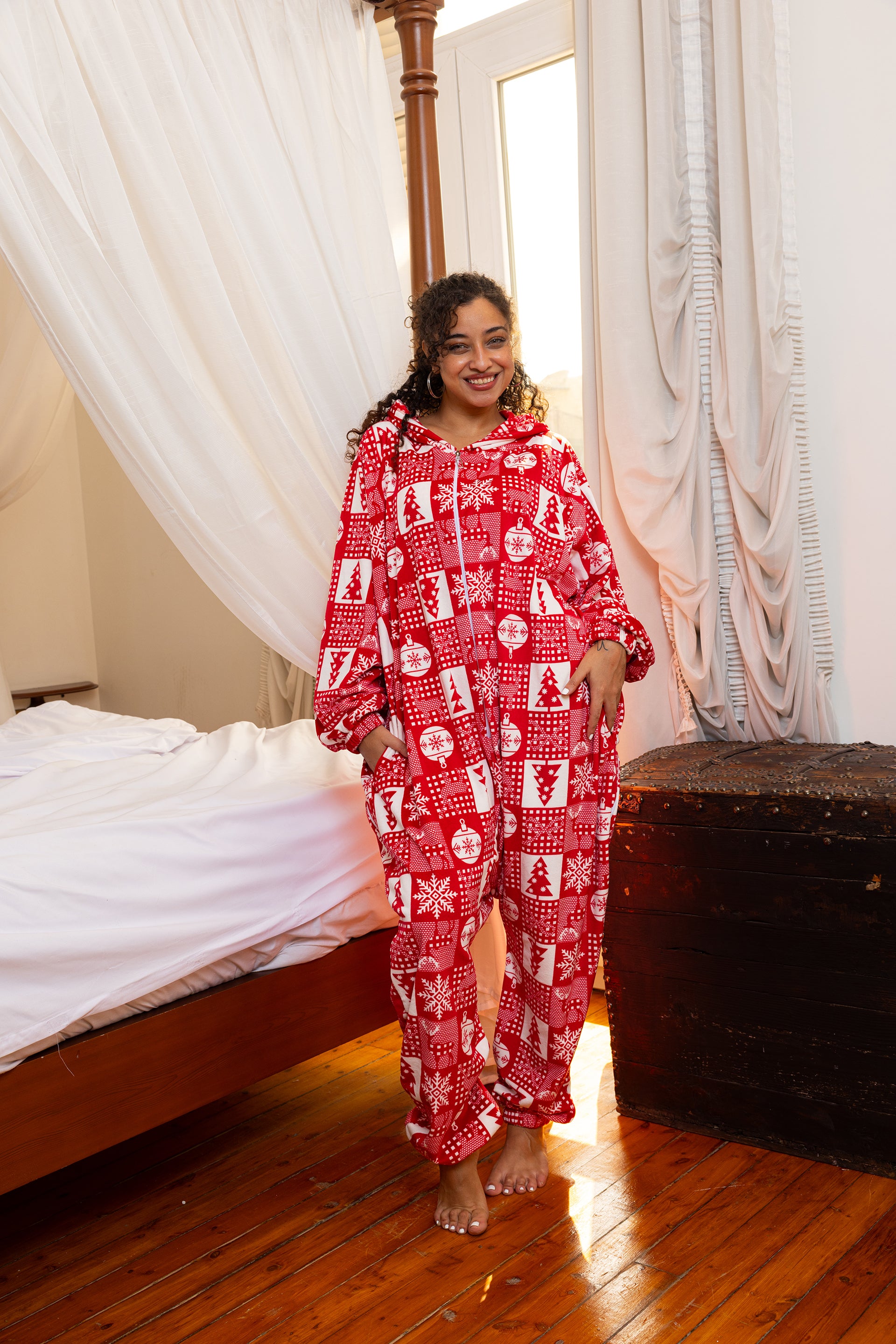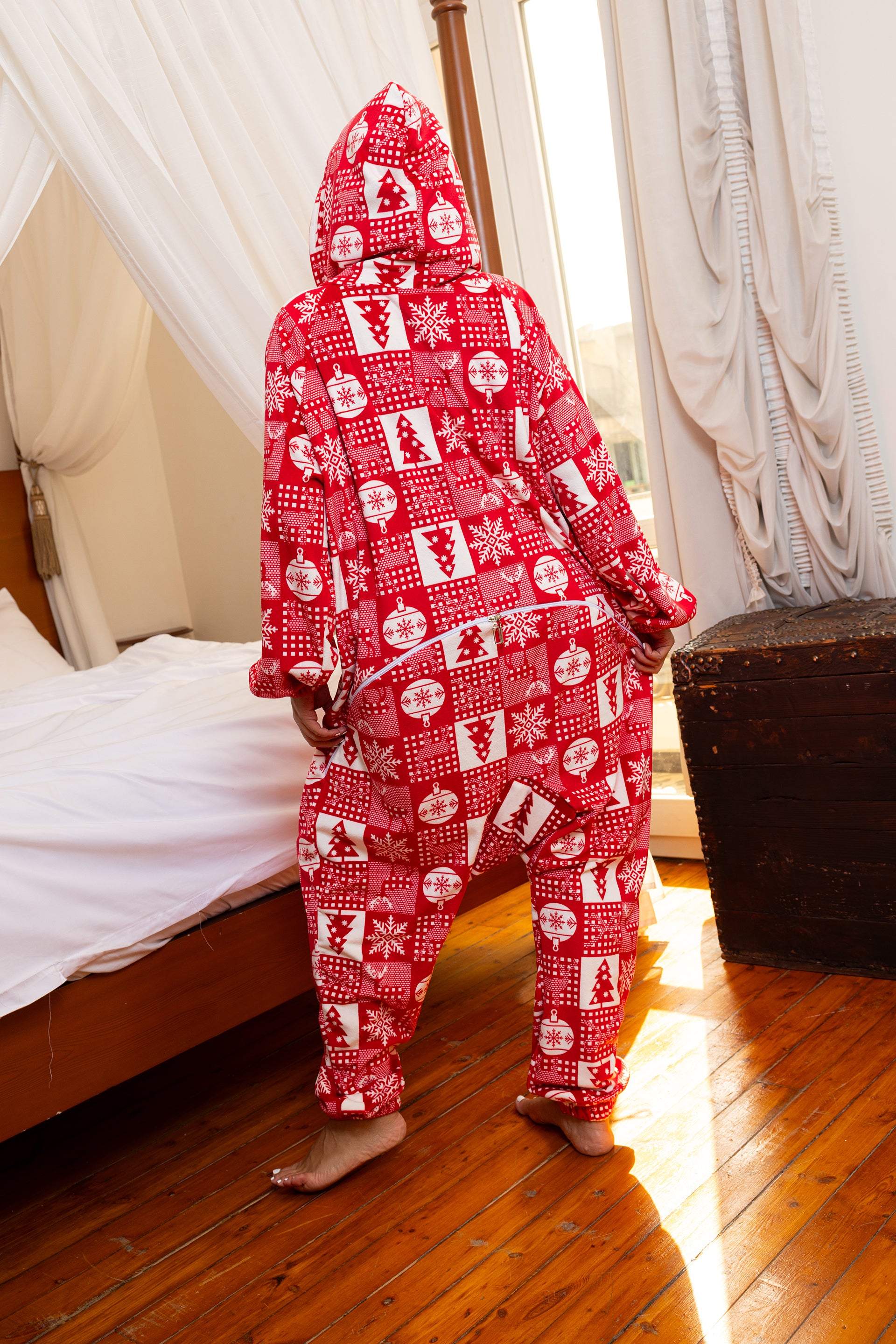 Make every winter night merry and bright with Rafeya’s Festive Red Oversized Onesie. Crafted from ultra-soft velvet, this one-piece brings warmth and cheer with its joyful holiday pattern of snowflakes, ornaments, and Christmas trees.