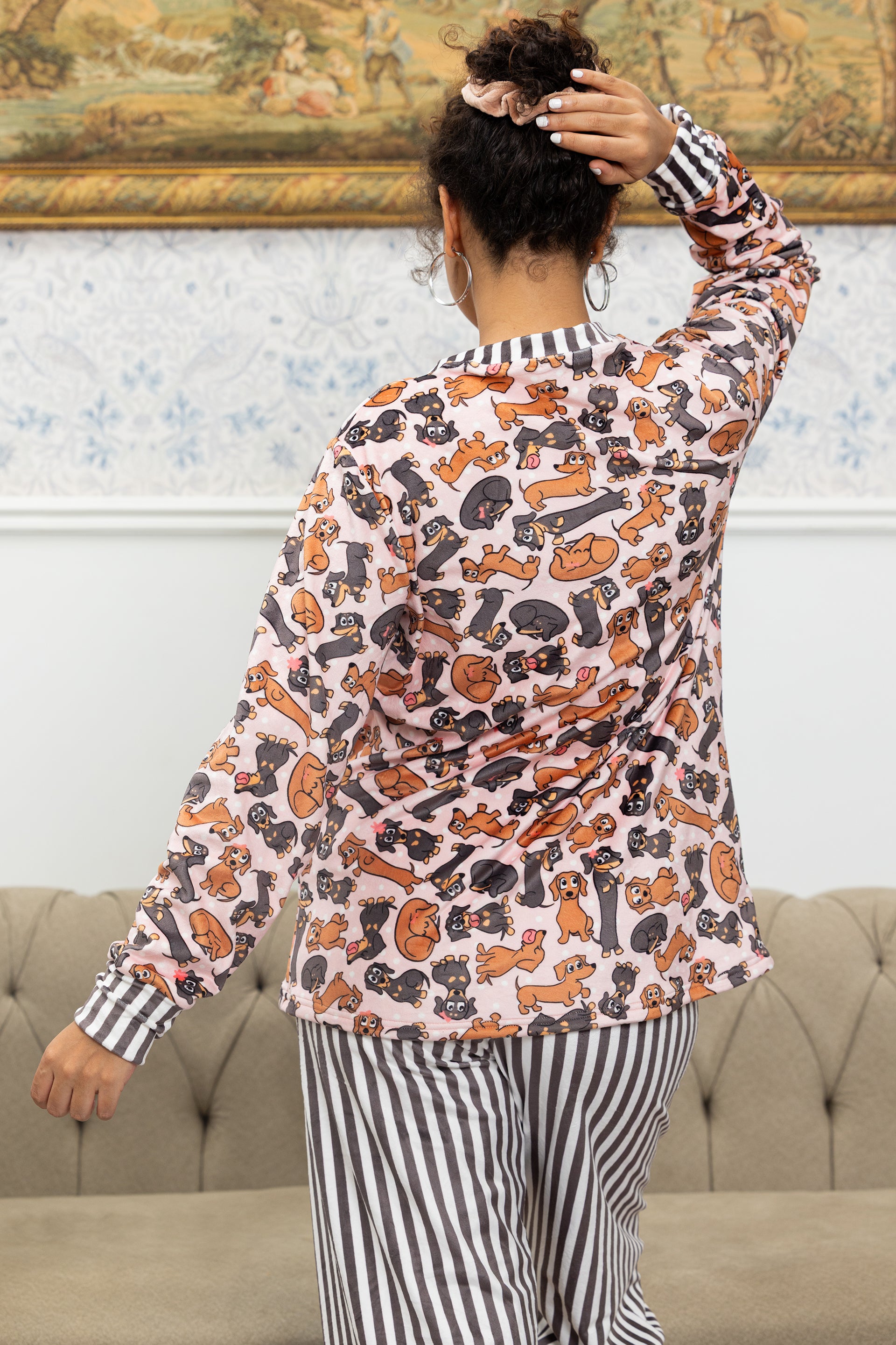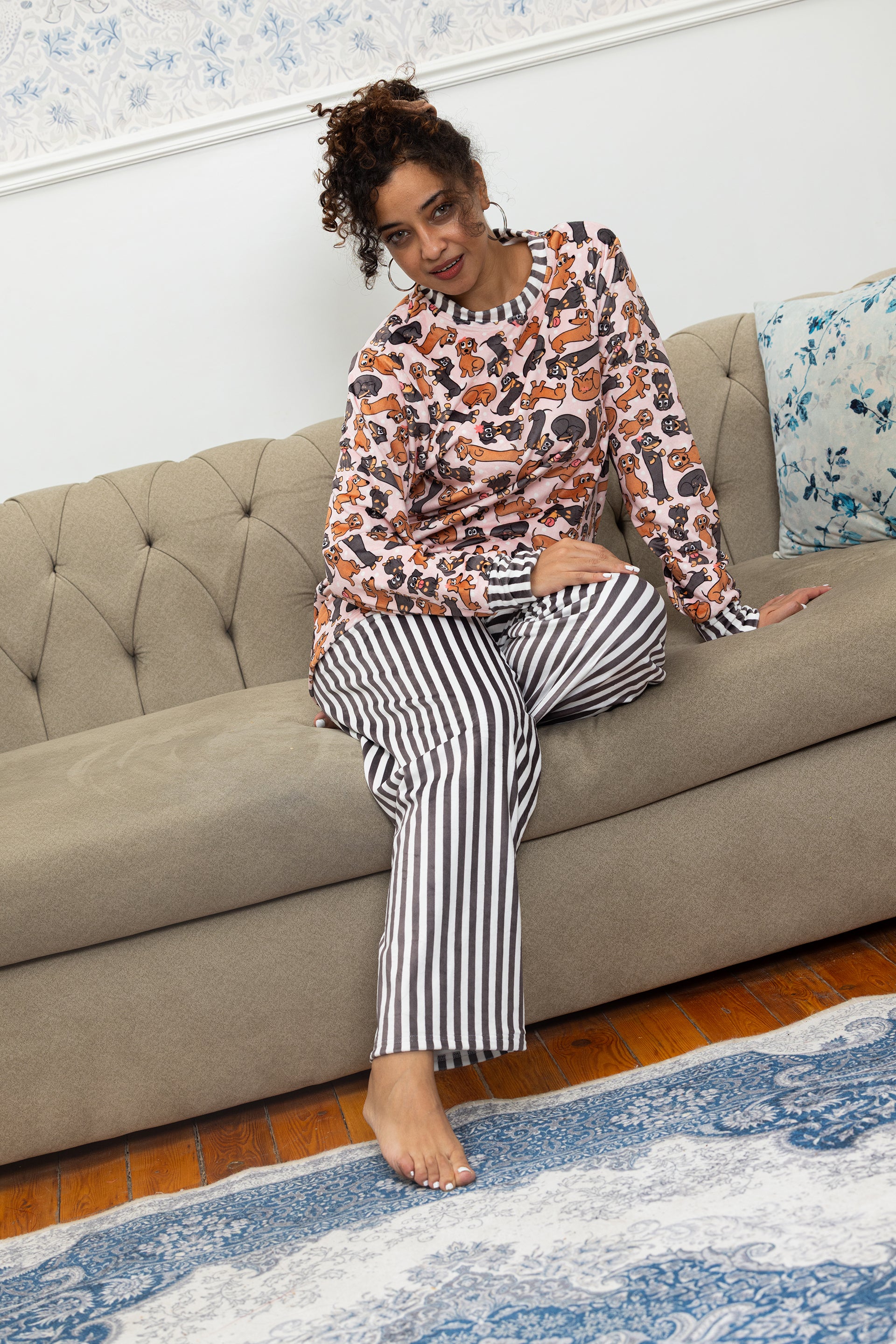 Bring a touch of playfulness to your evenings with the Cozy Companions Set — featuring a charming mix of cartoon pups and sleek striped bottoms. Designed for women who love comfort with personality, it blends soft fabrics and a relaxed cut for easy movement and warmth. Perfect for unwinding after long days or sharing cozy moments with your furry friends.