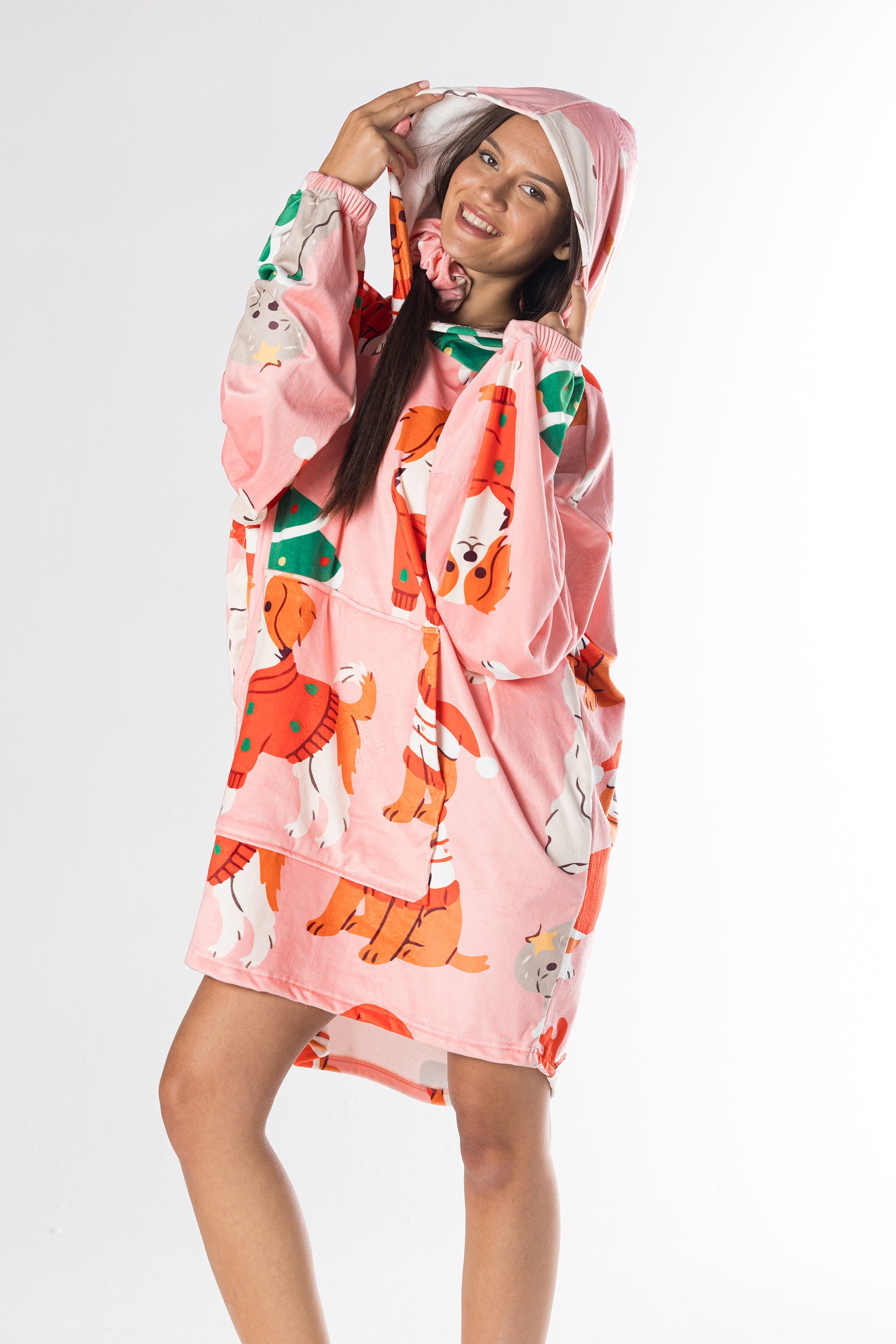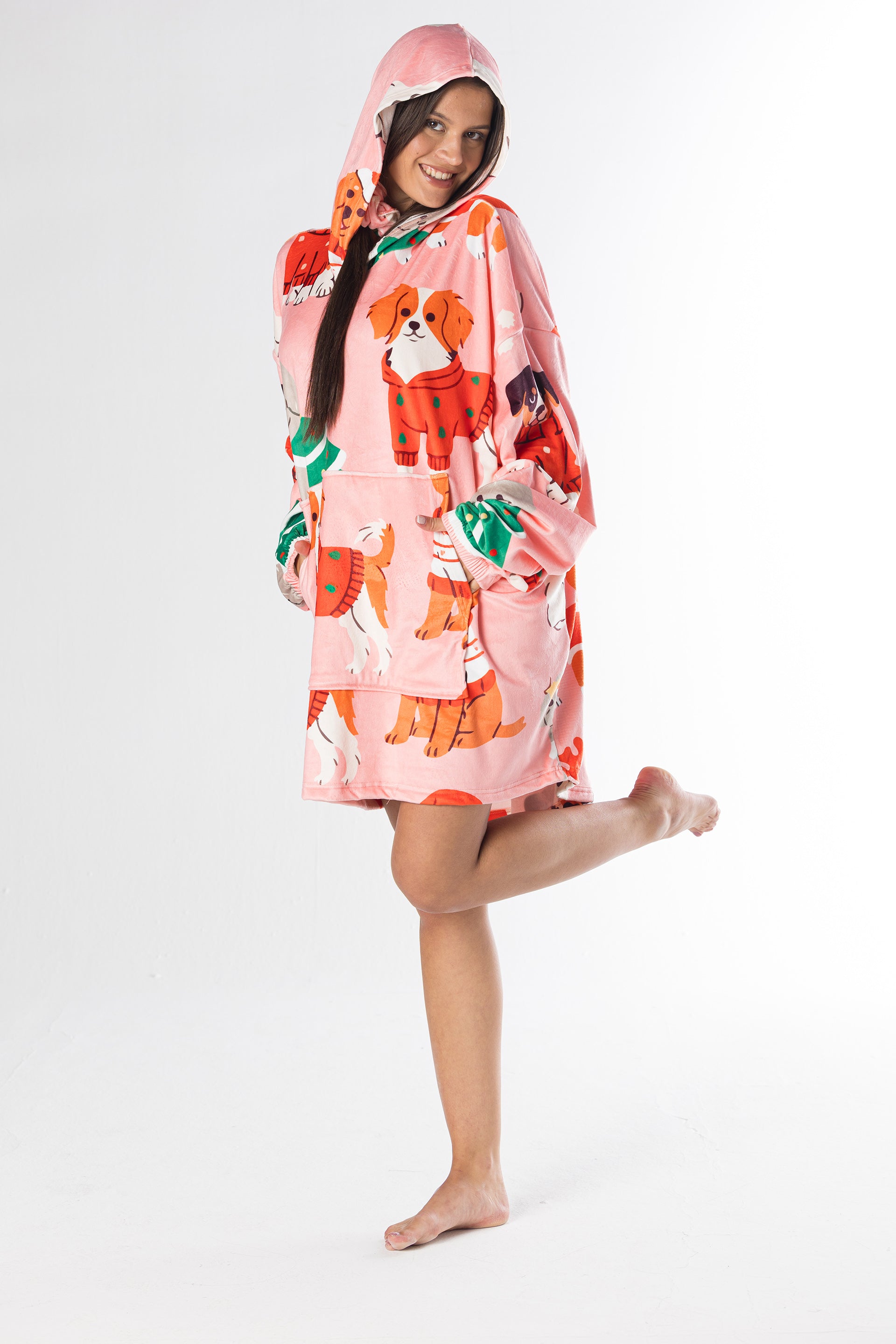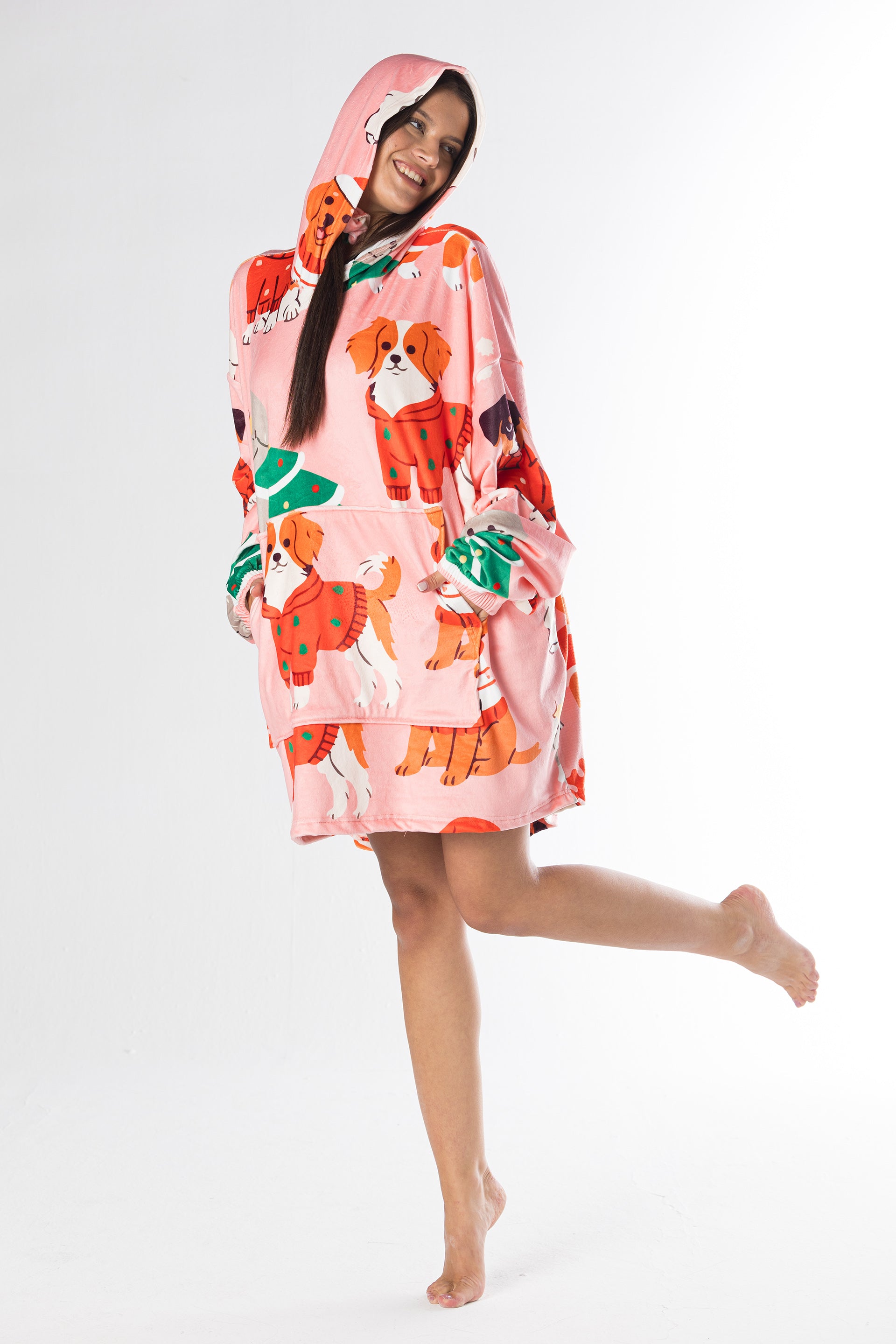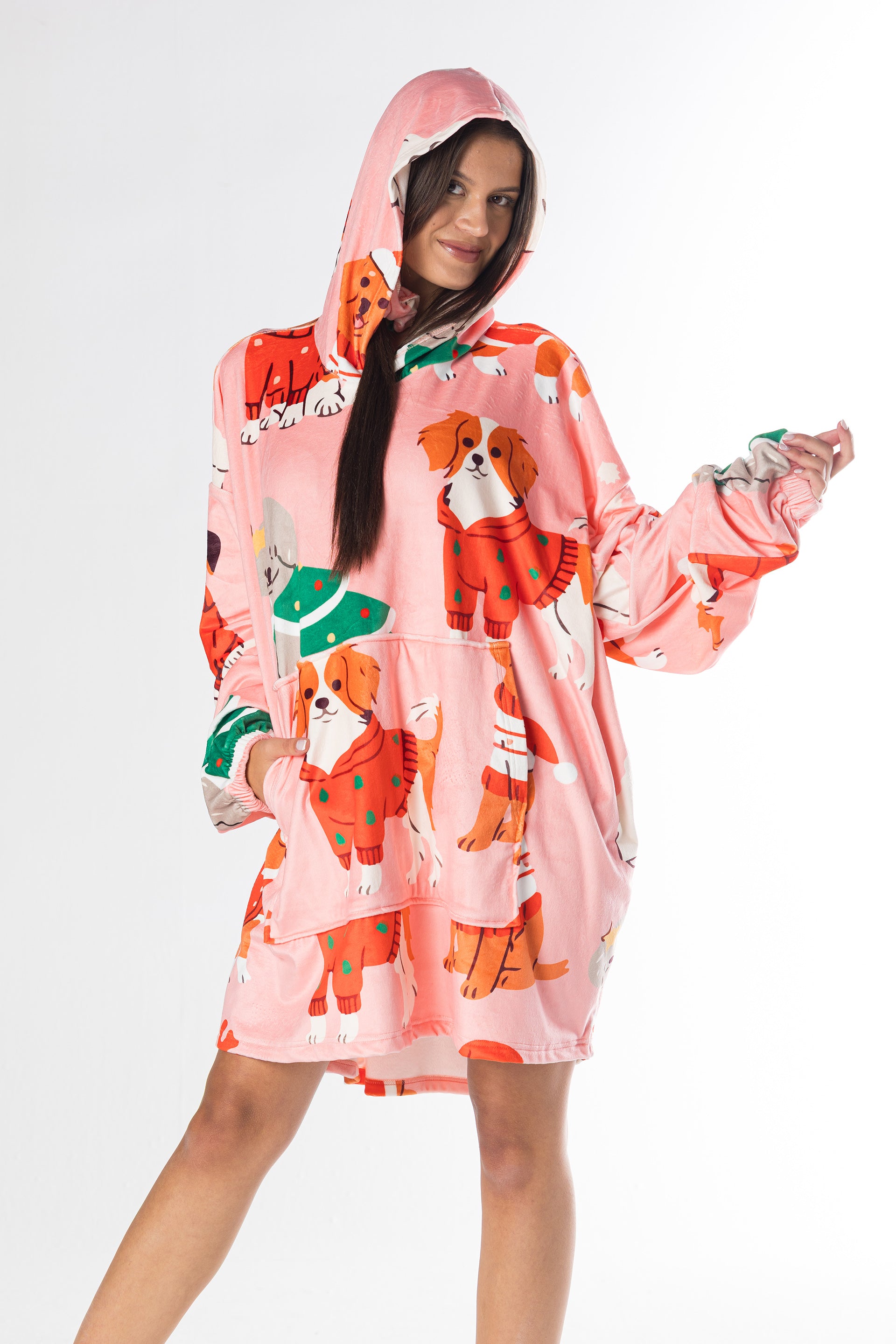 Featuring a playful dog pattern in festive sweaters, this velvet fleece hoodie blanket is a must-have for lounging at home, winter nights, or as a fun and thoughtful gift. Stay warm, comfy, and effortlessly cute!