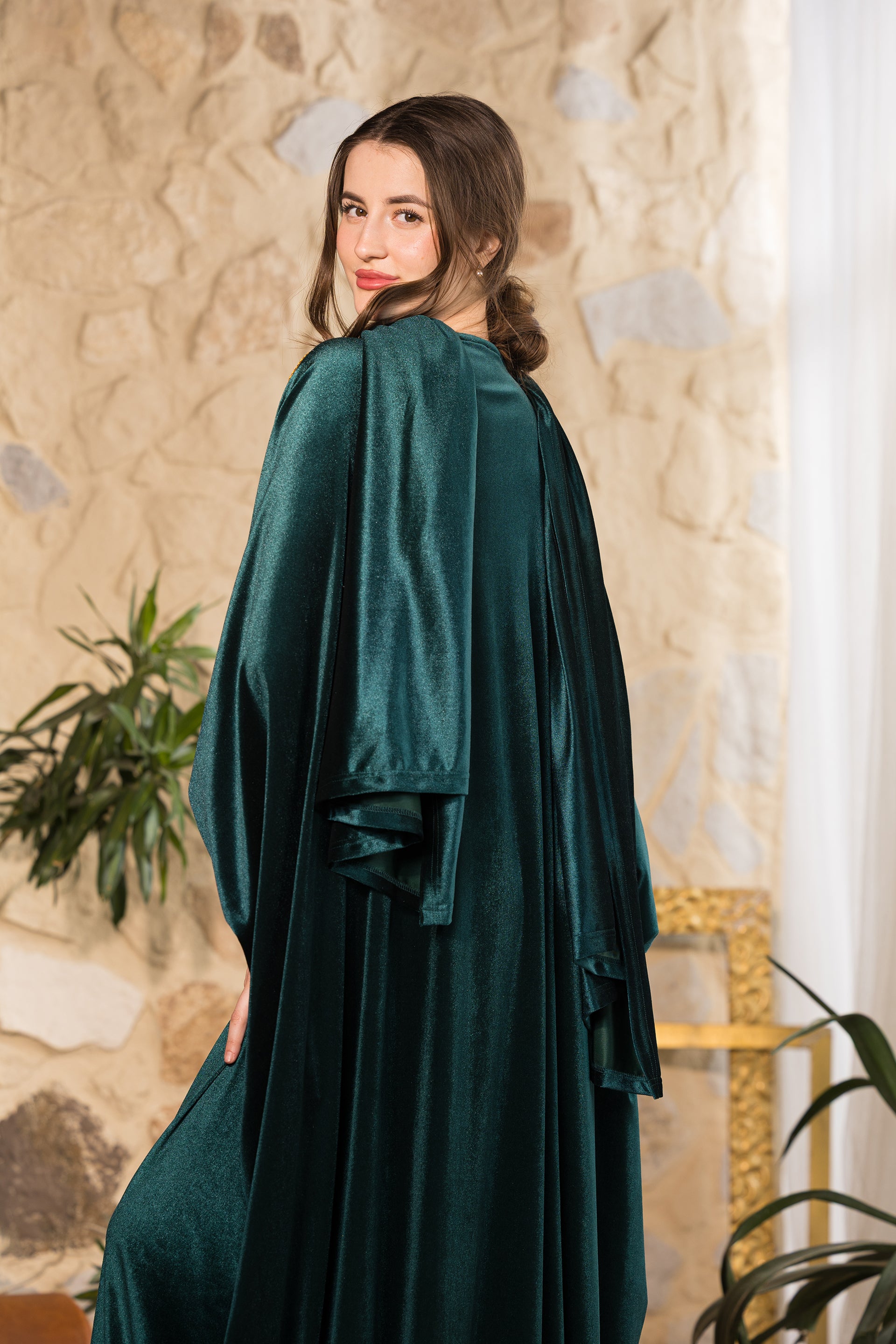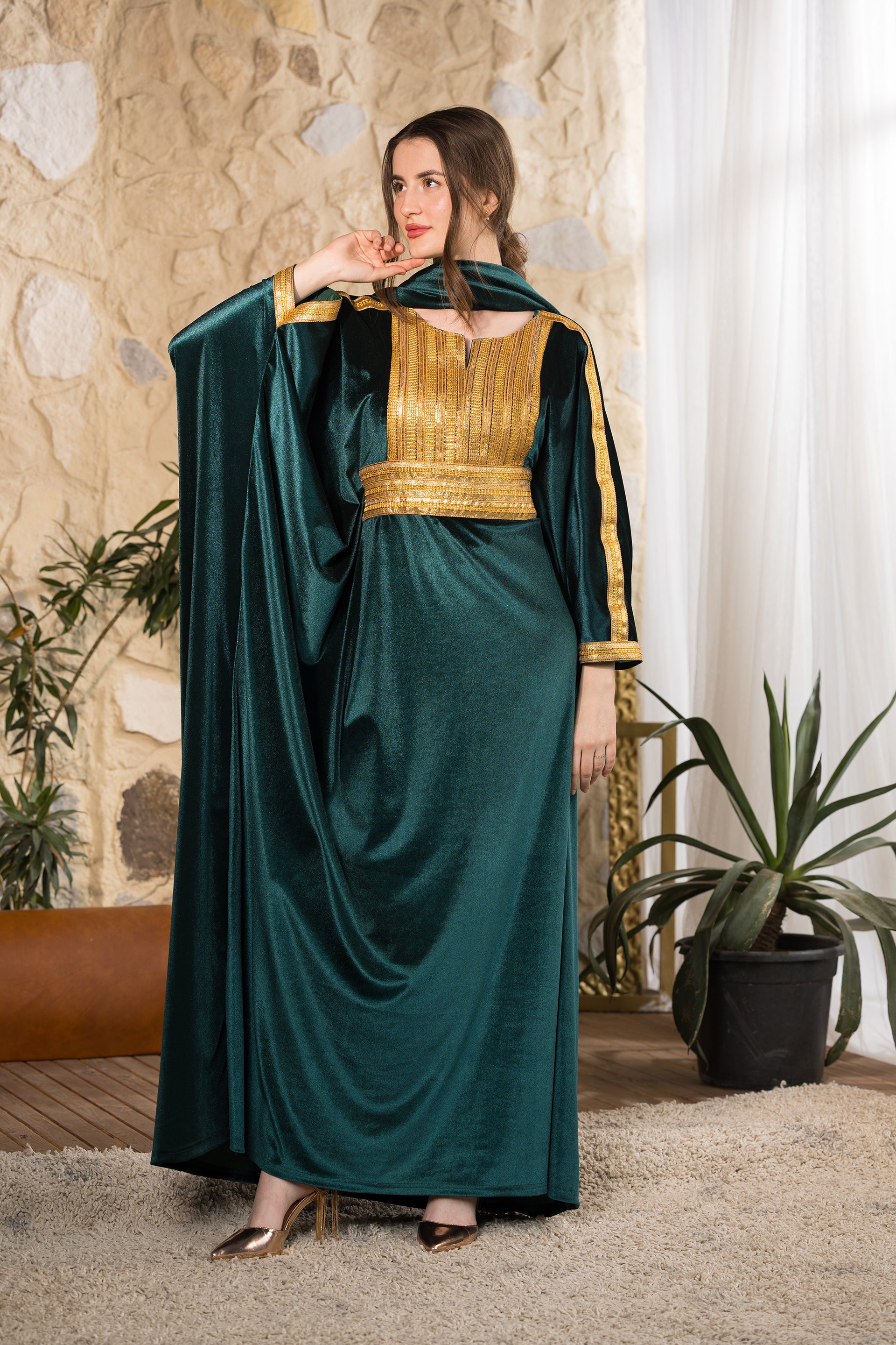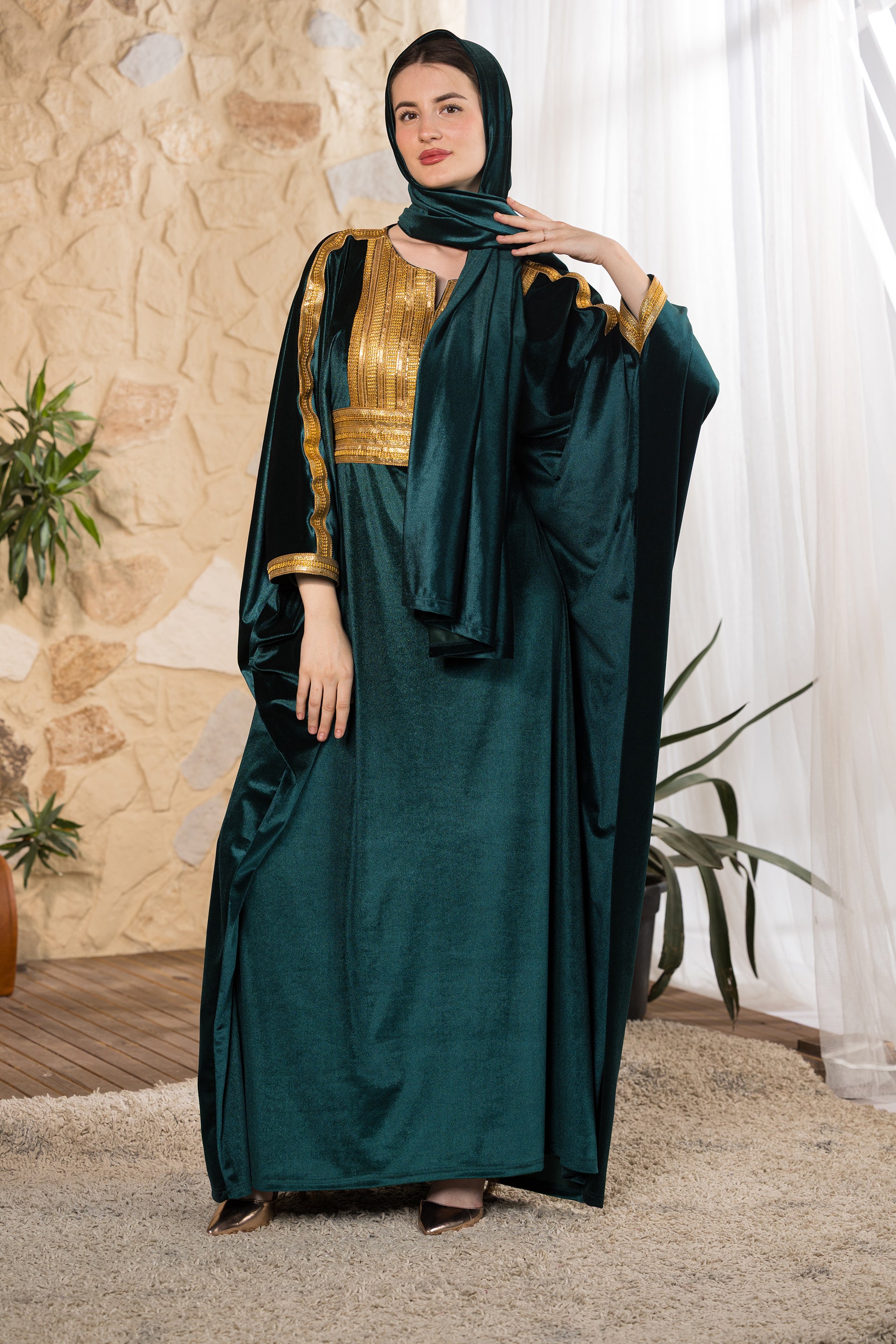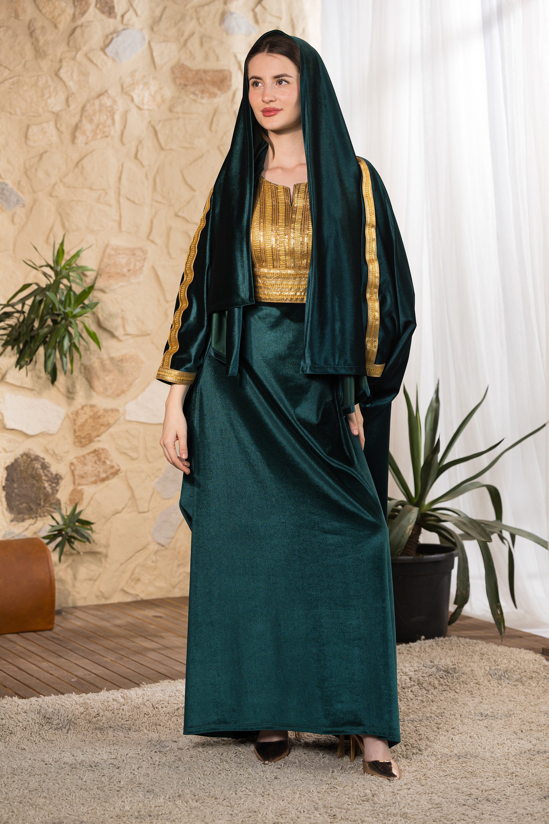 Discover refined elegance with the Emerald Serenity Velvet Abaya, a graceful design created to blend sophistication with comfort and modest versatility. Crafted from rich emerald velvet with a soft luminous finish, this abaya drapes effortlessly to create a fluid, elongated silhouette. The front bodice features intricate gold embroidery that adds structure and regal detail, complemented by delicate trim accents along the sleeves. Designed with a relaxed cut for comfort and ease of movement, this piece transitions beautifully from gatherings to spiritual moments. The abaya comes with an unattached matching velvet scarf, allowing flexible styling and full coverage when needed. Its flowing silhouette and practical design make it especially suitable for prayer, offering comfort, modesty, and elegance in one complete look. Part of our size-inclusive collection, this abaya is fully customizable — customers can add their height and exact body measurements for a perfect tailored fit. Designed and tailored in Egypt to celebrate faith, femininity, and timeless craftsmanship.