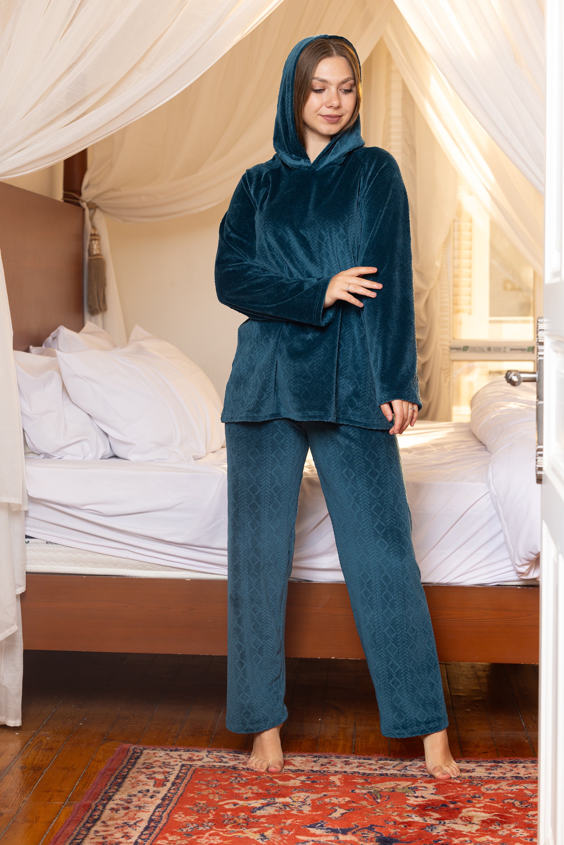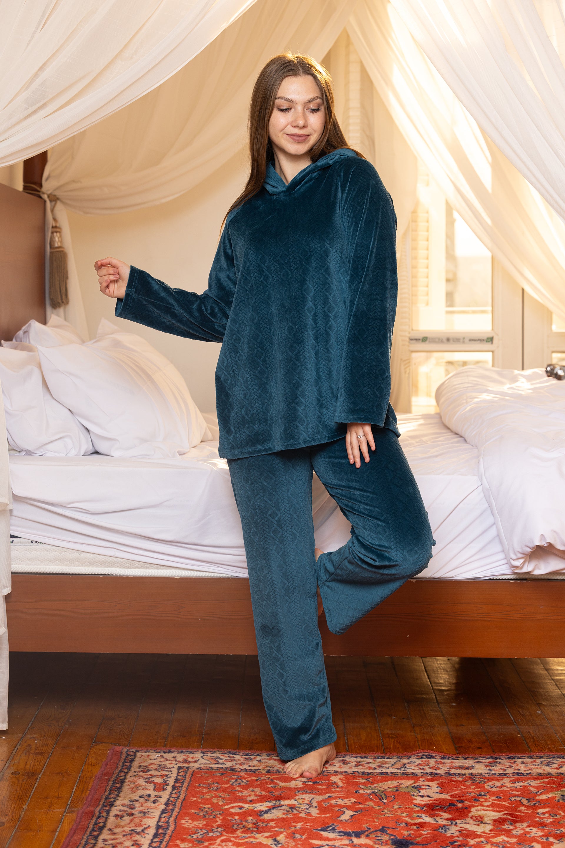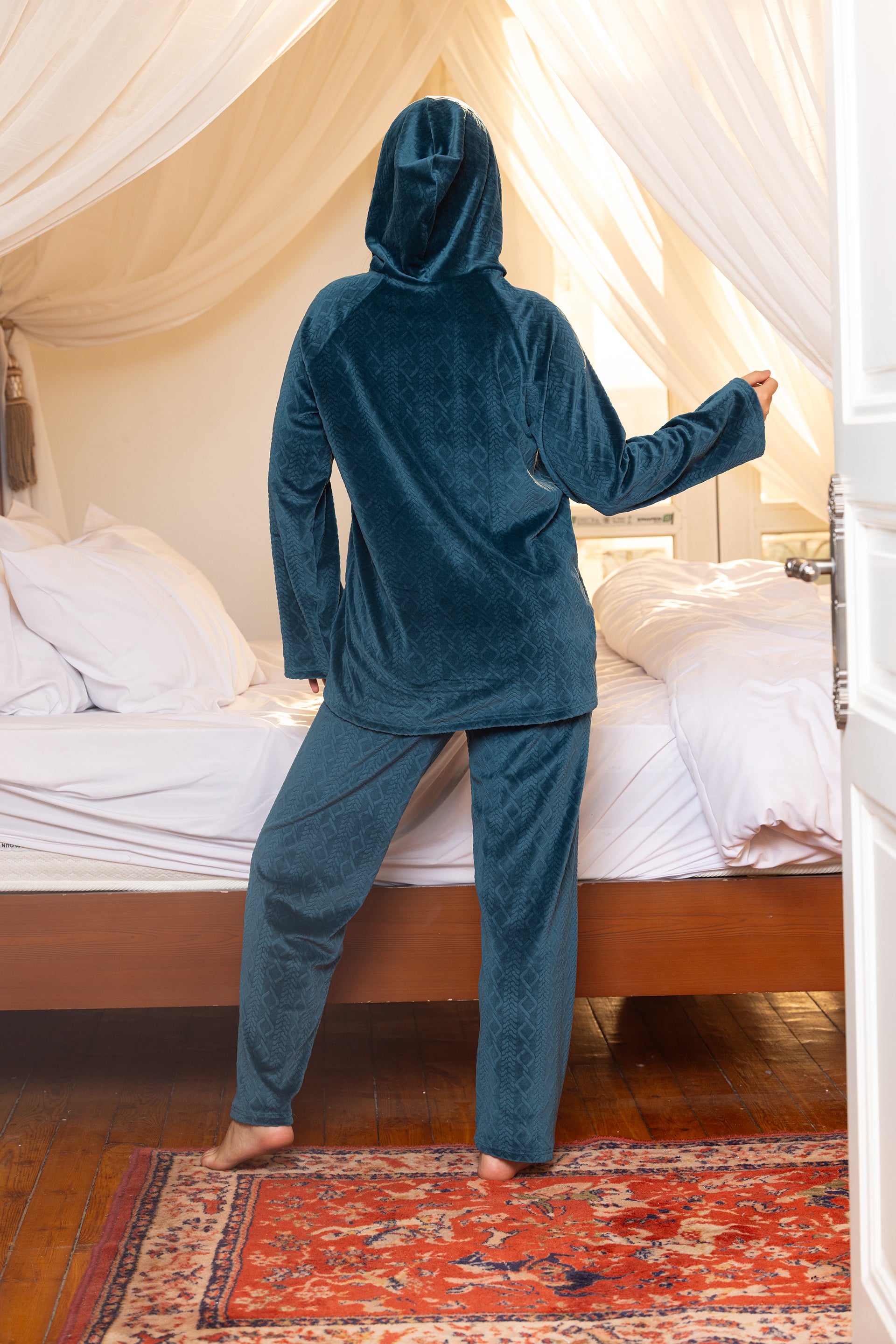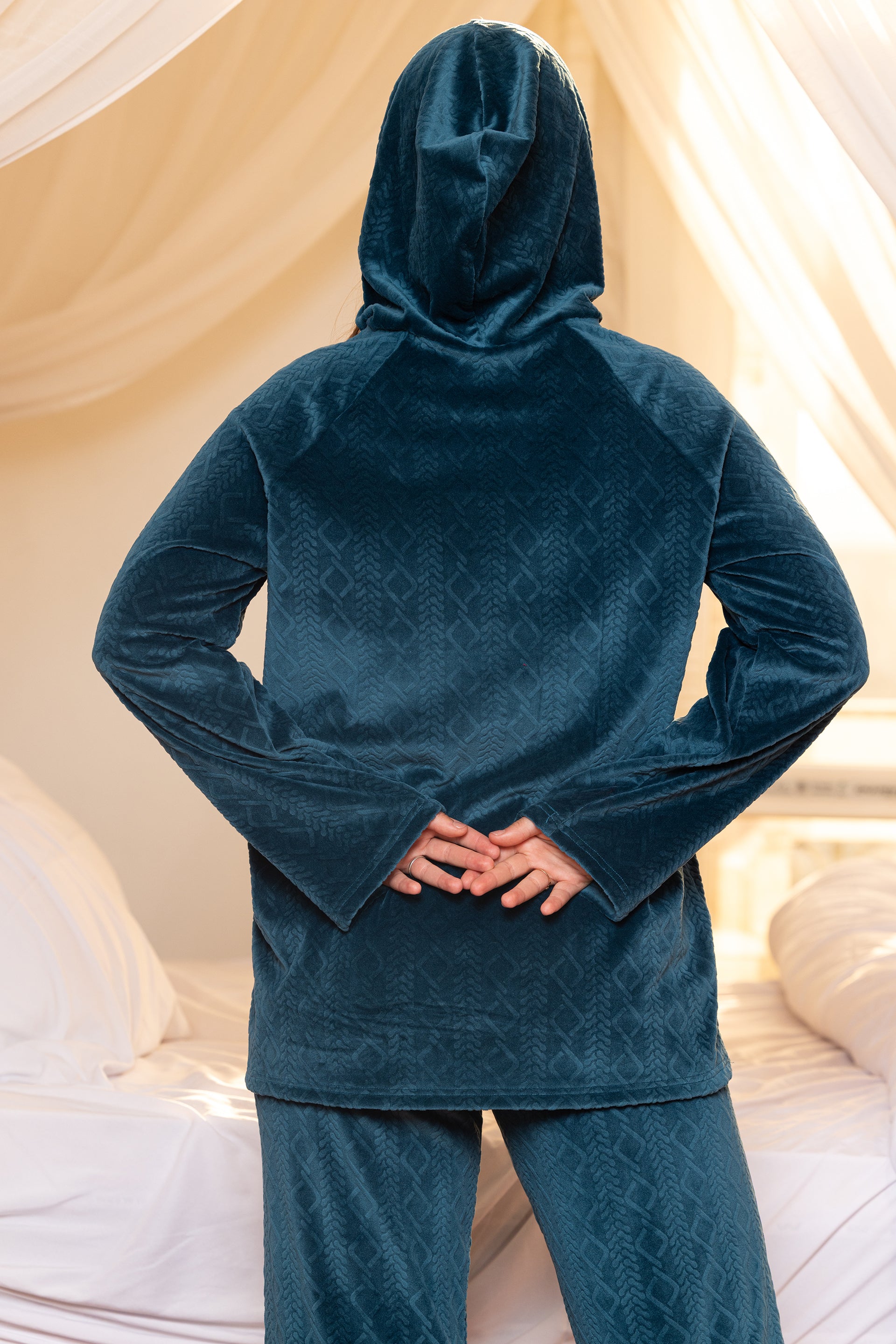 Ease into comfort with Rafeya’s Midnight Teal Lounge Set, made from luxurious velvet jacquard that feels as soft as it looks. Designed for cozy winter days and relaxed evenings at home, this two-piece set features a loose-fit hooded top and matching straight-cut pants for effortless comfort and warmth.