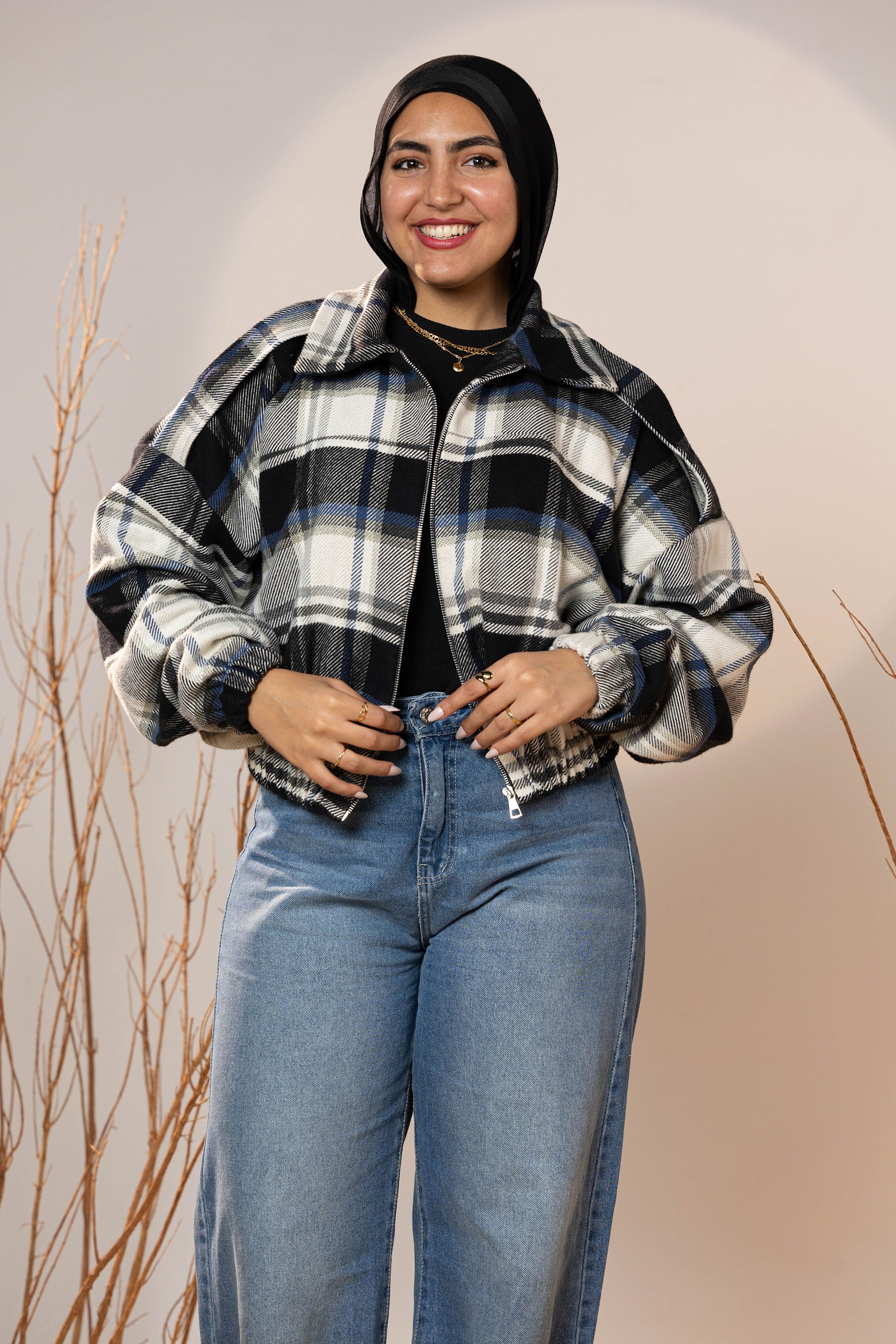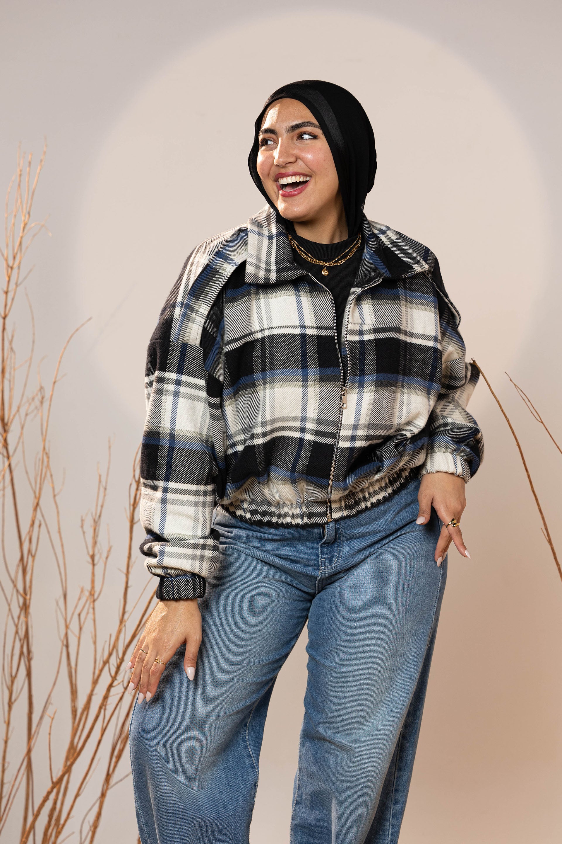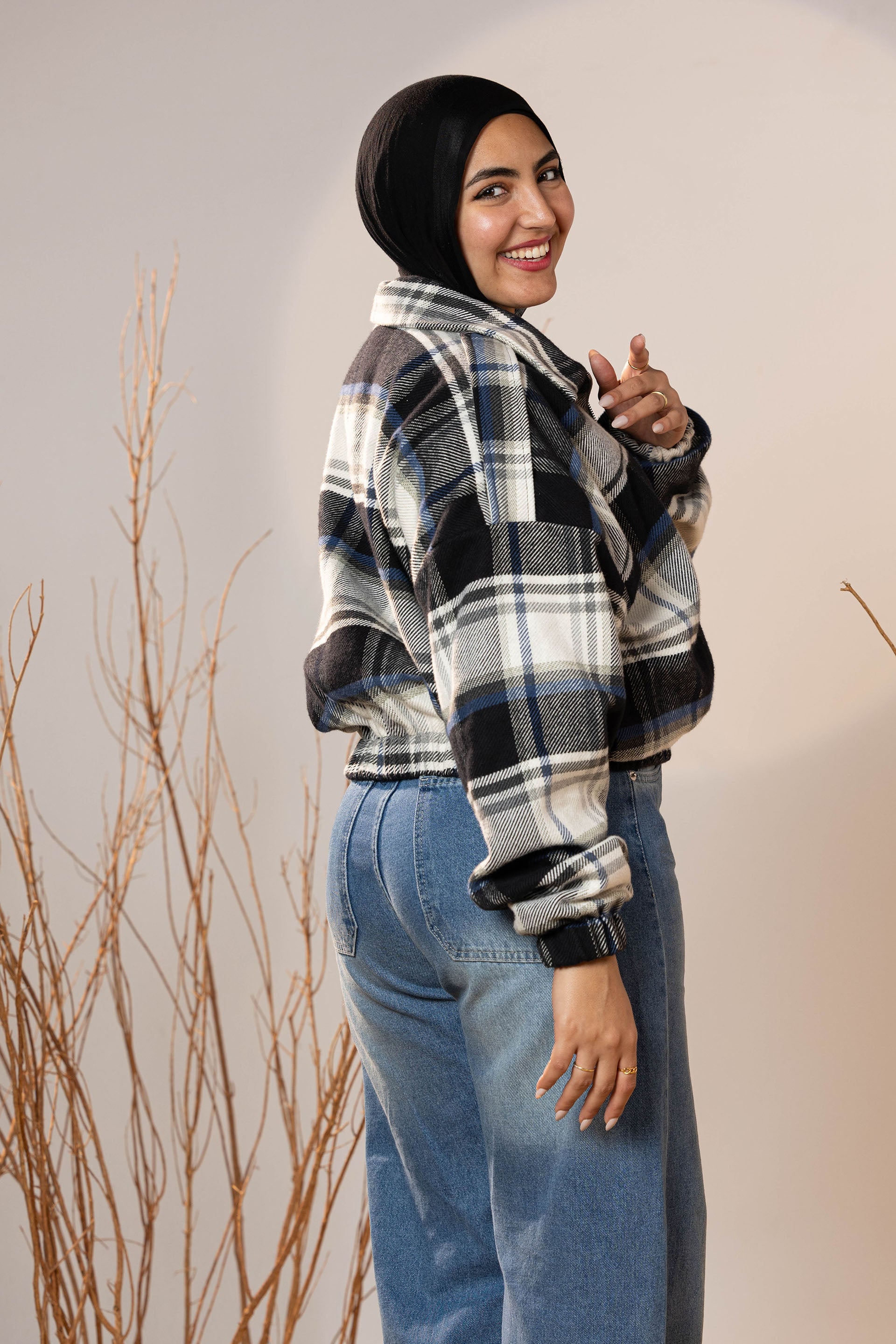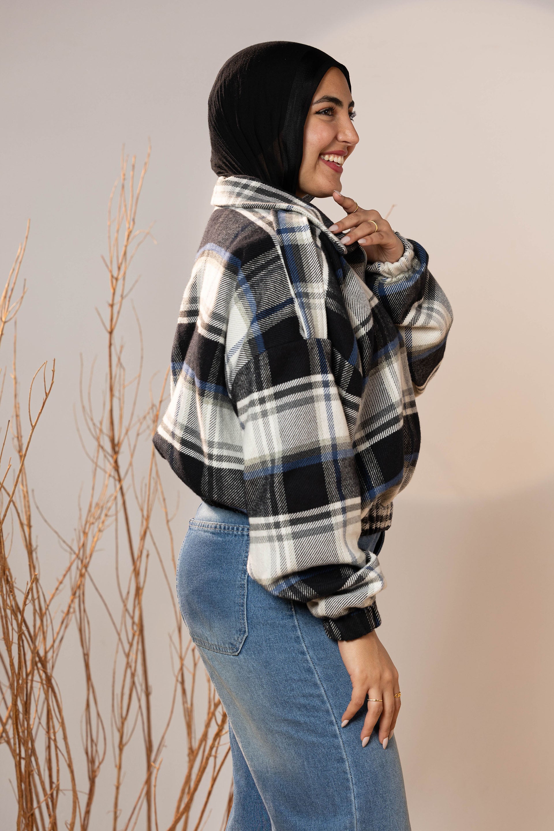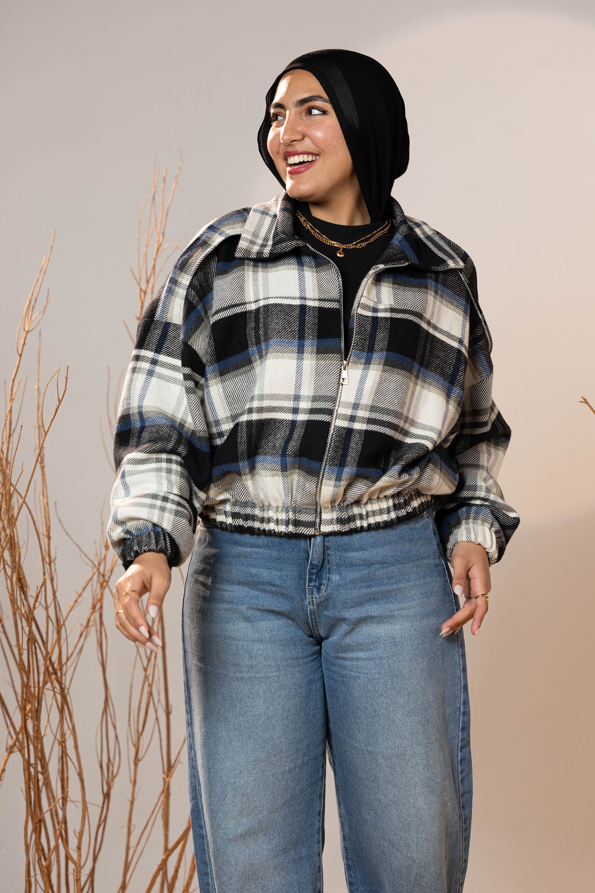 The plaid pattern mixes deep charcoal, off-white, and muted blue tones—making it a versatile winter staple that pairs beautifully with denim, basics, and winter boots. The elastic cuffs and hem create a neat shape that holds its form and adds subtle volume to the sleeves.