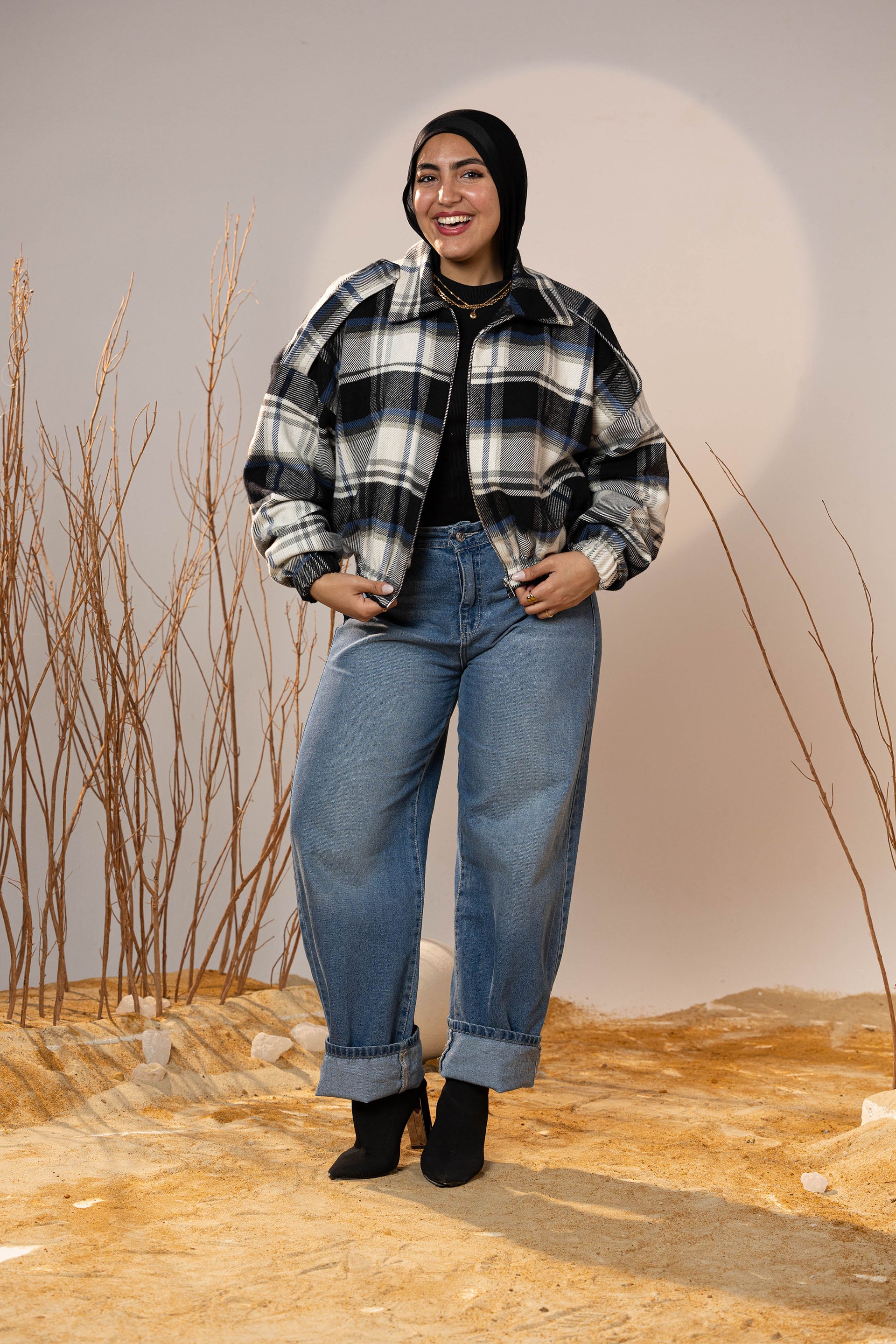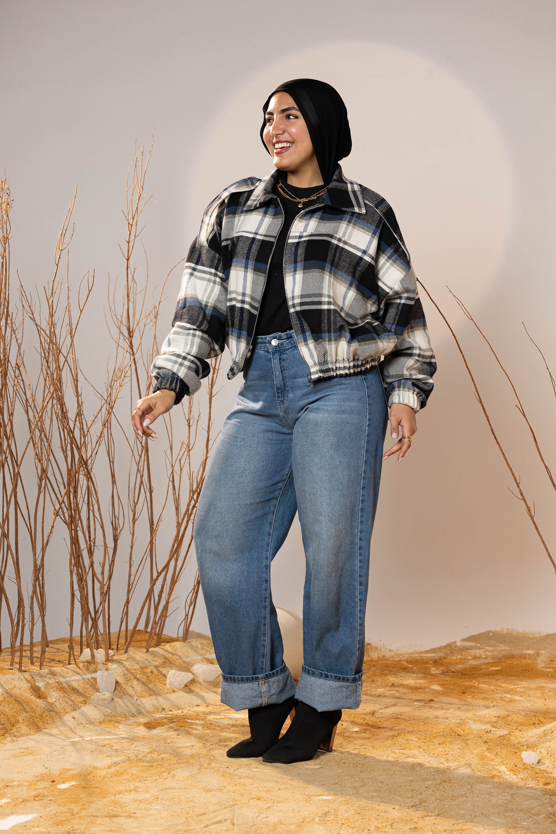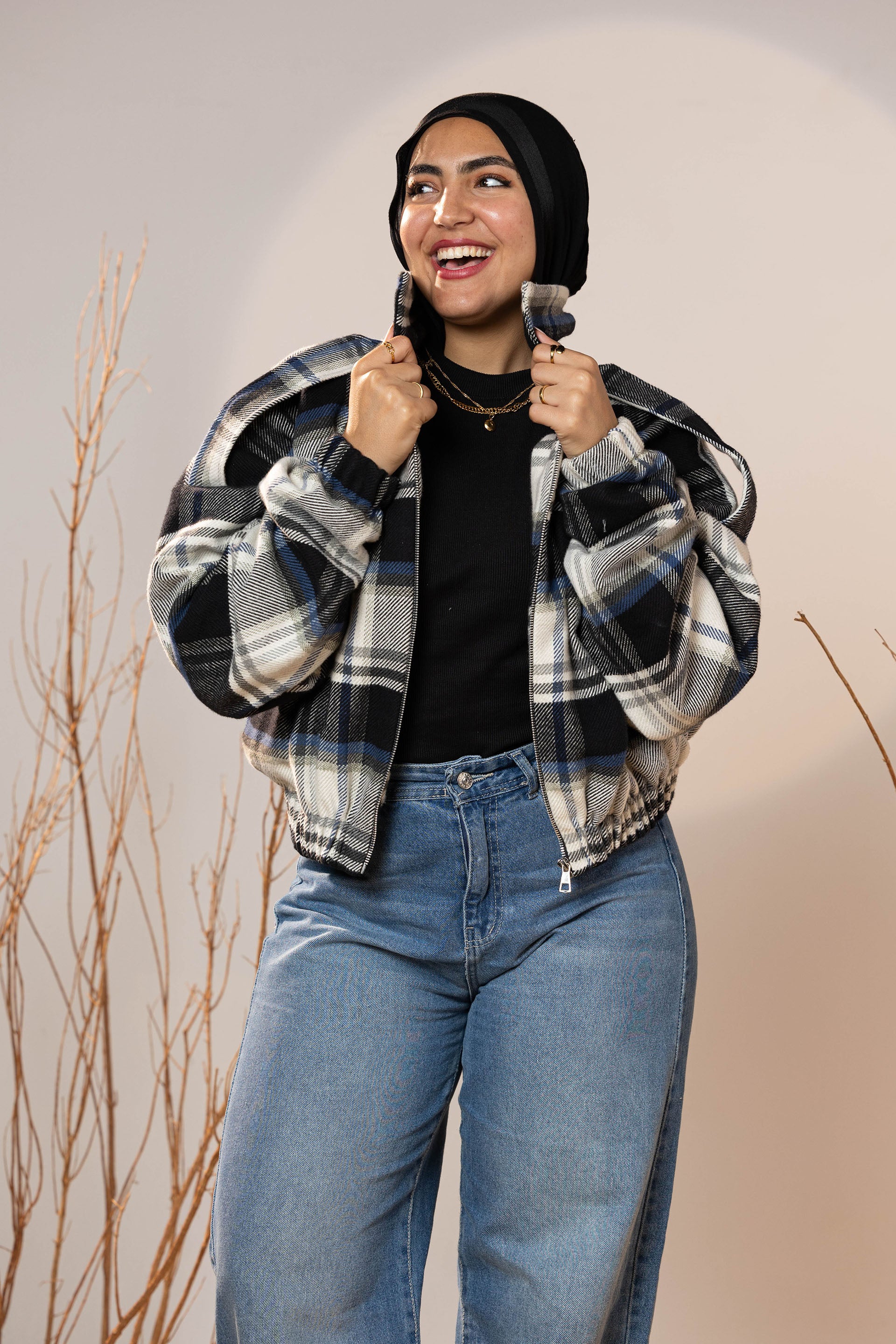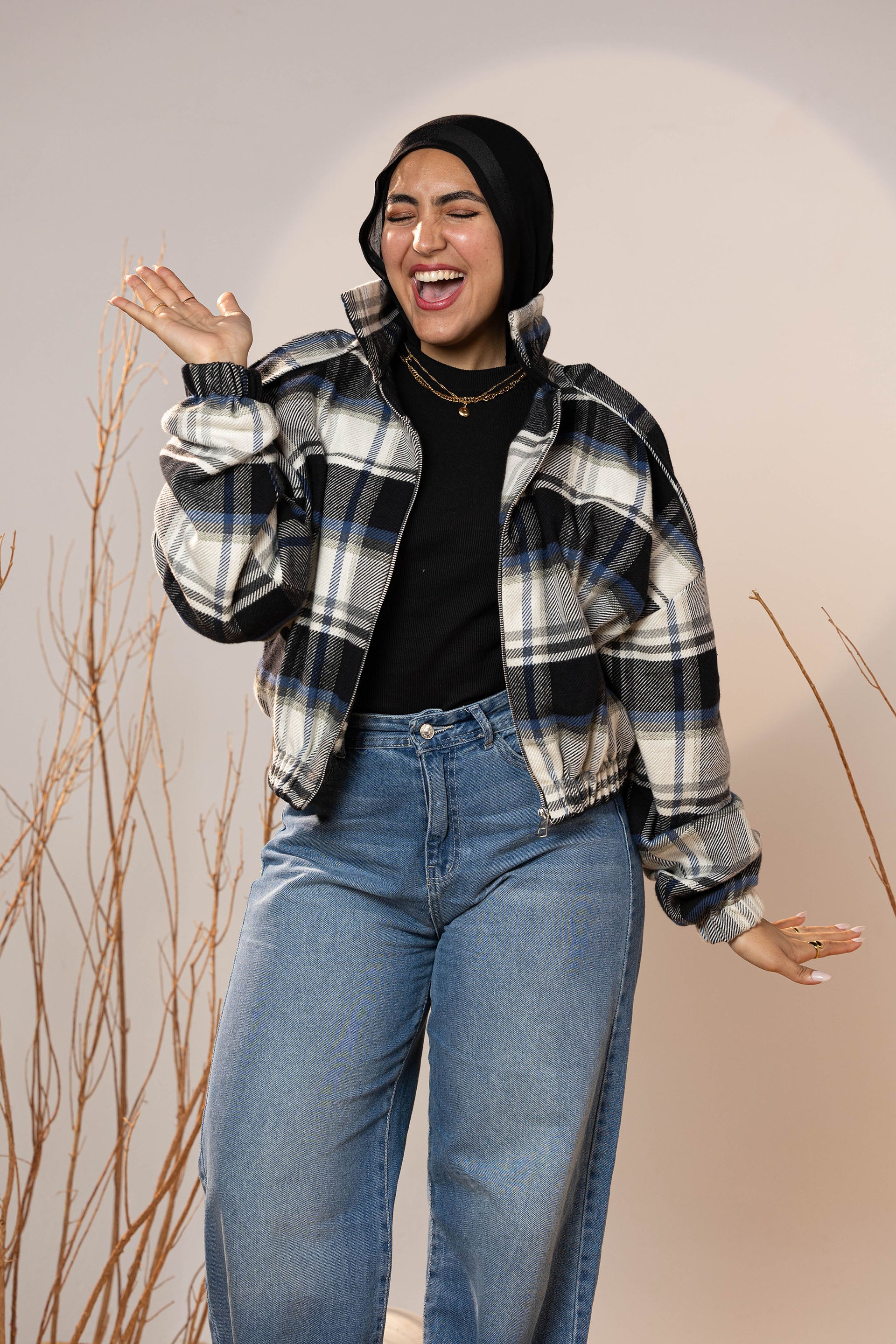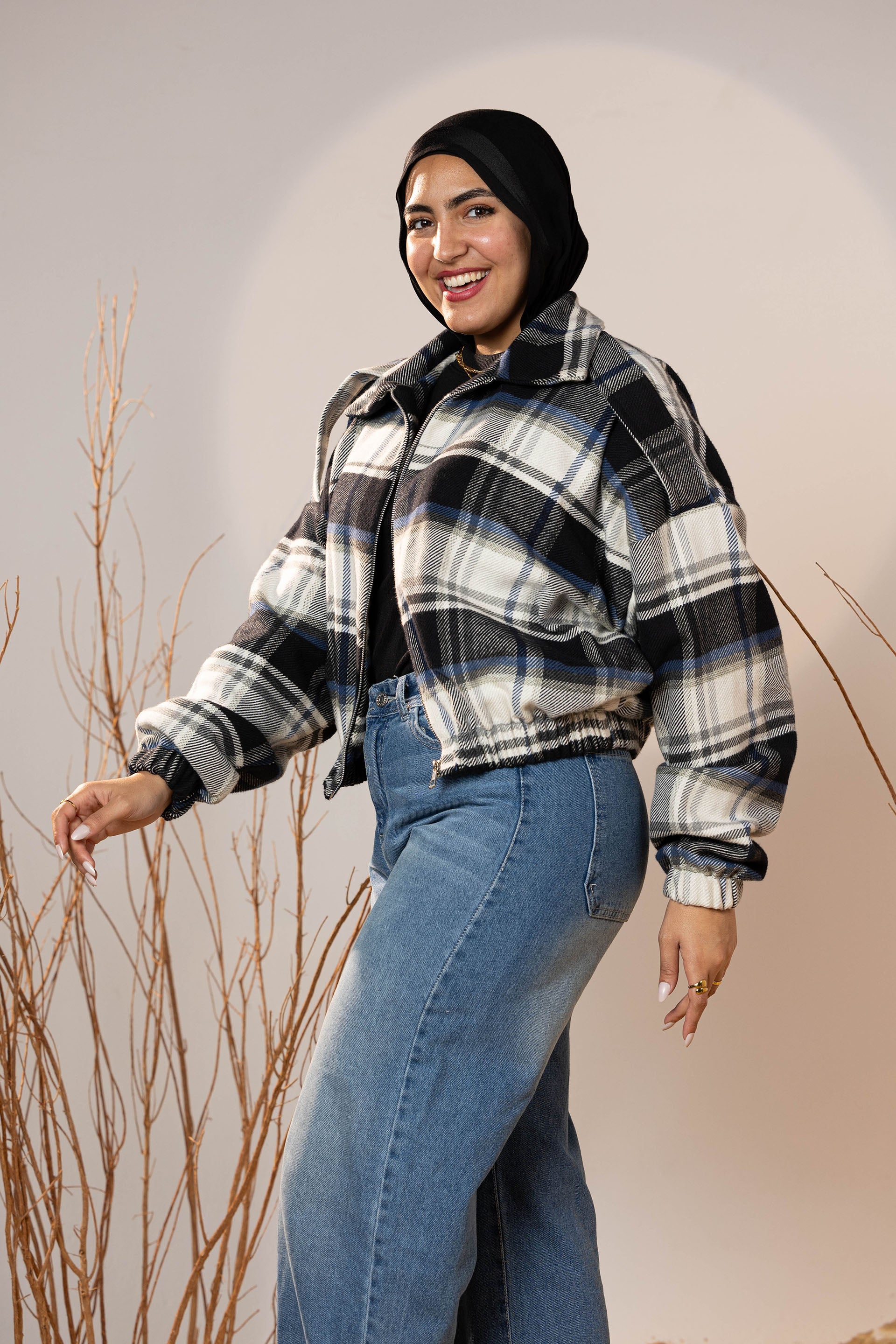 The plaid pattern mixes deep charcoal, off-white, and muted blue tones—making it a versatile winter staple that pairs beautifully with denim, basics, and winter boots. The elastic cuffs and hem create a neat shape that holds its form and adds subtle volume to the sleeves.