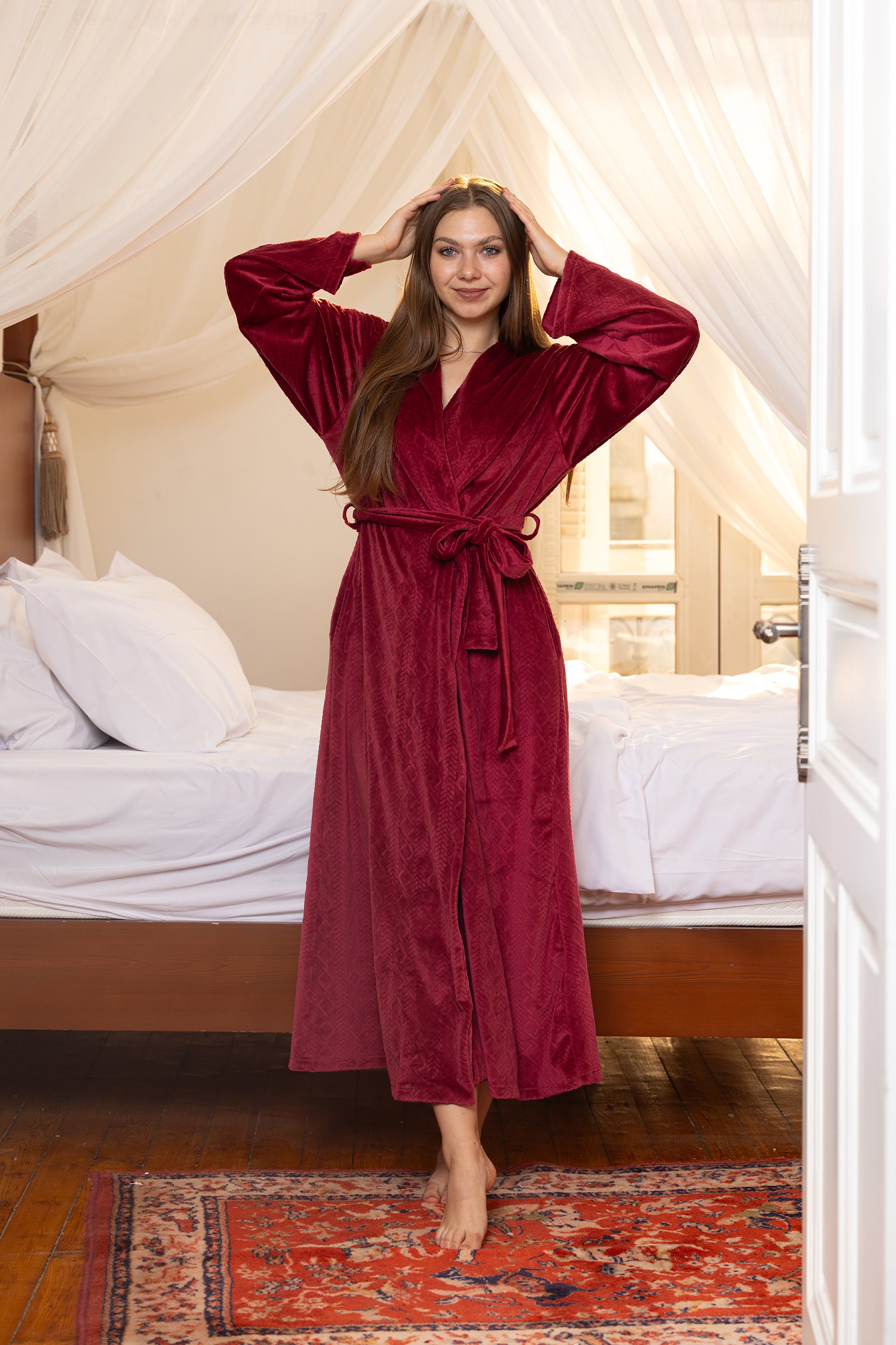 The Red Velvet Robe brings warmth and sophistication to your cozy moments. Crafted from ultra-soft velvety fabric, it drapes effortlessly with a self-tie belt for the perfect wrap fit. Its deep red hue captures the spirit of winter evenings — elegant, timeless, and made to make every night feel special.