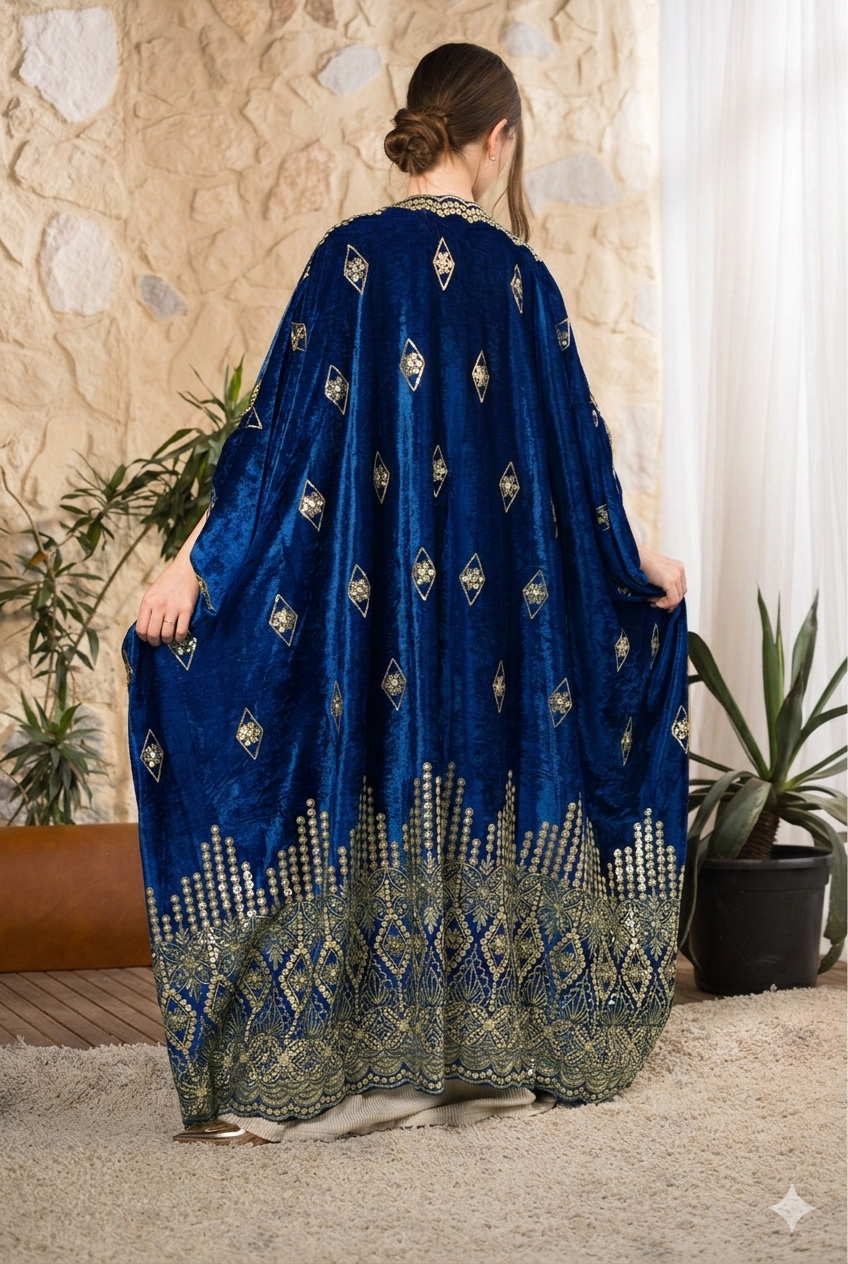 Step into refined elegance with the Royal Heritage Velvet Abaya, a statement piece designed for sophisticated gatherings and timeless occasions. Crafted from luxurious deep-purple velvet with a soft luminous finish, this abaya drapes beautifully to create a regal and flowing silhouette. The intricate gold embroidery along the hemline and sleeves highlights exceptional craftsmanship, inspired by heritage motifs with a modern interpretation. Delicate embroidered diamond accents are distributed across the body, adding texture and subtle shimmer without overwhelming the design. Designed in a relaxed open-front silhouette, this abaya offers effortless layering over dresses or tailored sets, combining modesty with elevated presence. Created as a free-size piece, it flatters multiple body shapes while maintaining its graceful structure and dramatic movement. Designed and tailored in Egypt to celebrate inclusivity, craftsmanship, and timeless sophistication.