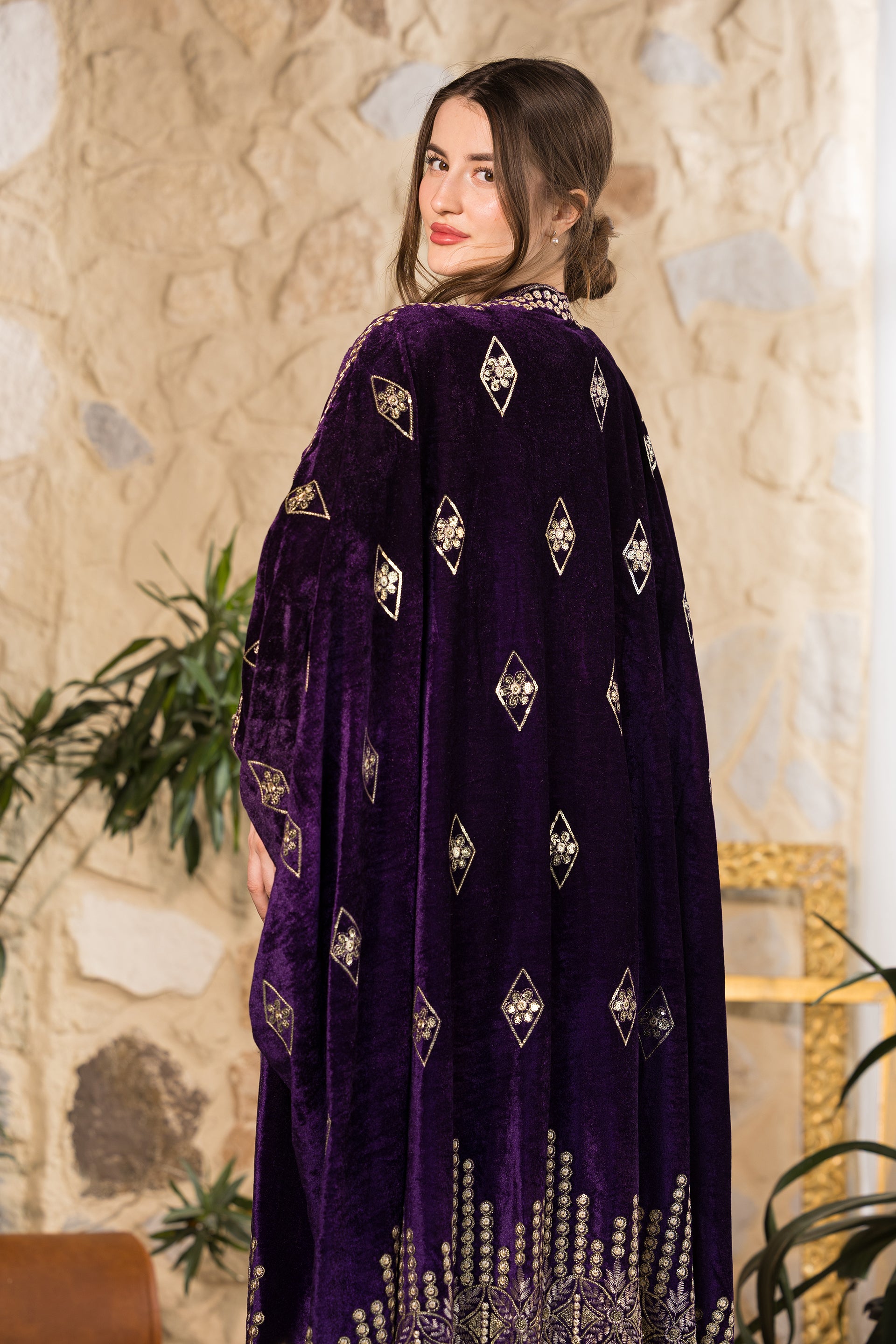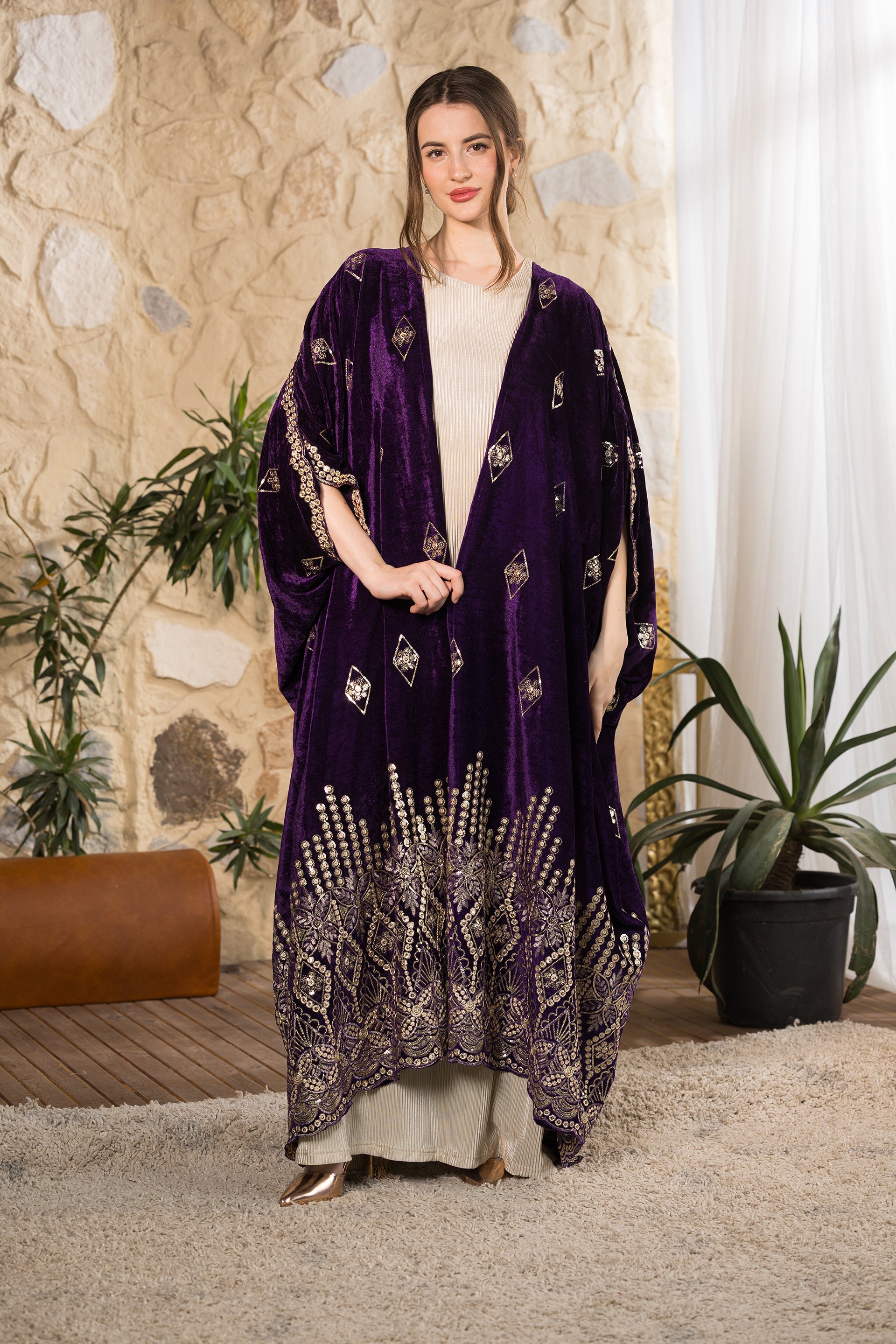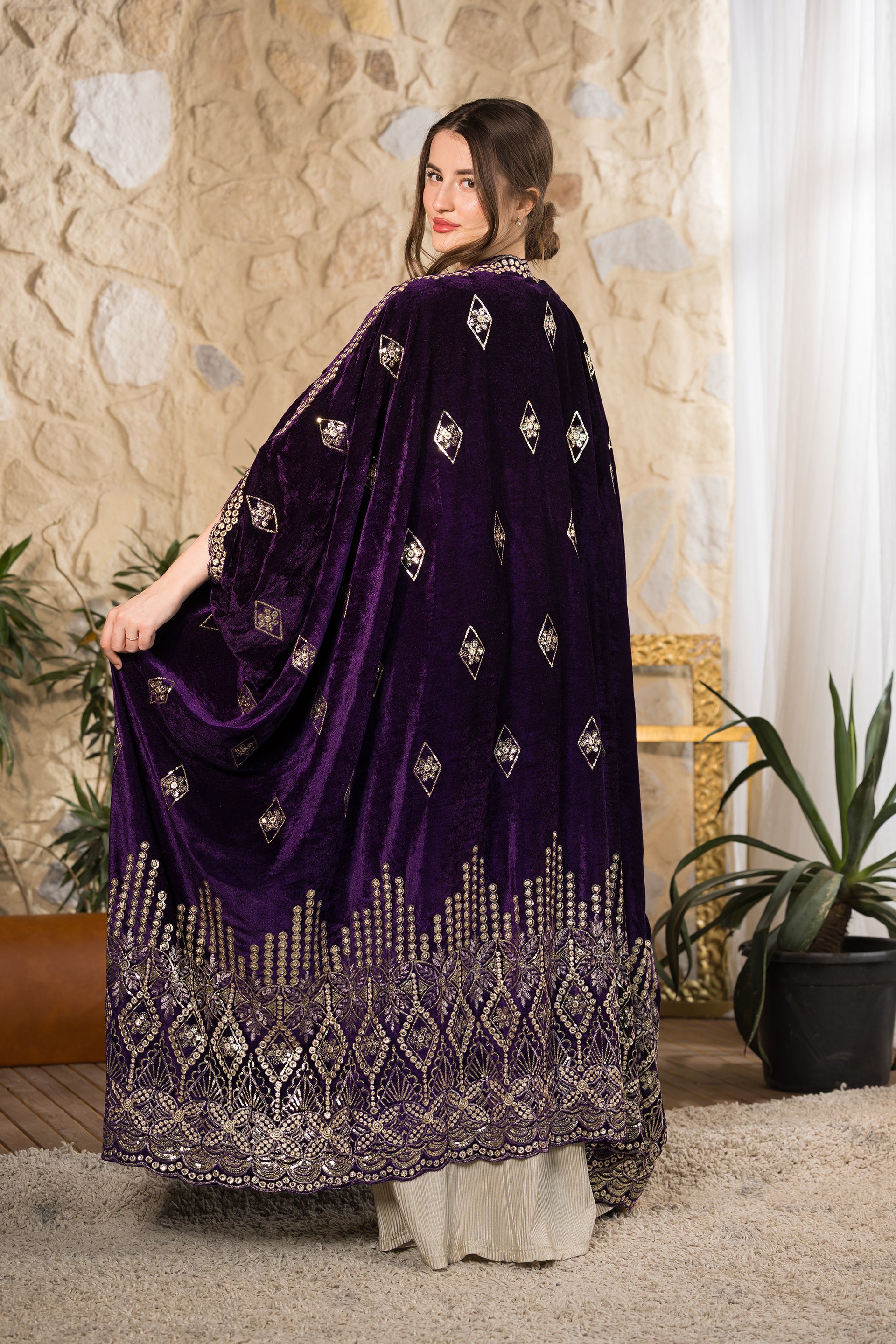 Step into refined elegance with the Royal Heritage Velvet Abaya, a statement piece designed for sophisticated gatherings and timeless occasions. Crafted from luxurious deep-purple velvet with a soft luminous finish, this abaya drapes beautifully to create a regal and flowing silhouette. The intricate gold embroidery along the hemline and sleeves highlights exceptional craftsmanship, inspired by heritage motifs with a modern interpretation. Delicate embroidered diamond accents are distributed across the body, adding texture and subtle shimmer without overwhelming the design. Designed in a relaxed open-front silhouette, this abaya offers effortless layering over dresses or tailored sets, combining modesty with elevated presence. Created as a free-size piece, it flatters multiple body shapes while maintaining its graceful structure and dramatic movement. Designed and tailored in Egypt to celebrate inclusivity, craftsmanship, and timeless sophistication.