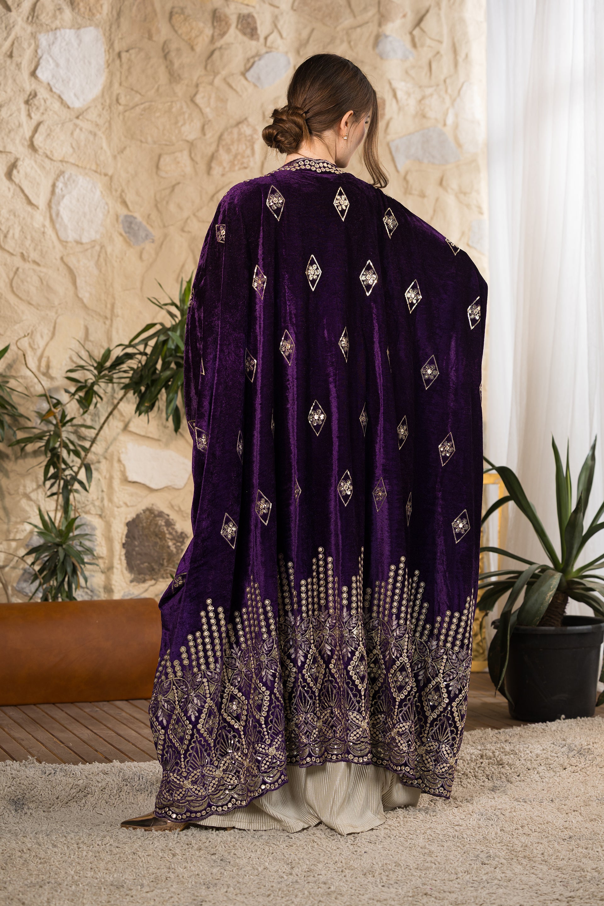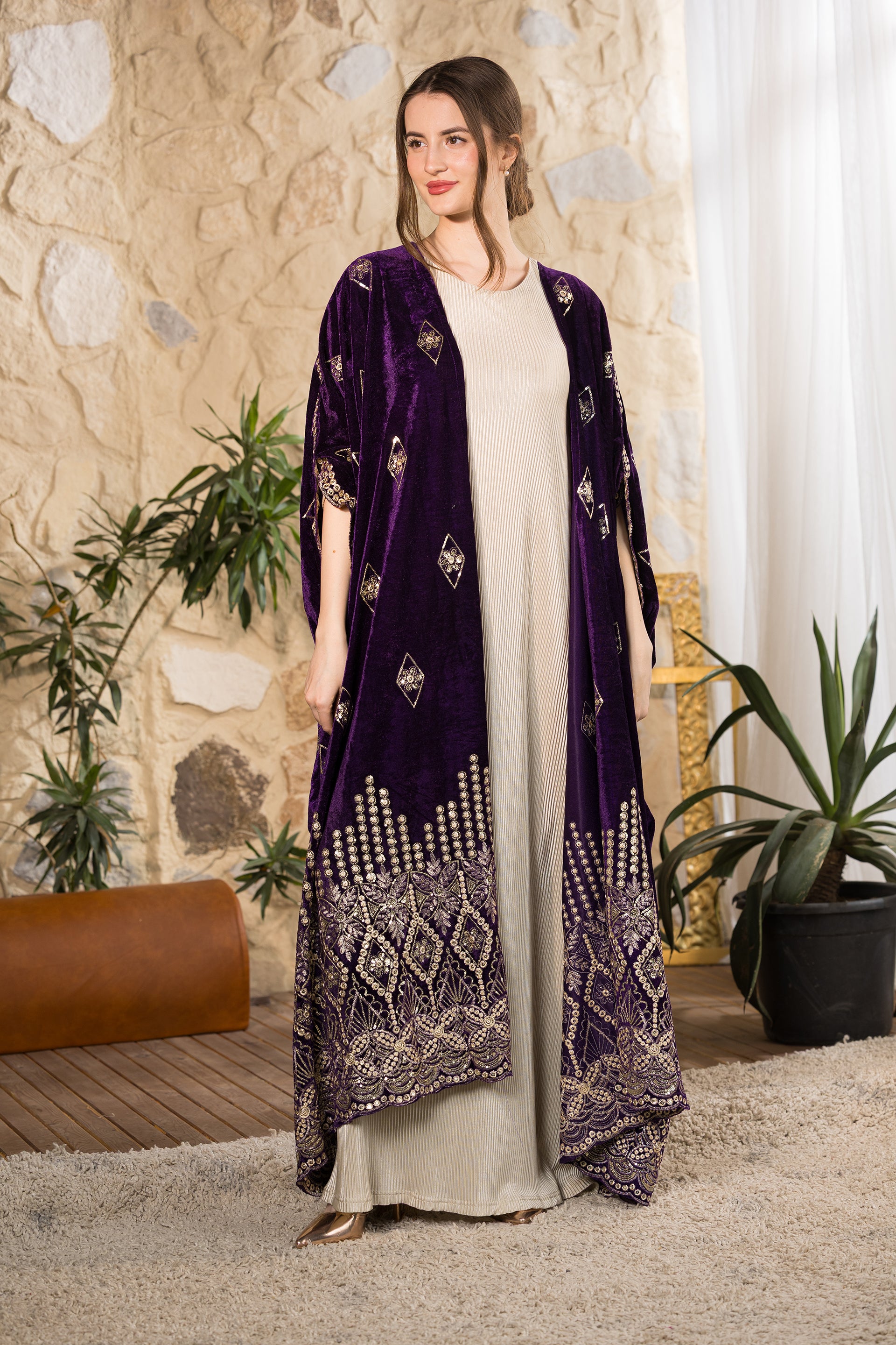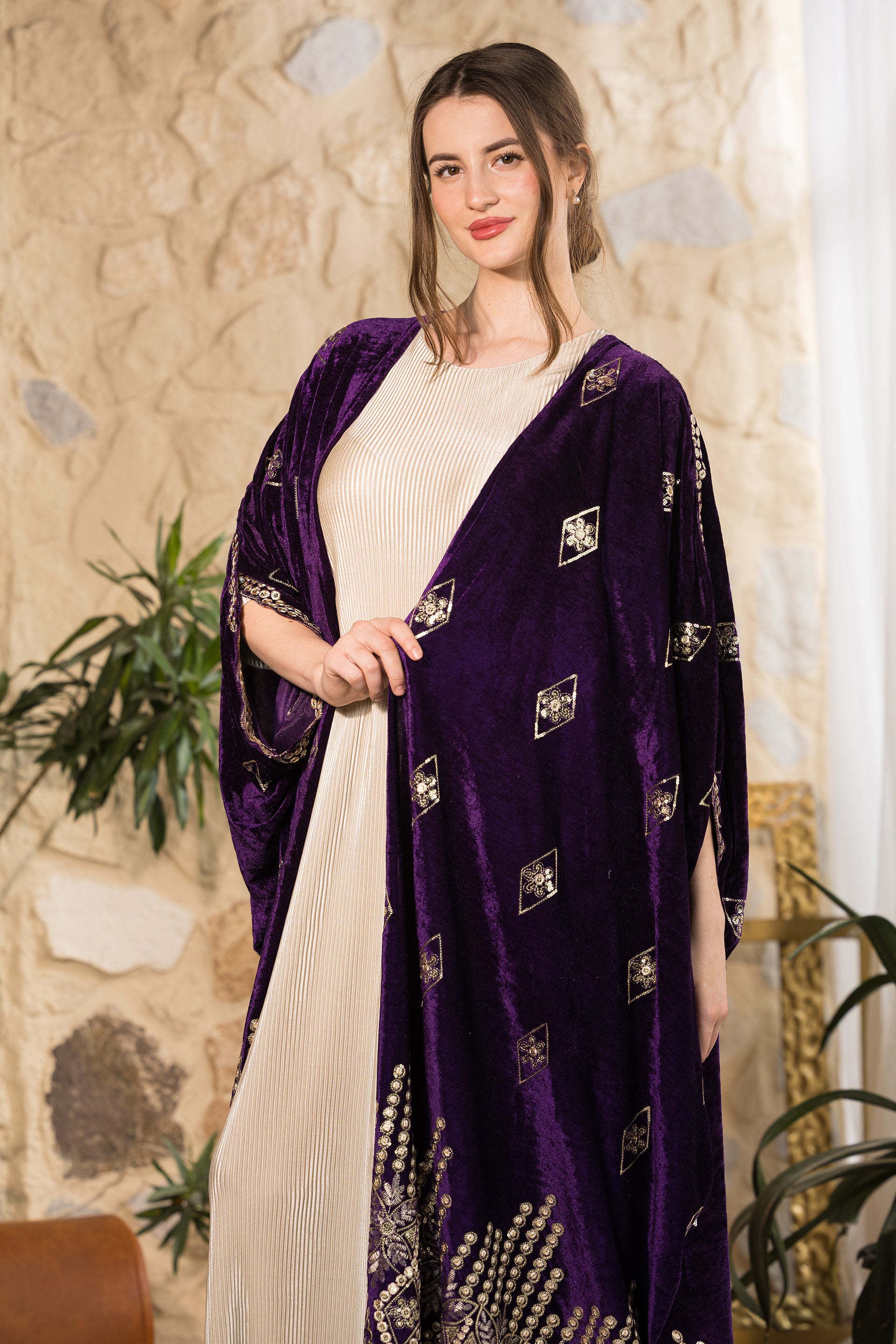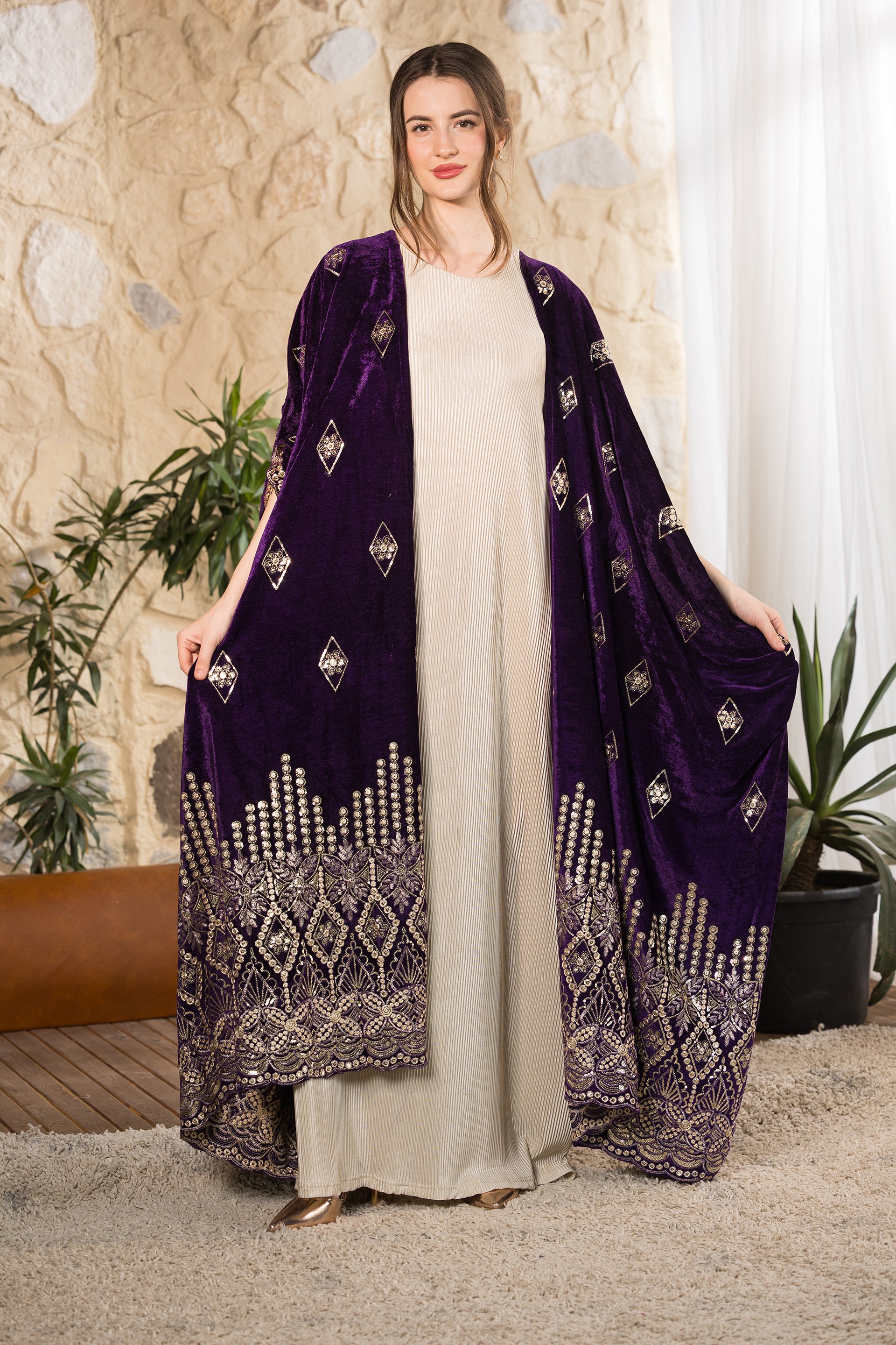 Step into refined elegance with the Royal Heritage Velvet Abaya, a statement piece designed for sophisticated gatherings and timeless occasions. Crafted from luxurious deep-purple velvet with a soft luminous finish, this abaya drapes beautifully to create a regal and flowing silhouette. The intricate gold embroidery along the hemline and sleeves highlights exceptional craftsmanship, inspired by heritage motifs with a modern interpretation. Delicate embroidered diamond accents are distributed across the body, adding texture and subtle shimmer without overwhelming the design. Designed in a relaxed open-front silhouette, this abaya offers effortless layering over dresses or tailored sets, combining modesty with elevated presence. Created as a free-size piece, it flatters multiple body shapes while maintaining its graceful structure and dramatic movement. Designed and tailored in Egypt to celebrate inclusivity, craftsmanship, and timeless sophistication.