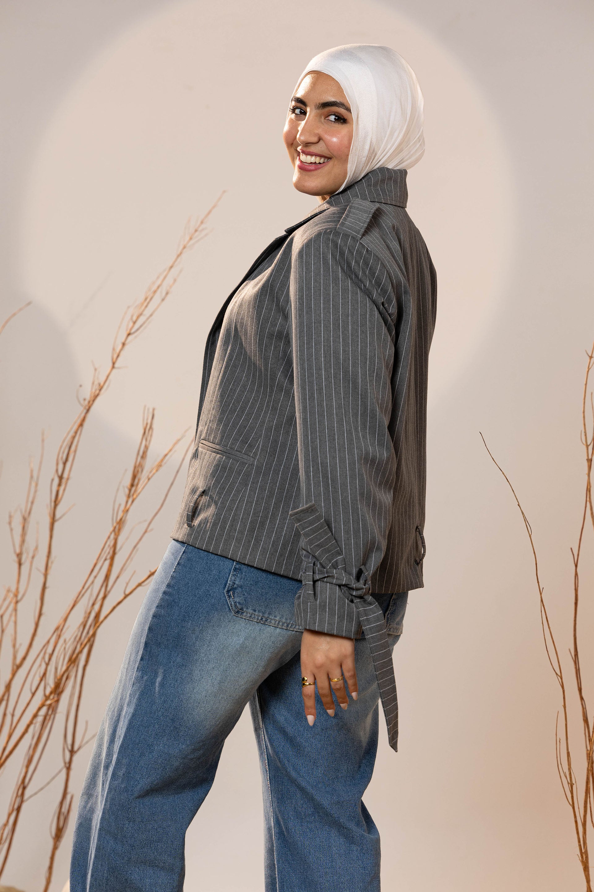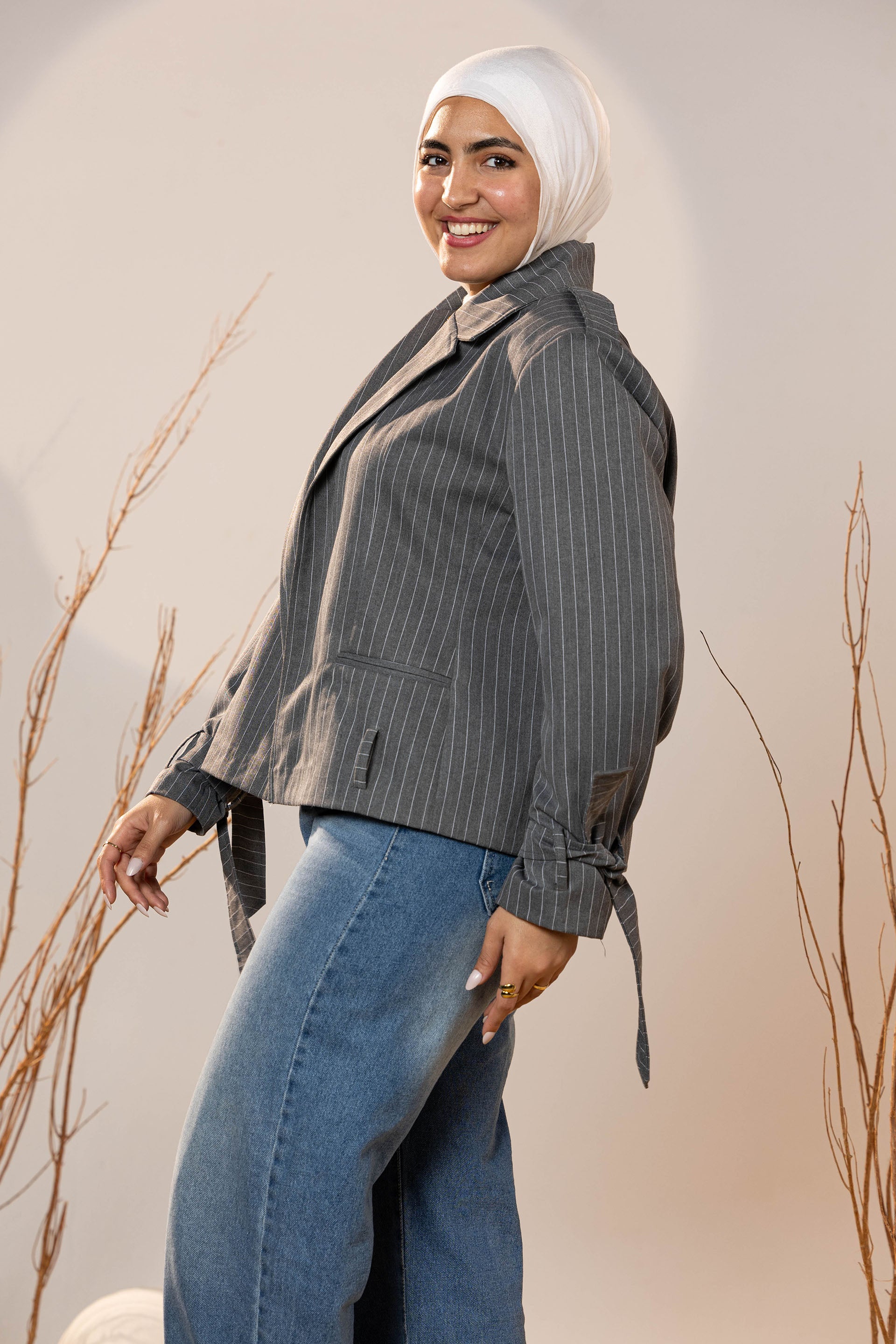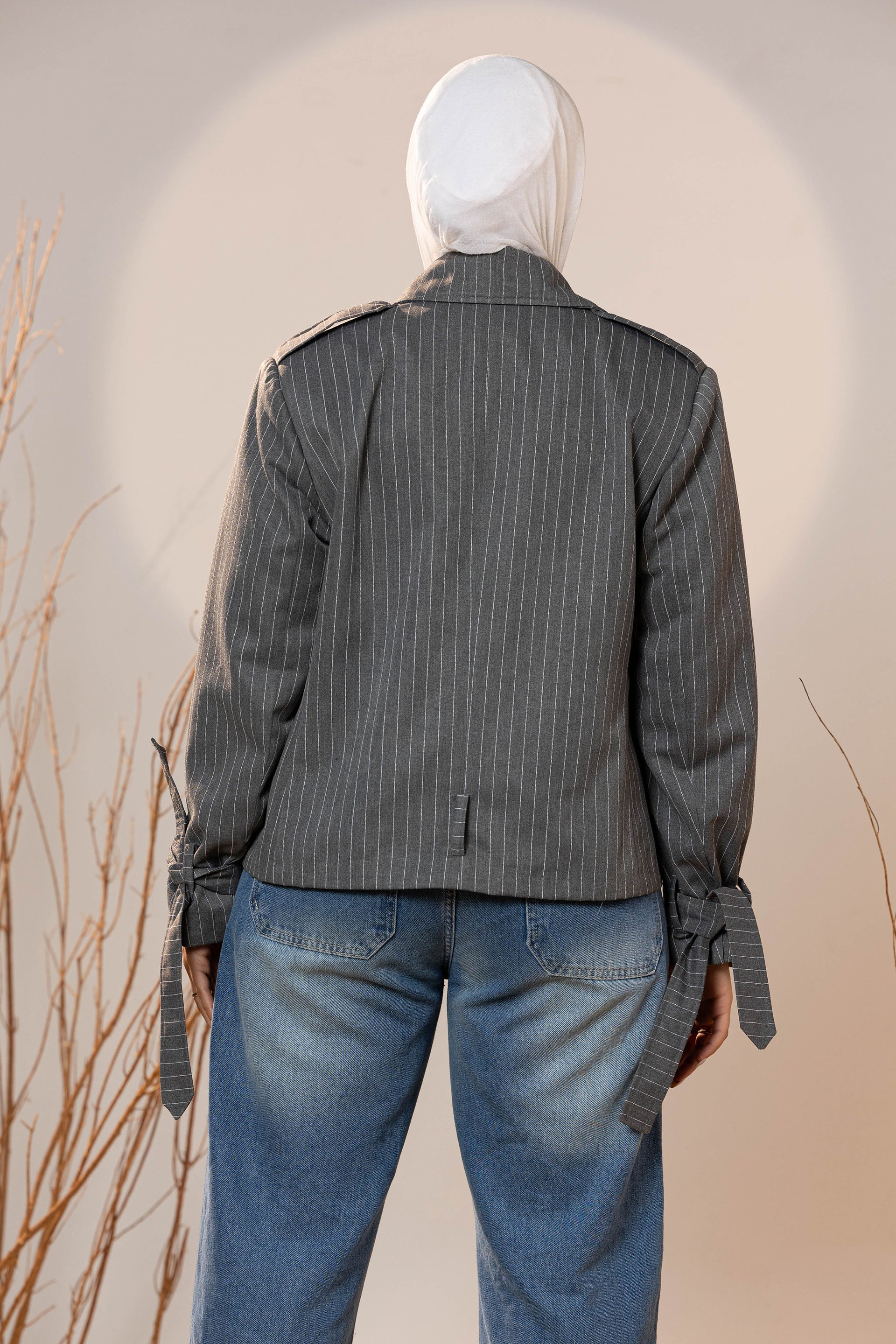 The Pinstripe Tie-Cuff Blazer brings a tailored edge with subtle feminine detailing. Designed in soft charcoal pinstripe fabric, it offers structure while remaining comfortable for all-day wear. The blazer features adjustable tie cuffs, giving a modern twist to a classic silhouette, and an optional self-belt to cinch the waist for a flattering wrap effect.