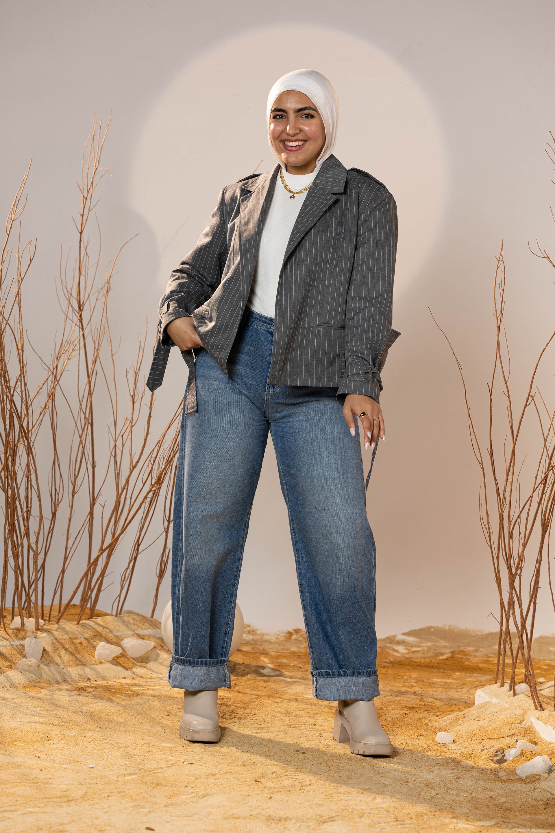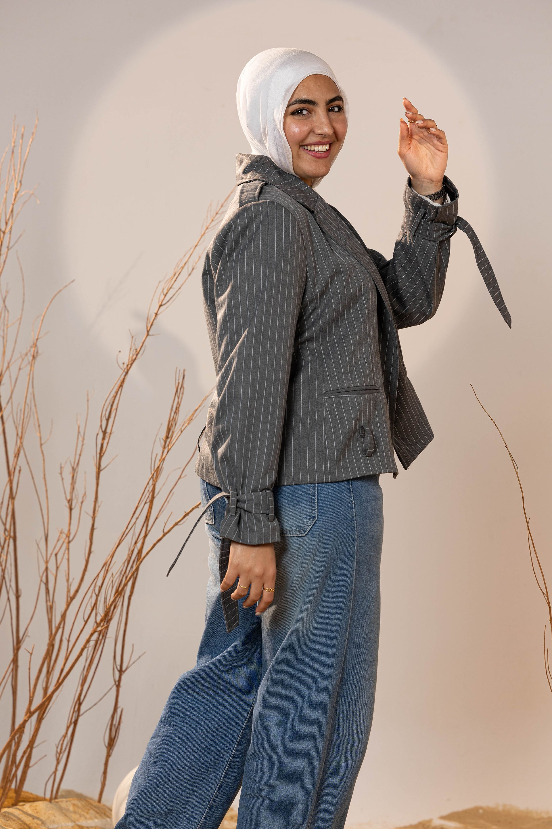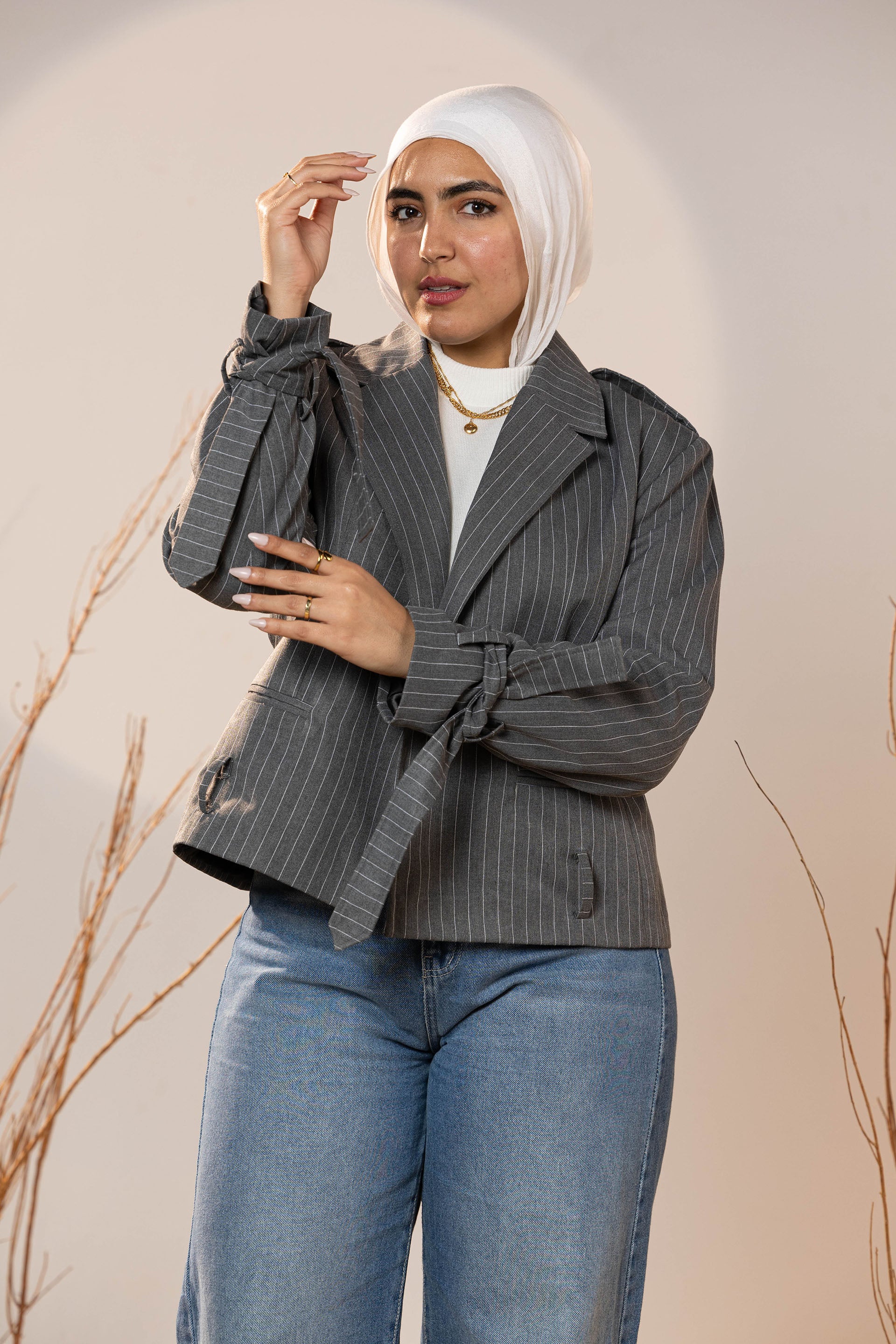 The Pinstripe Tie-Cuff Blazer brings a tailored edge with subtle feminine detailing. Designed in soft charcoal pinstripe fabric, it offers structure while remaining comfortable for all-day wear. The blazer features adjustable tie cuffs, giving a modern twist to a classic silhouette, and an optional self-belt to cinch the waist for a flattering wrap effect.