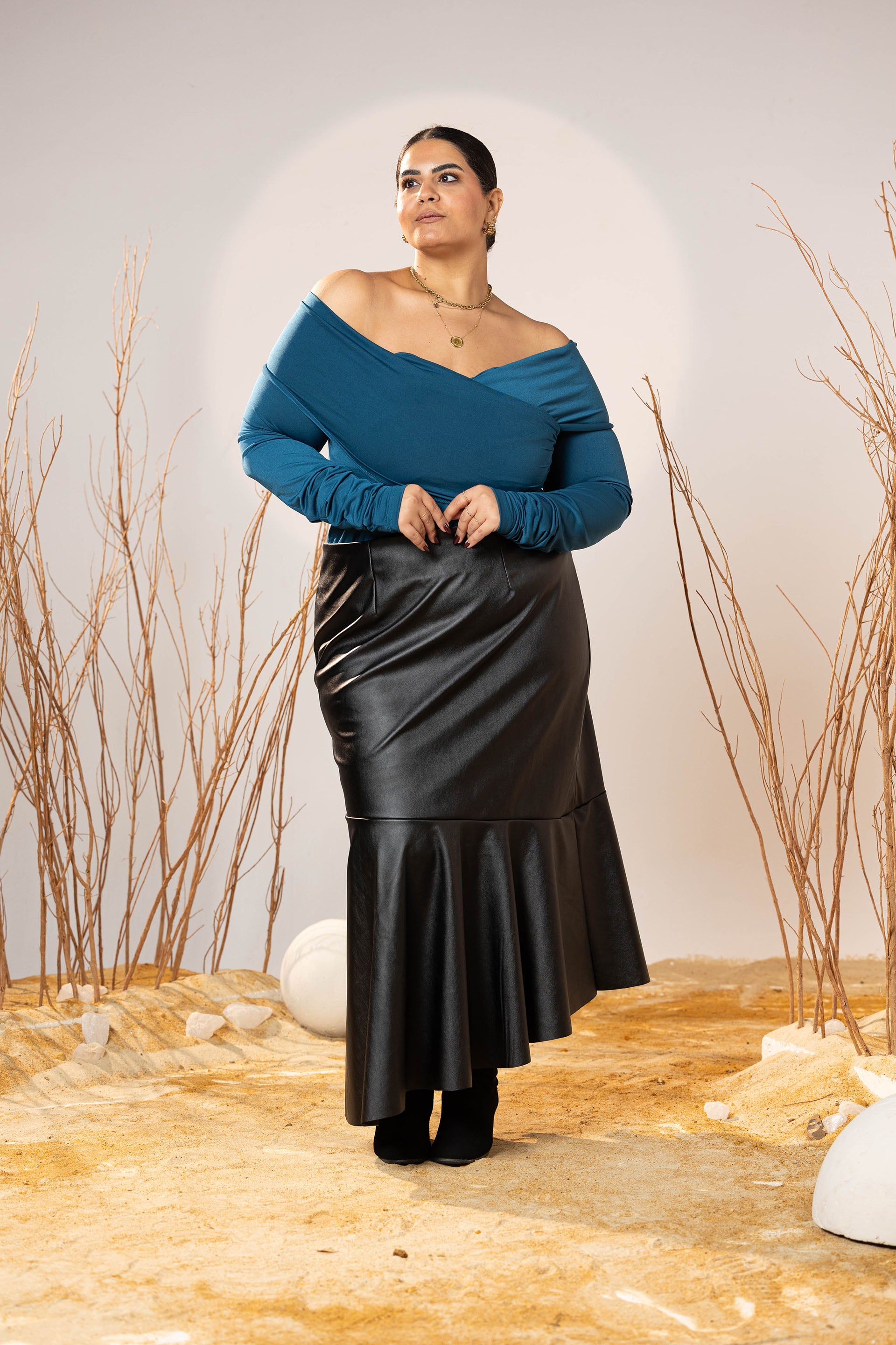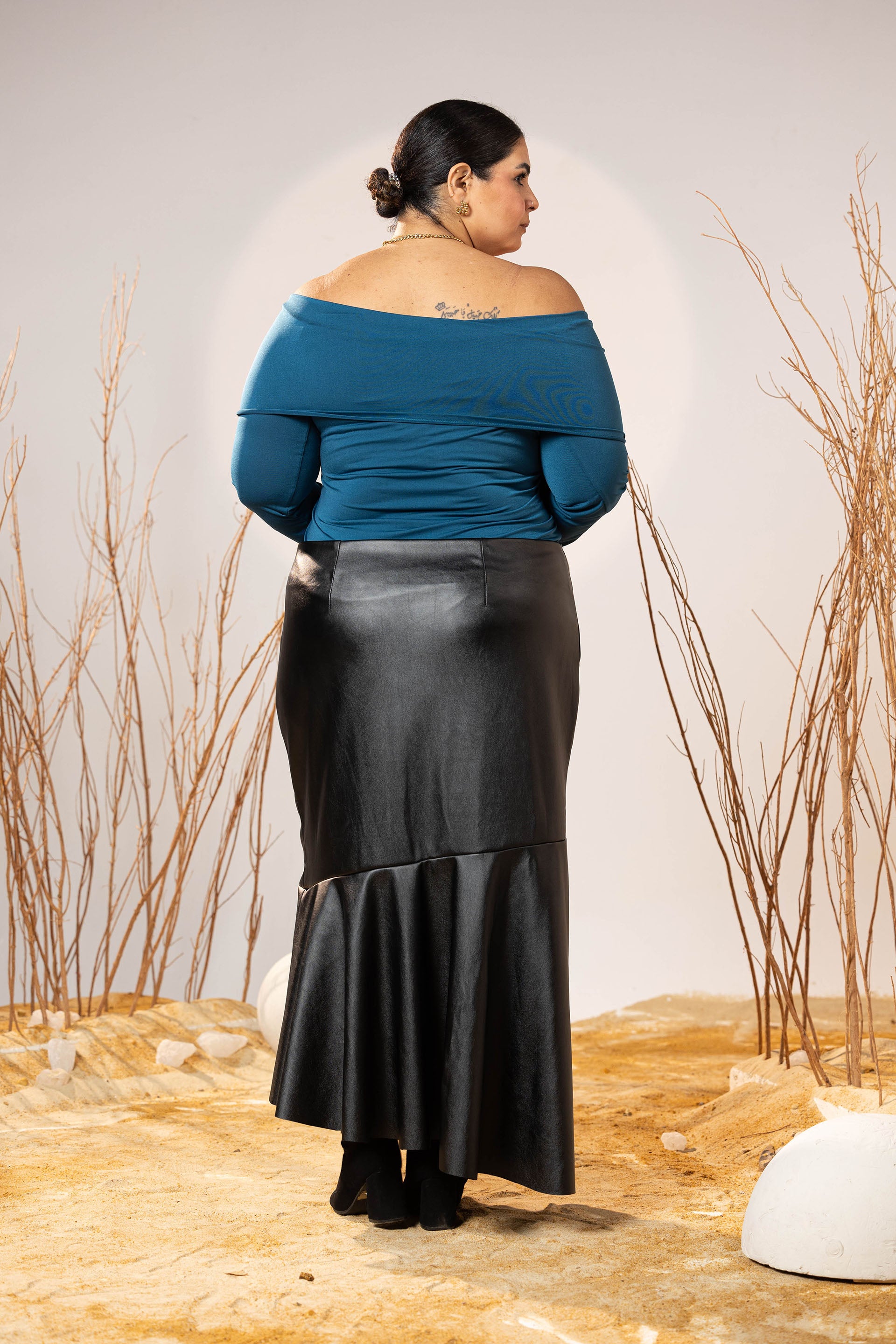 Complete the look with the Black Faux Leather Flared Pleated Skirt, designed to create a structured yet fluid silhouette. The top half has a sleek straight fit that elongates the body, while the lower panel opens into a soft flare for elegant movement.