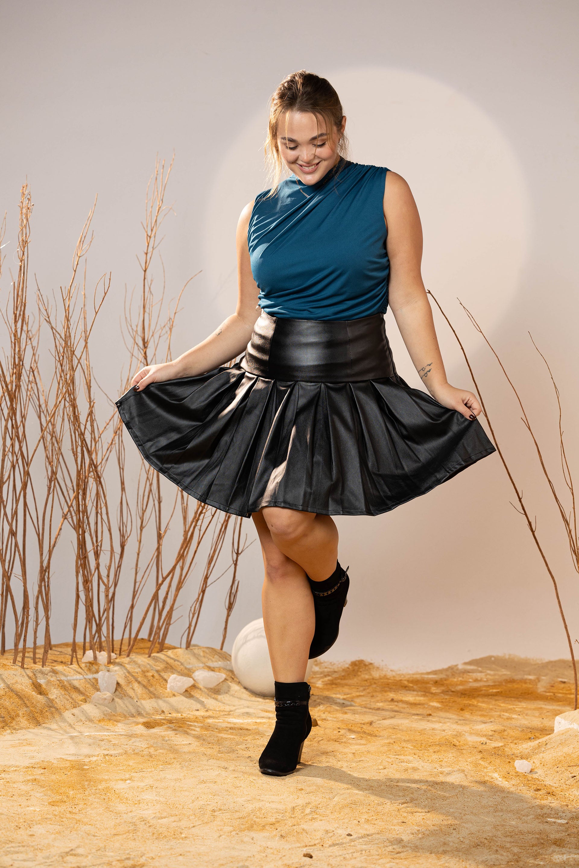 Step into a chic winter look with the Black Pleated Leather Mini Skirt, designed to add shape, movement, and attitude to your outfit. Crafted with a smooth leather-effect fabric, this skirt features structured pleats that flare beautifully, creating volume without bulk.