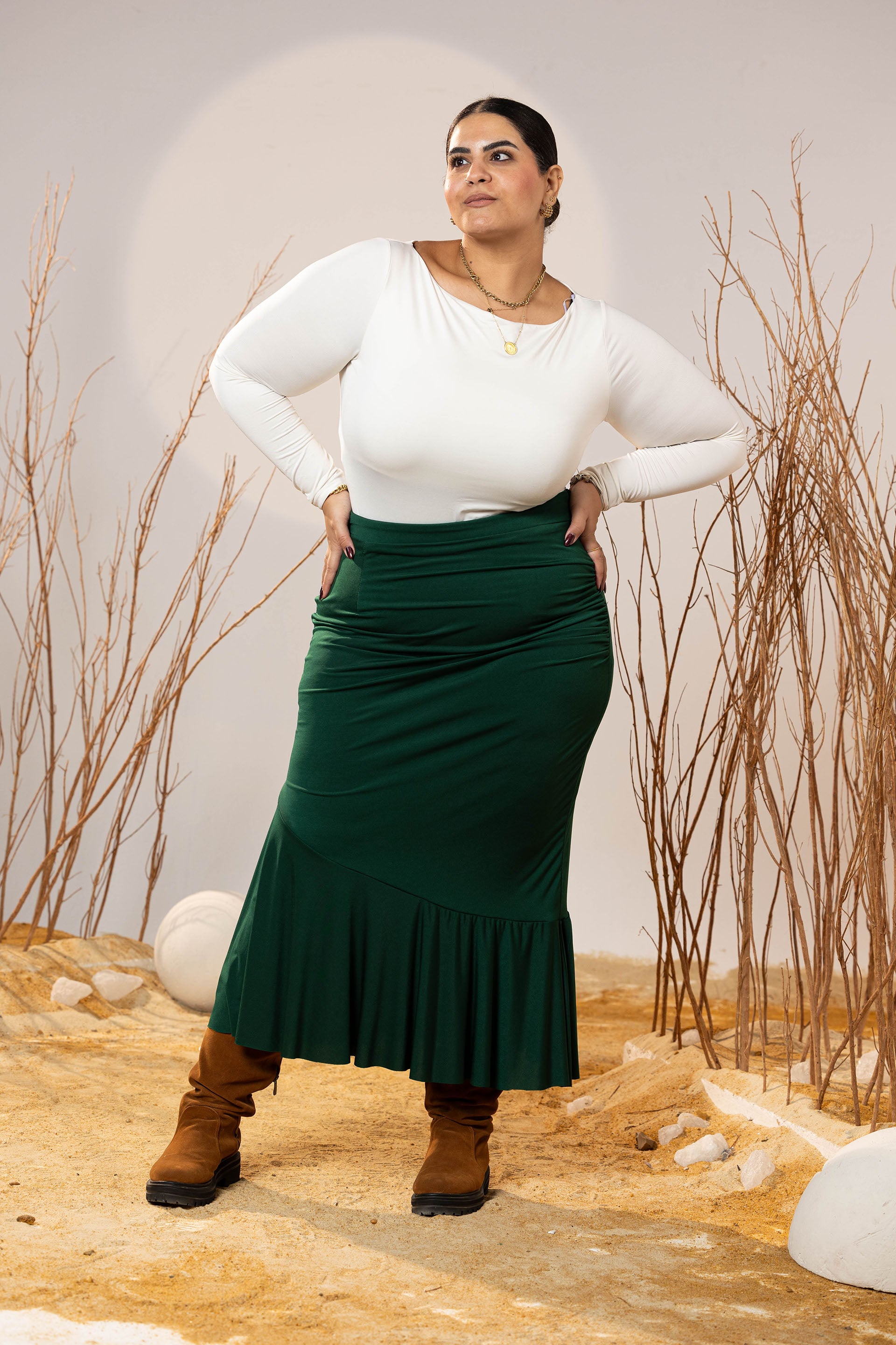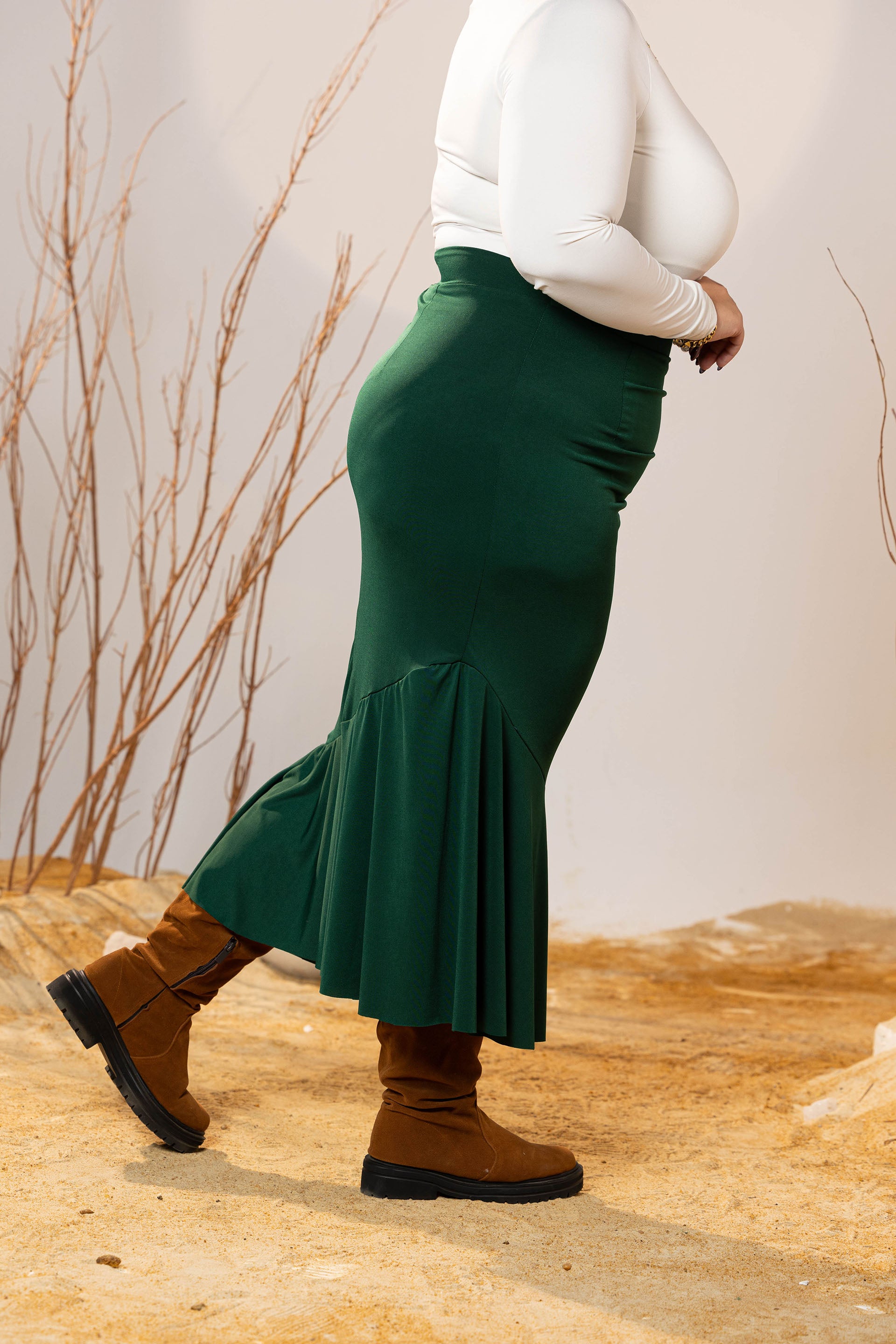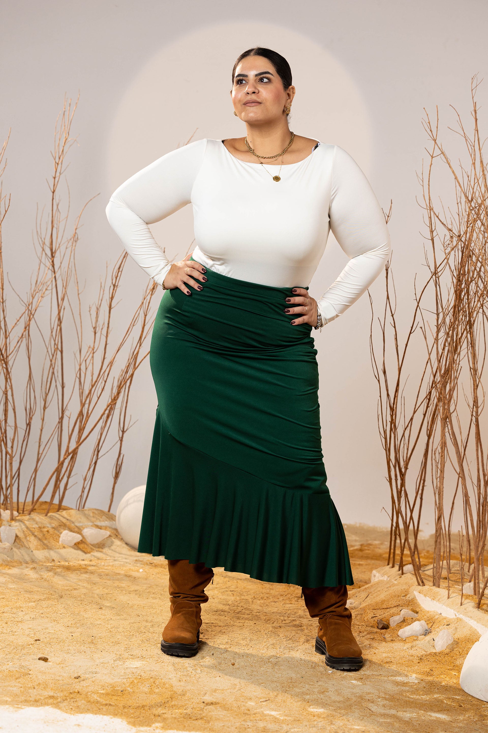 Effortless, flattering, and designed to celebrate movement—Emerald Sway Midi Skirt brings a rich jewel tone and fluid silhouette to everyday dressing. The angled panel design enhances the hip line while the flared hem gives soft flow with every step.