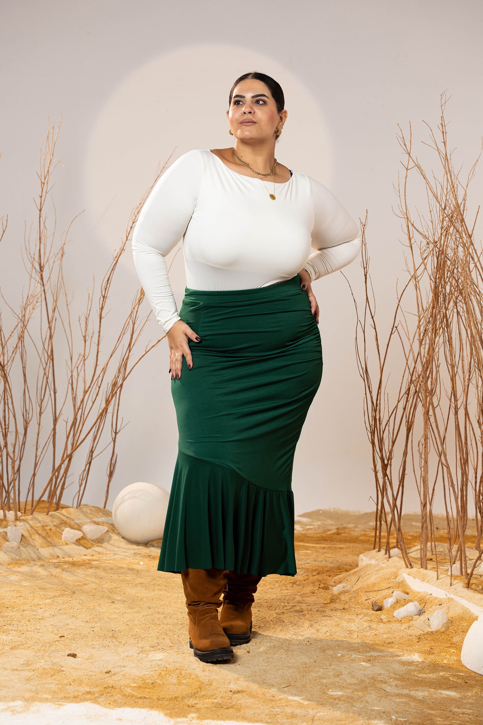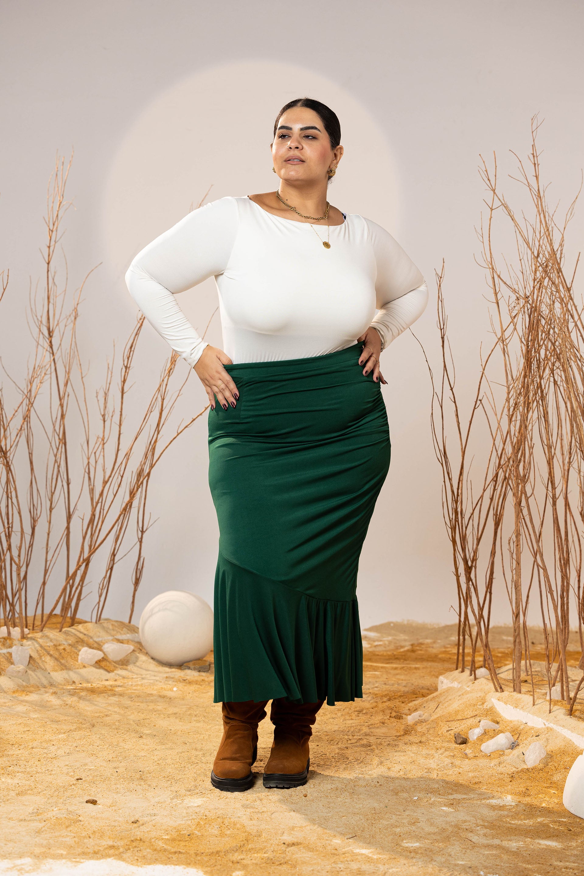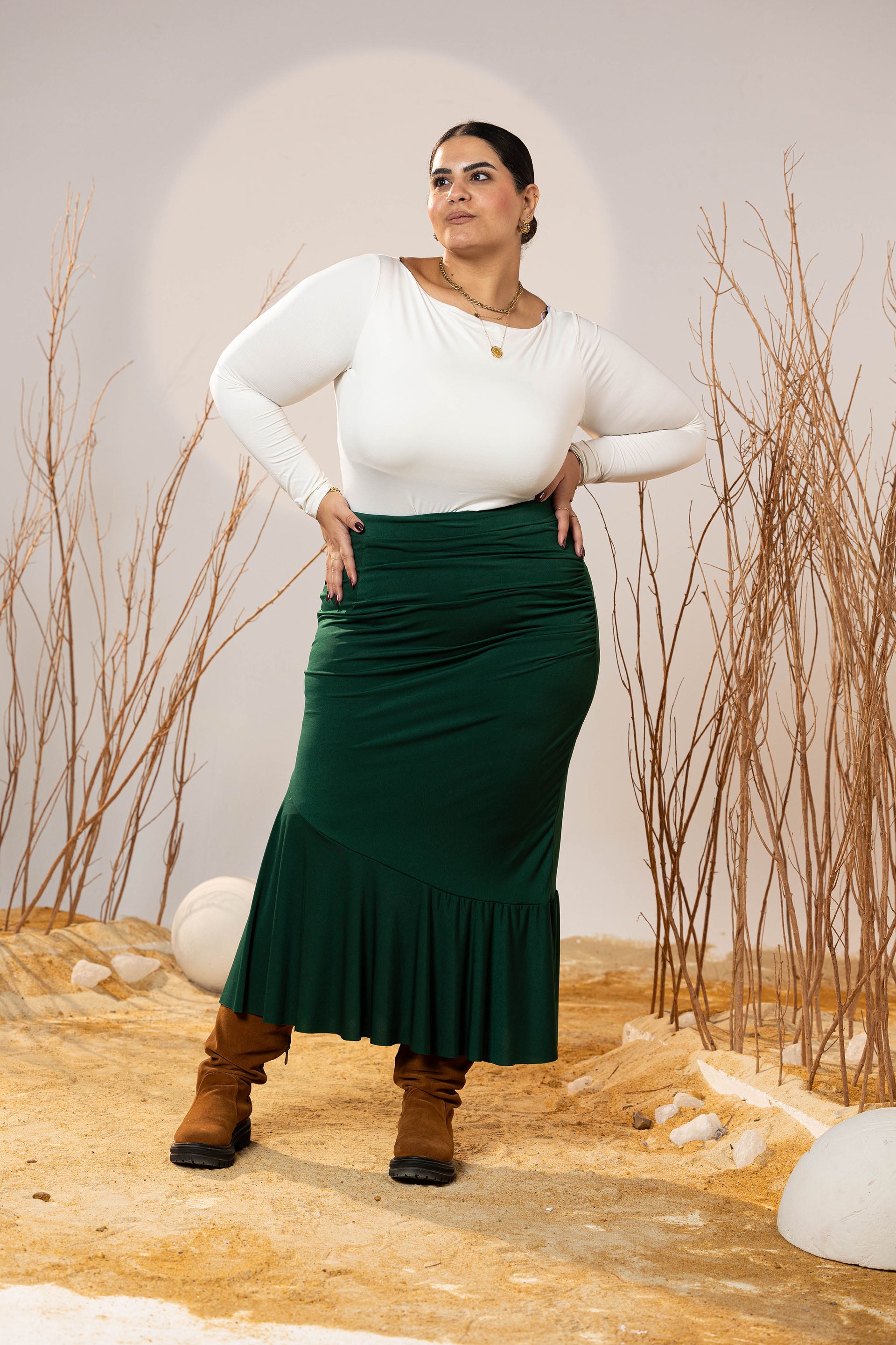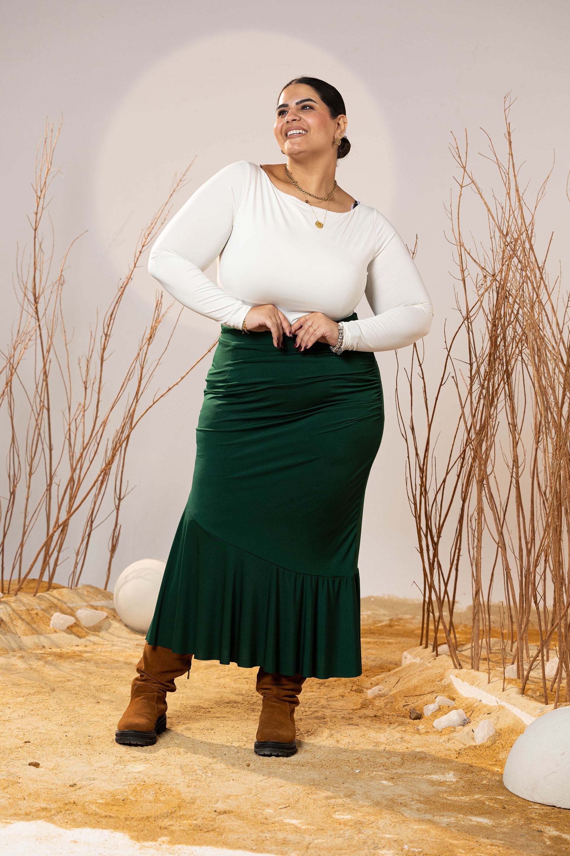 Effortless, flattering, and designed to celebrate movement—Emerald Sway Midi Skirt brings a rich jewel tone and fluid silhouette to everyday dressing. The angled panel design enhances the hip line while the flared hem gives soft flow with every step.