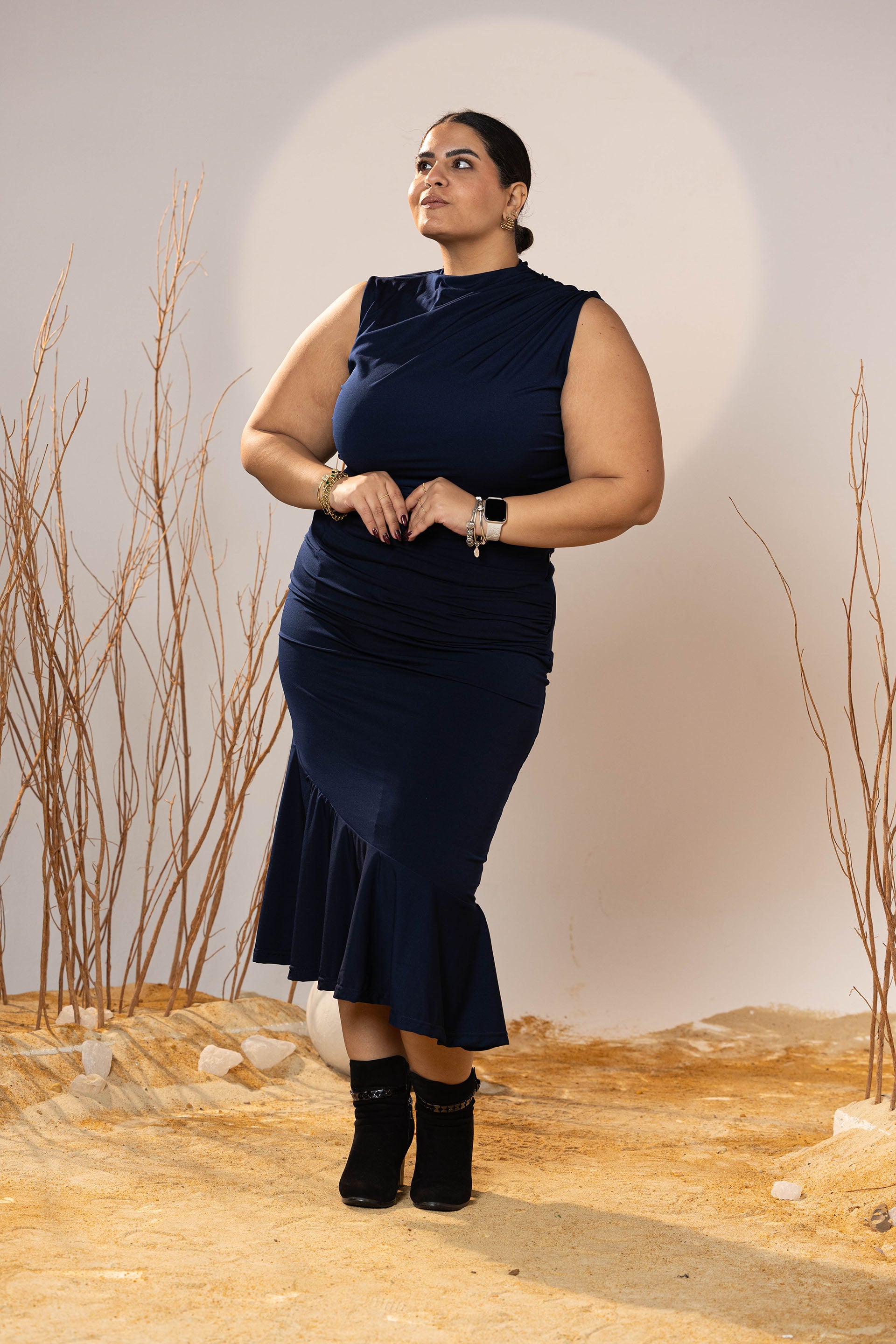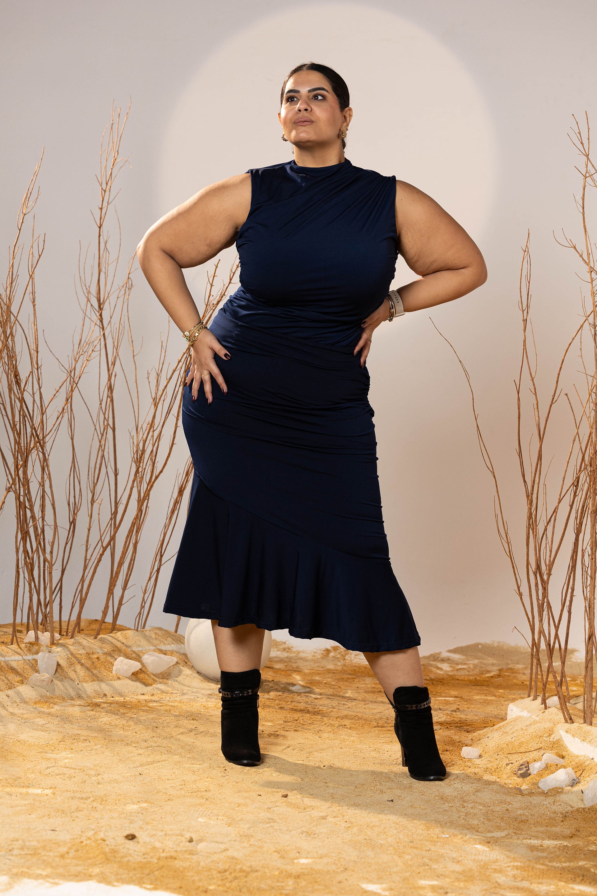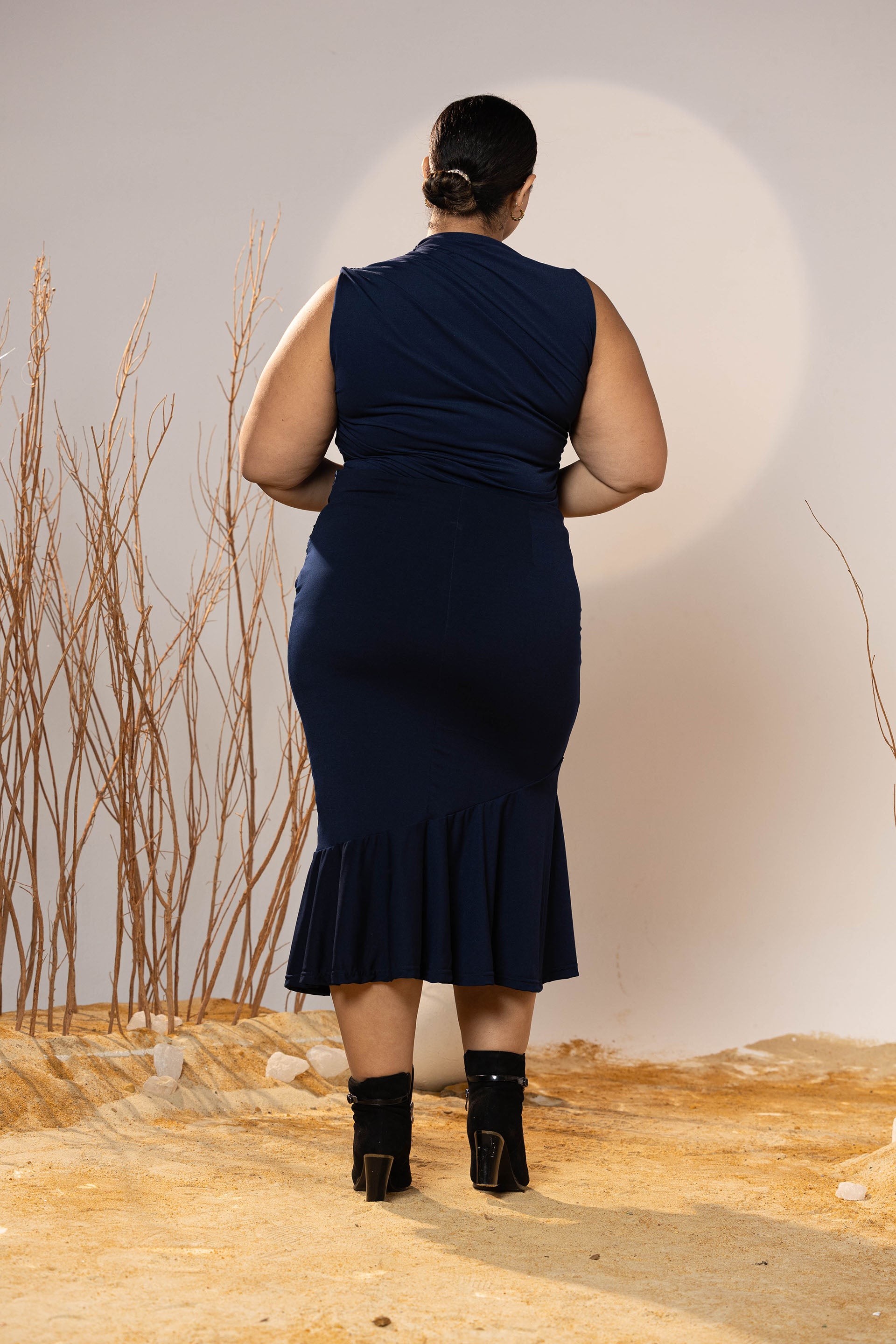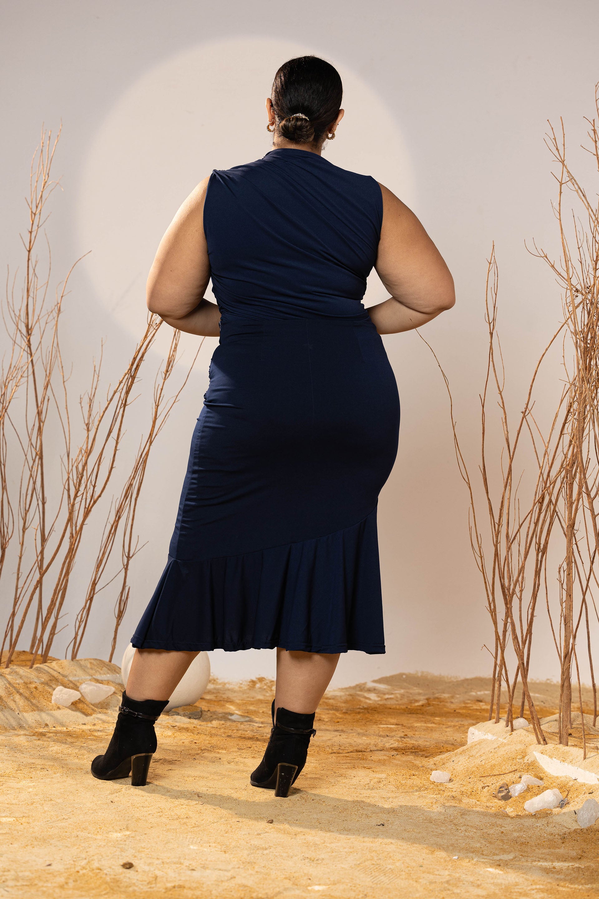Confident, sleek, and beautifully structured—the Midnight Curve Midi Skirt is designed to skim the body while creating definition through subtle draping. The flared finish adds balance, making it flattering across all sizes and heights.
