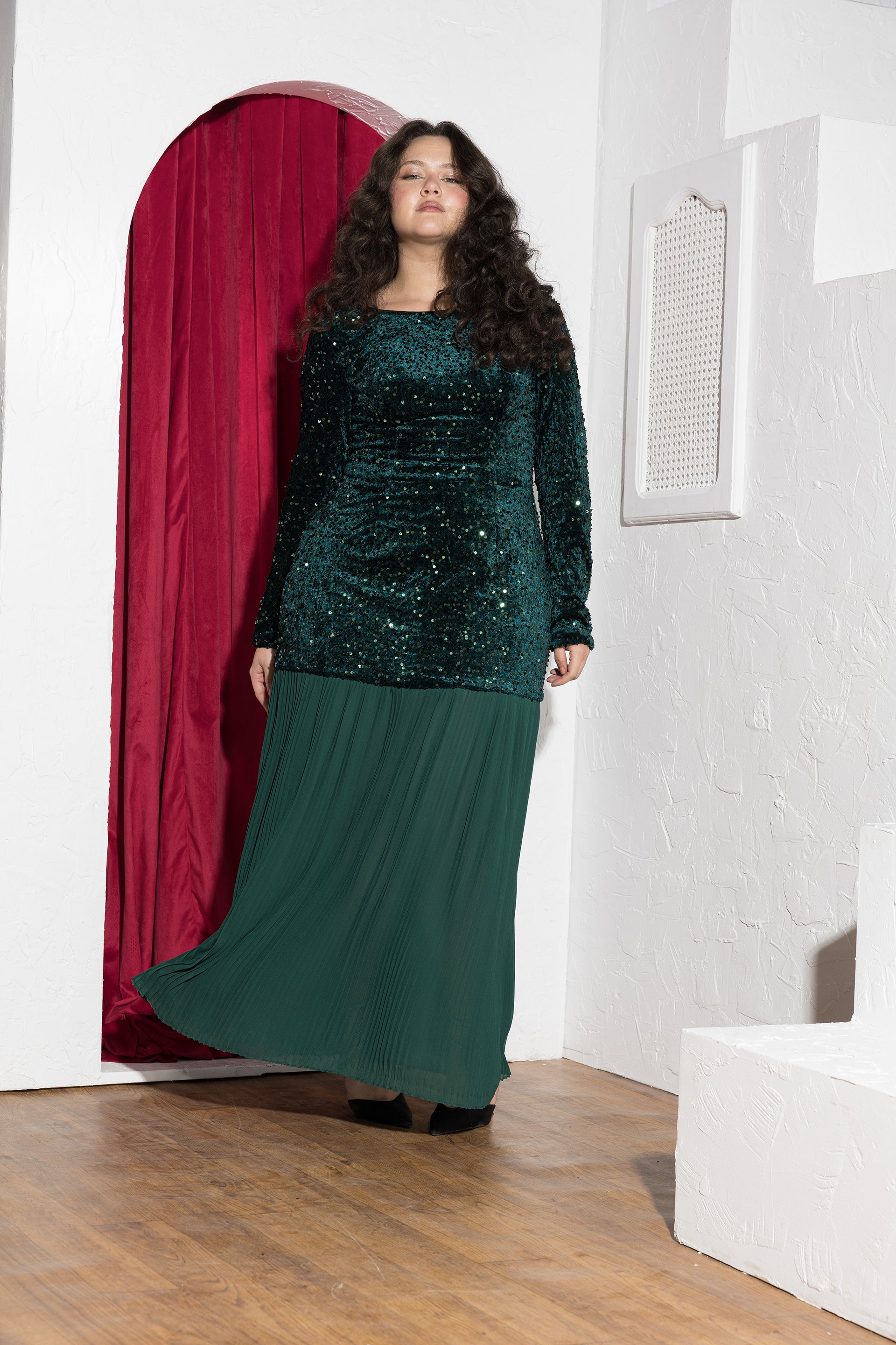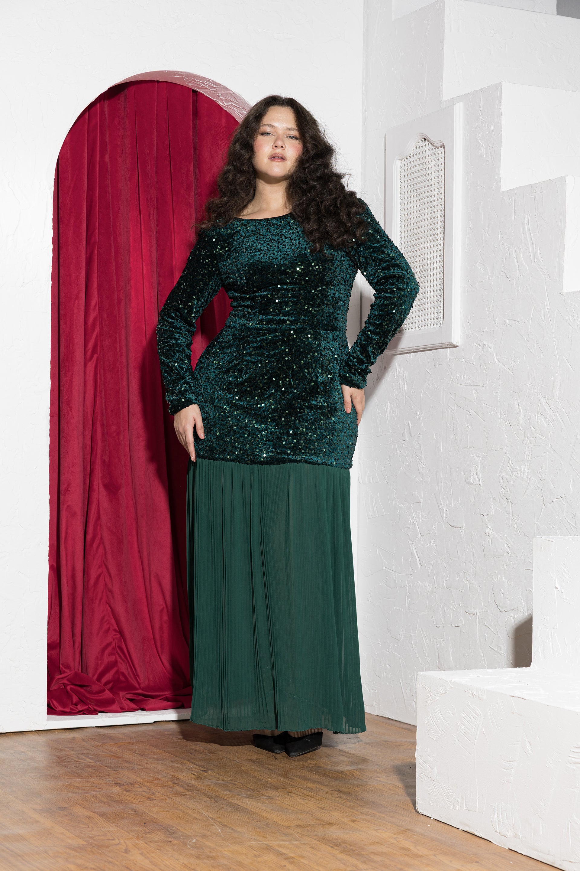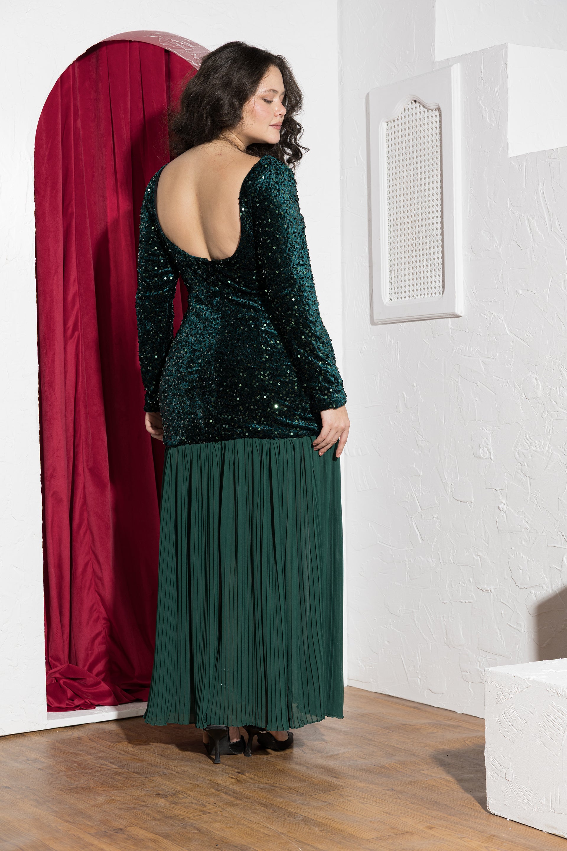 Make a graceful statement with the Emerald Sequin & Pleated Chiffon Soirée Dress, designed for elegant evenings and formal celebrations. Crafted with a sequined velvet bodice, this dress reflects light beautifully while offering a rich, luxurious texture. The open-back detail adds a refined touch of allure, balanced by long sleeves for elegant coverage. Flowing into a pleated chiffon skirt, the design creates movement and a soft contrast that elongates the silhouette. Part of our size-inclusive soirée collection, this dress is fully customizable — customers can add their height and exact body measurements for a perfect fit. Length adjustments are available to ensure the ideal floor-length finish without altering the design. Designed and tailored in Egypt to celebrate real bodies with confidence and elegance.