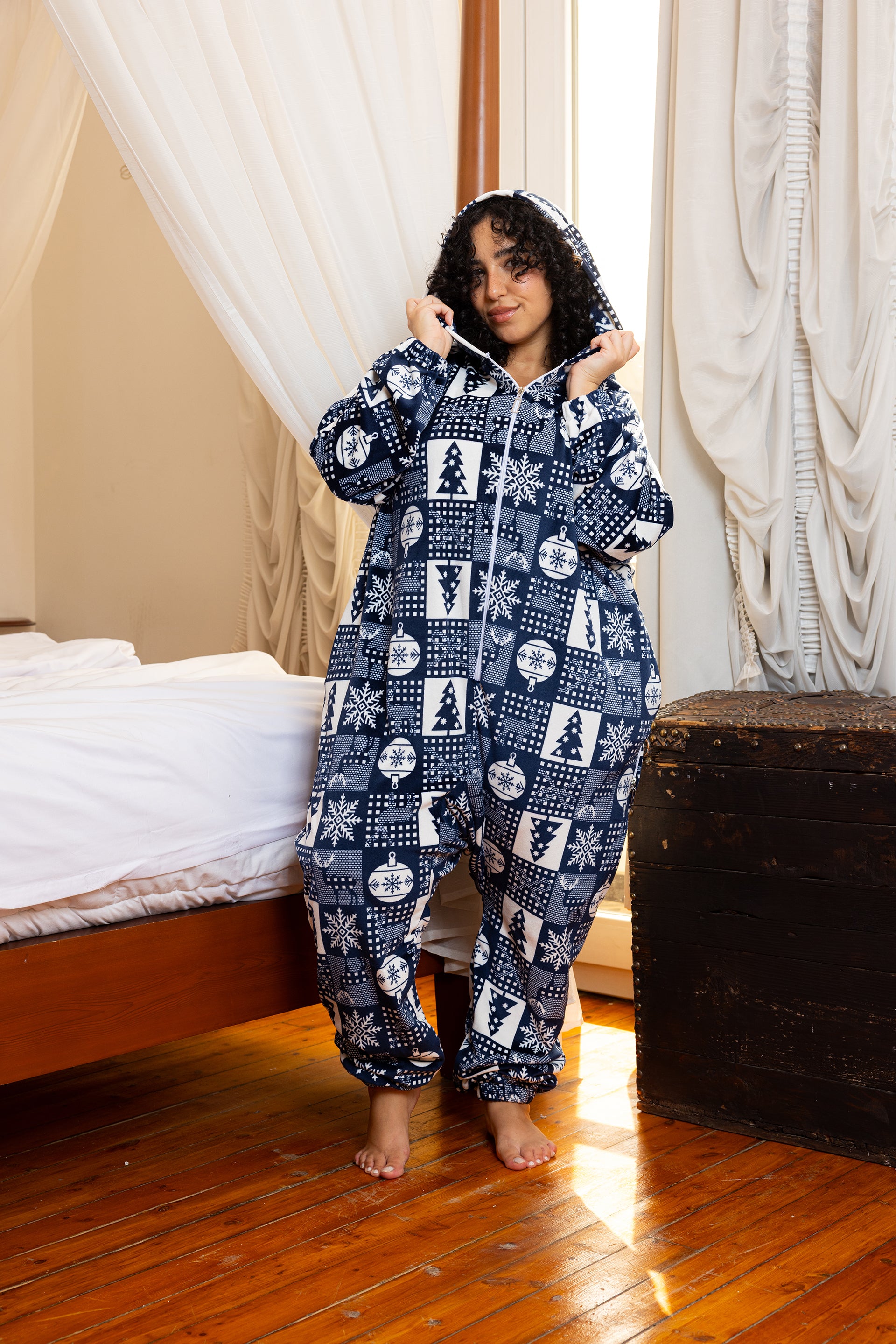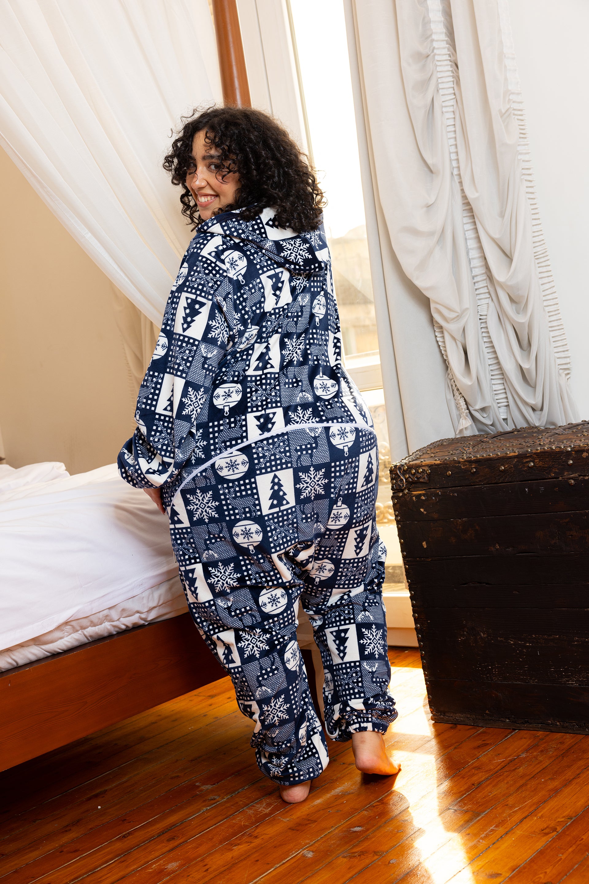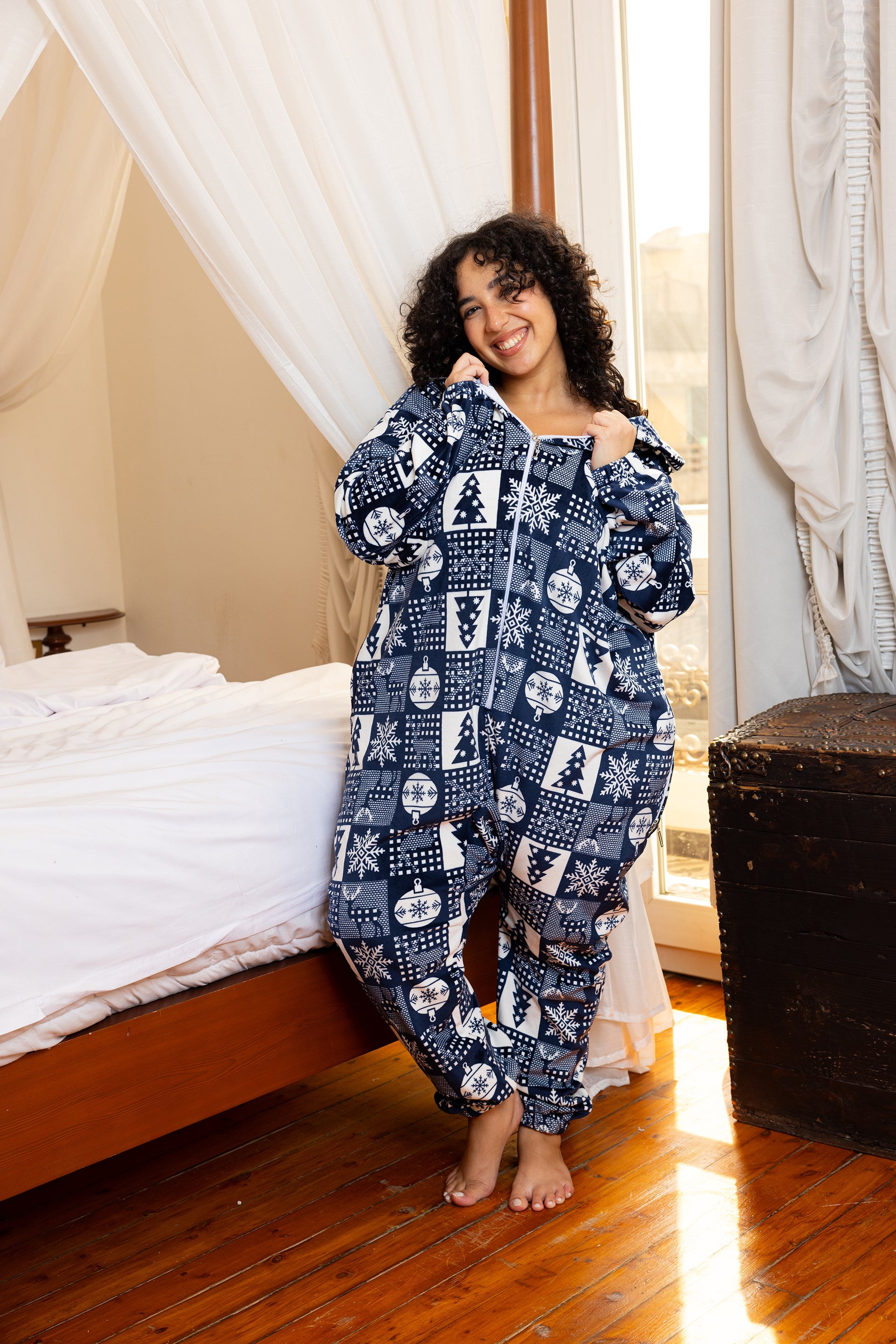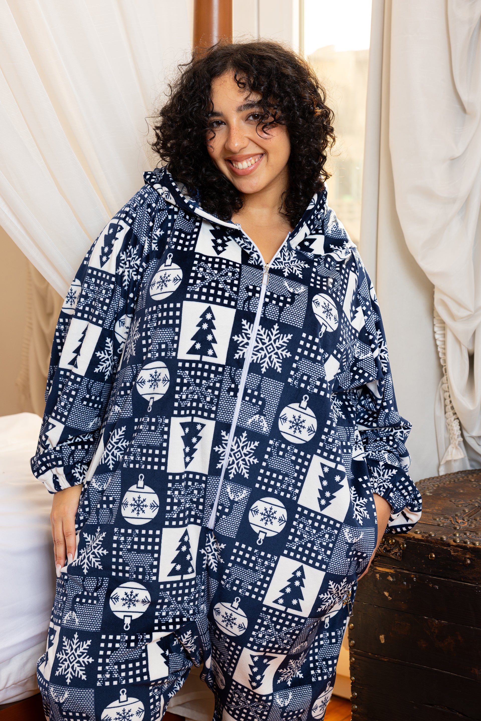 Stay snug and stylish in Rafeya’s Festive Navy Oversized Onesie, your go-to piece for cozy winter nights. Made from plush velvet, it’s designed with a relaxed fit, front zipper, and soft hood for ultimate warmth and comfort.
