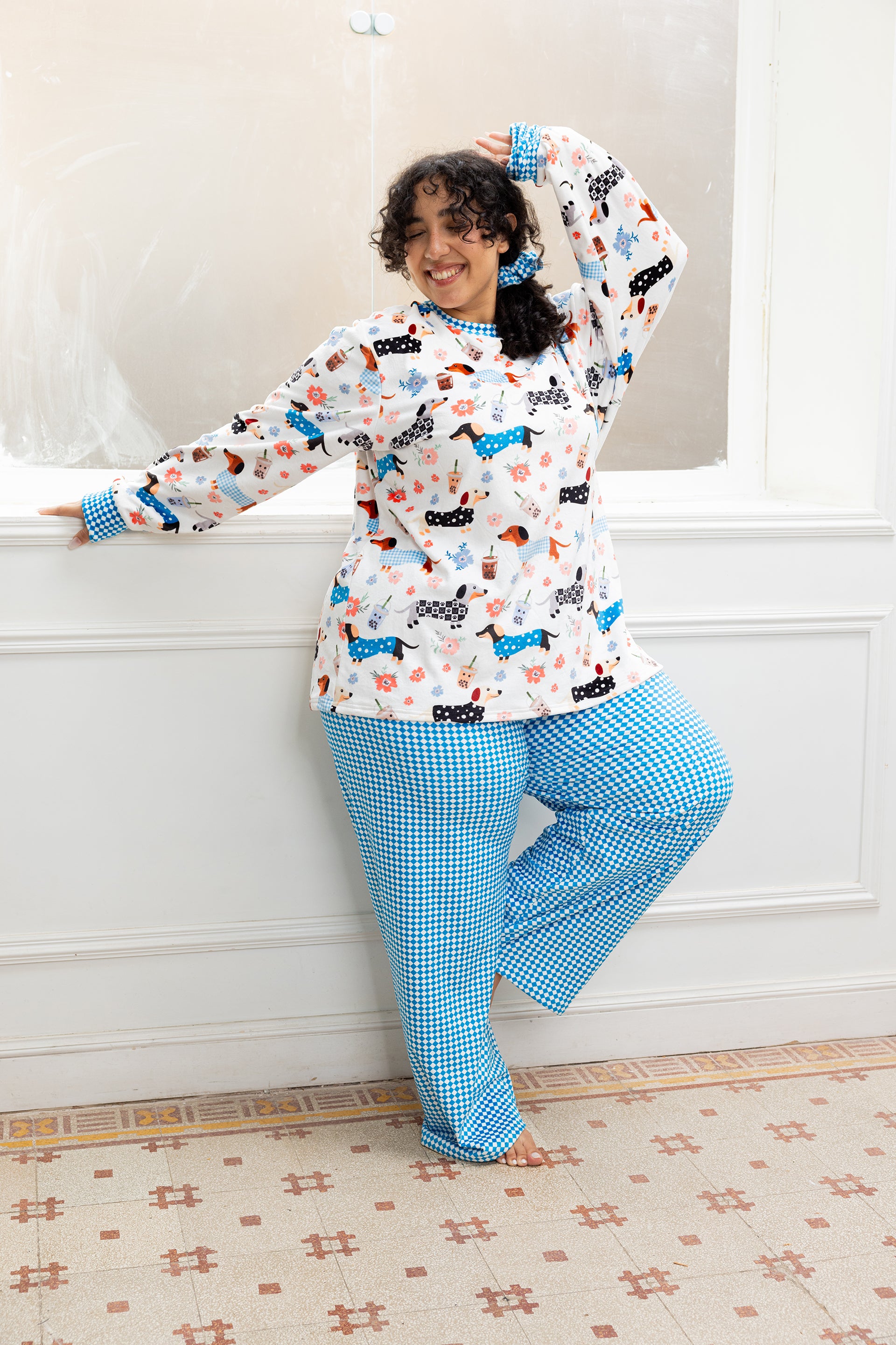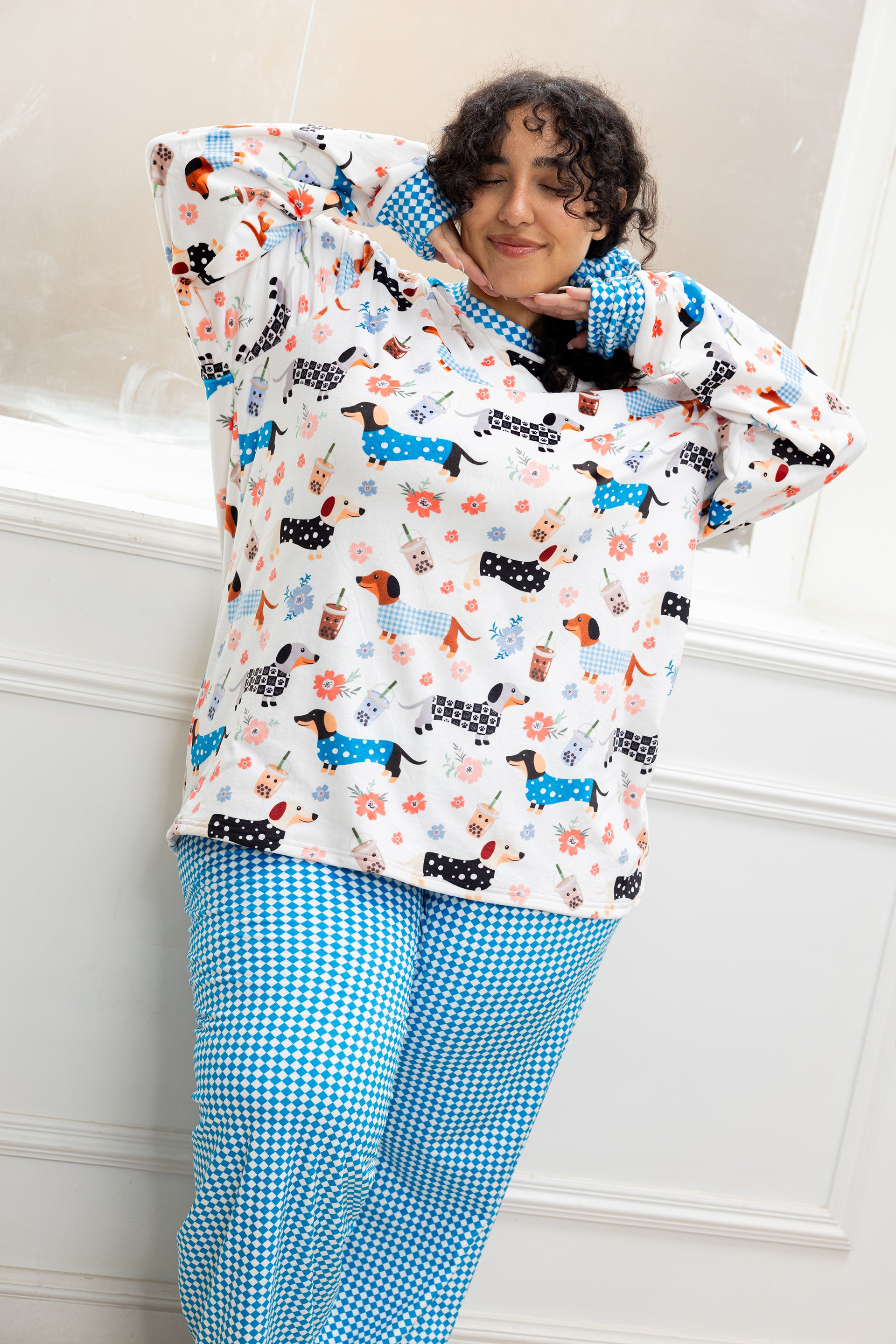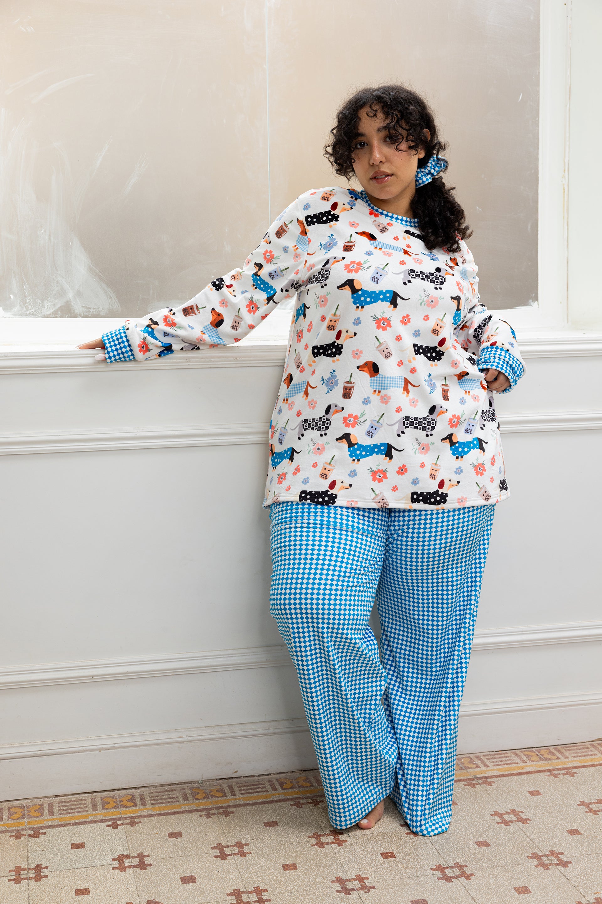 The Lazy Morning Set is made for comfort lovers who want to stay stylish while unwinding. Featuring an adorable dachshund print top paired with blue gingham pants, this set brings playful coziness to your daily routine.
