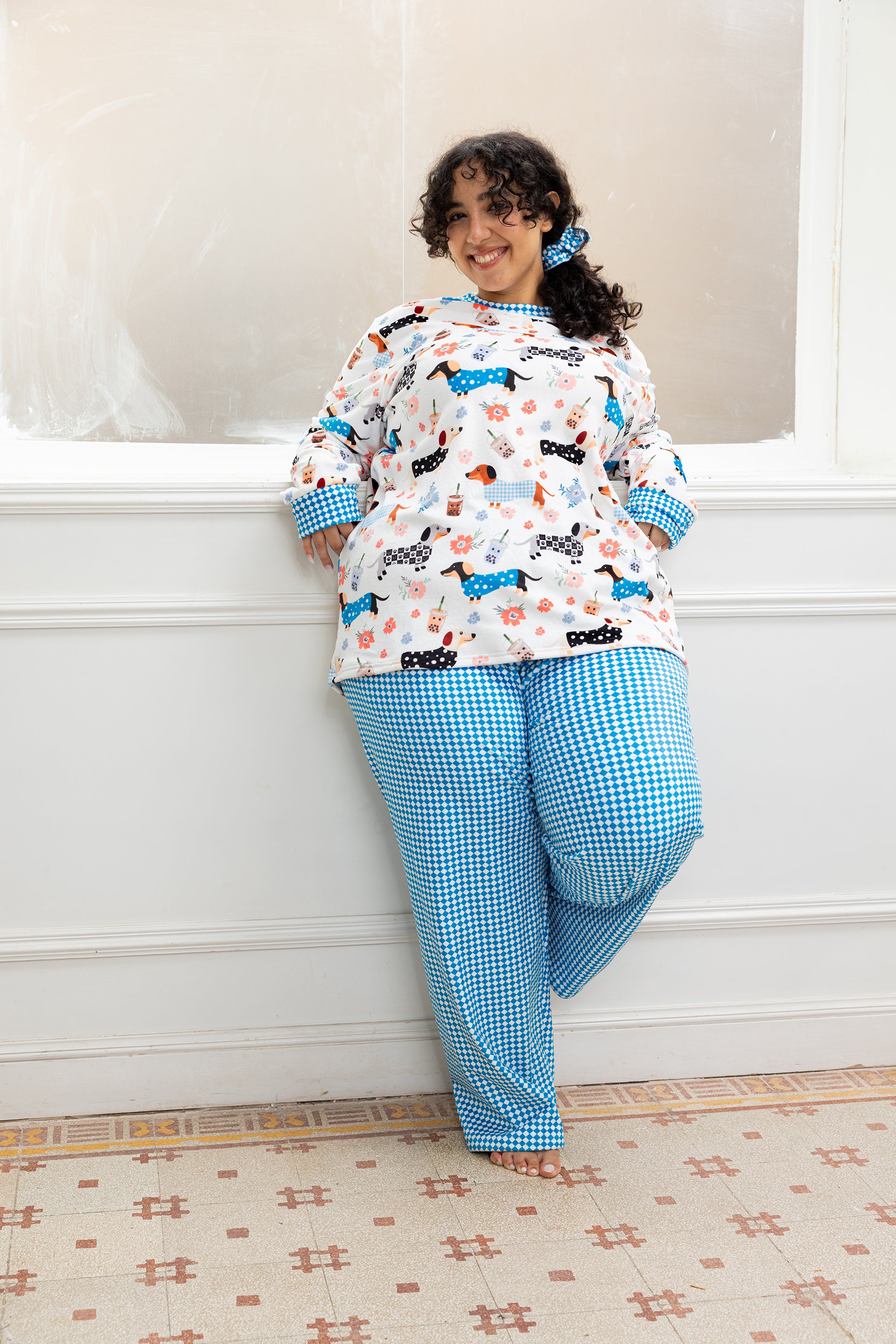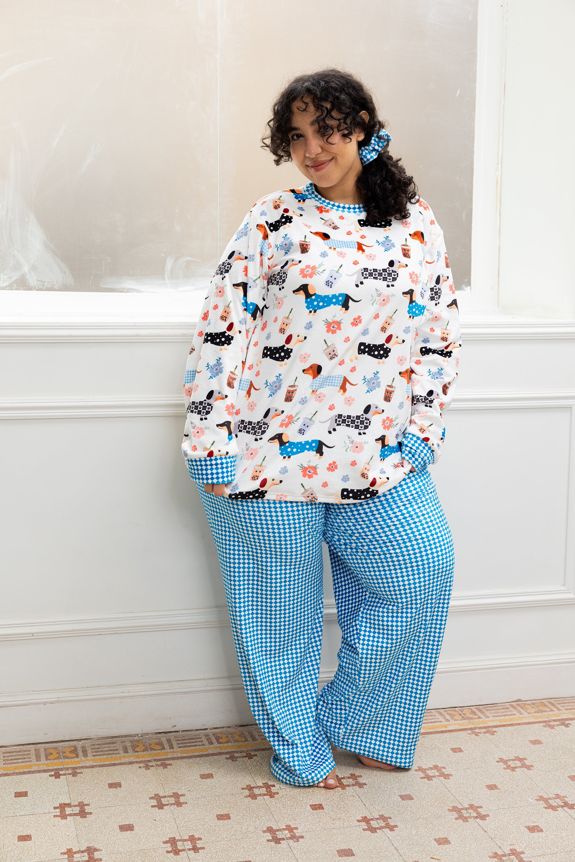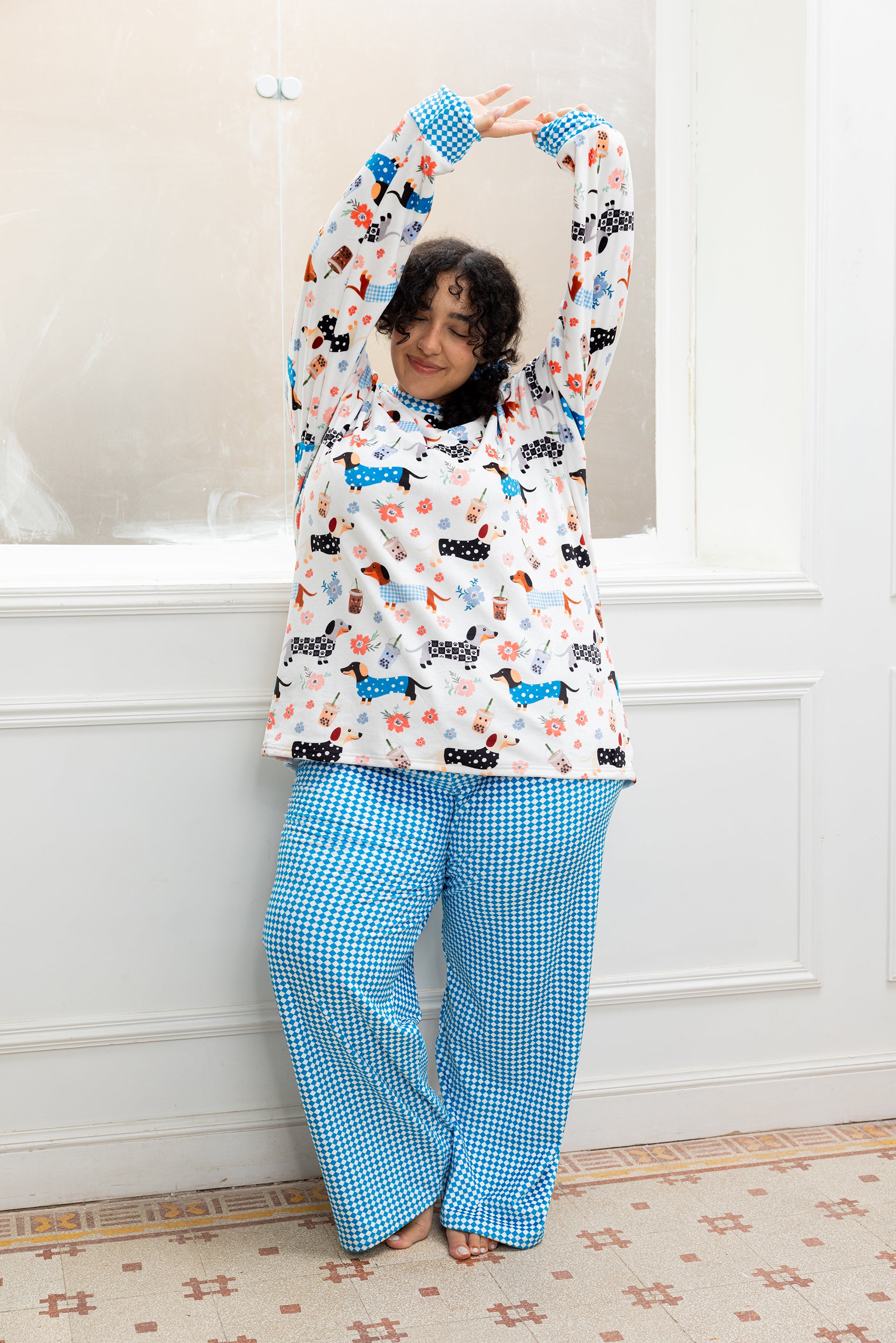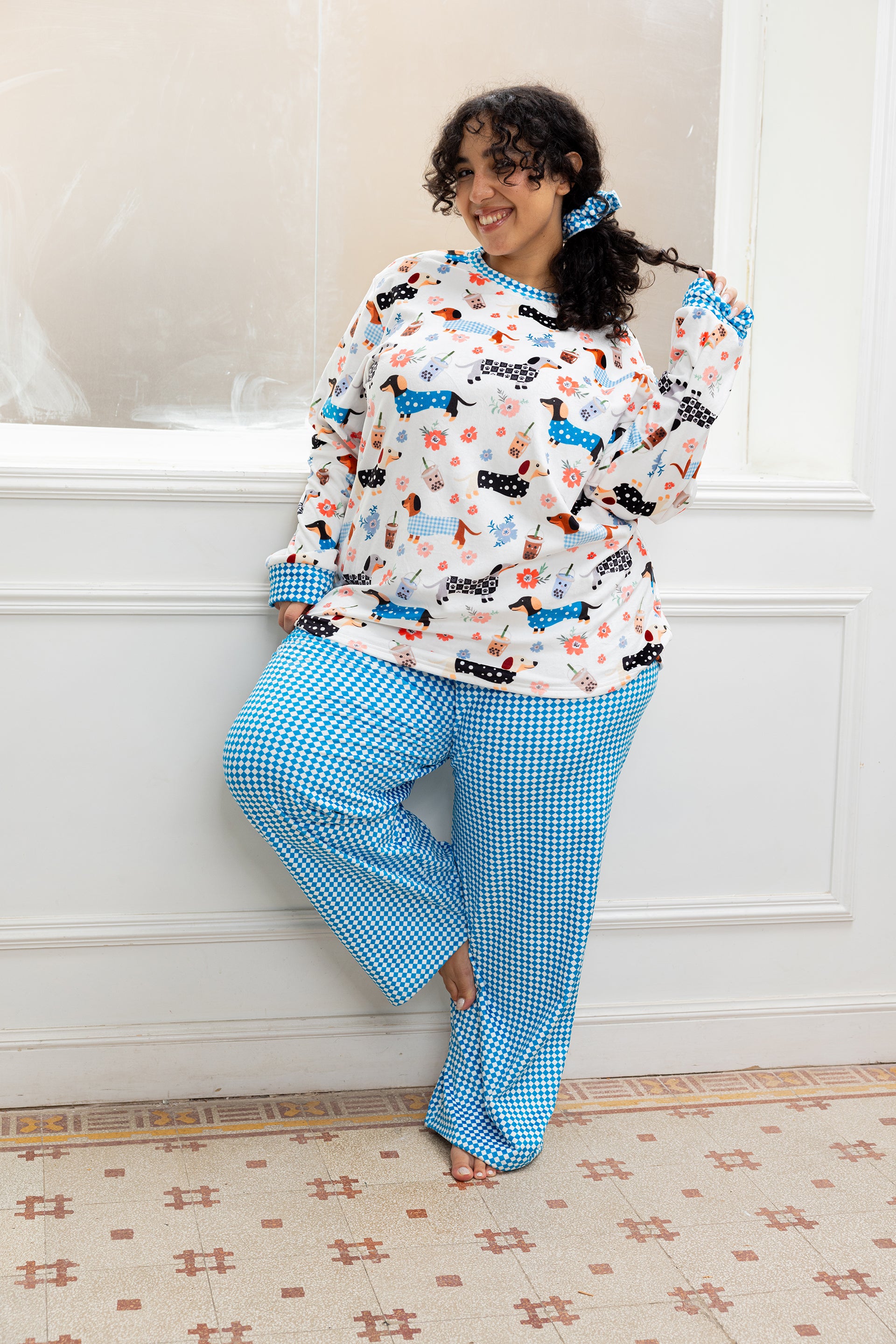 The Lazy Morning Set is made for comfort lovers who want to stay stylish while unwinding. Featuring an adorable dachshund print top paired with blue gingham pants, this set brings playful coziness to your daily routine.