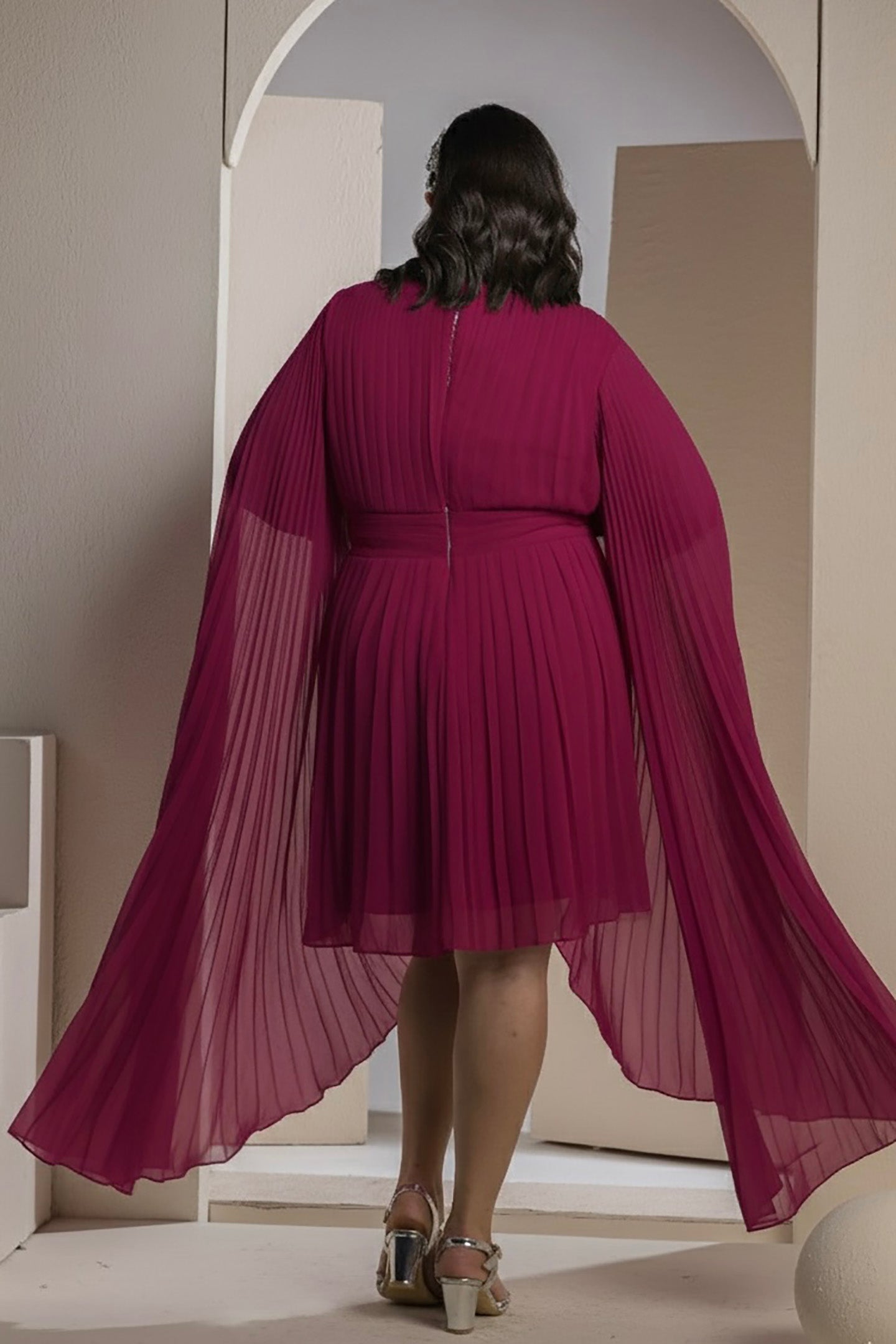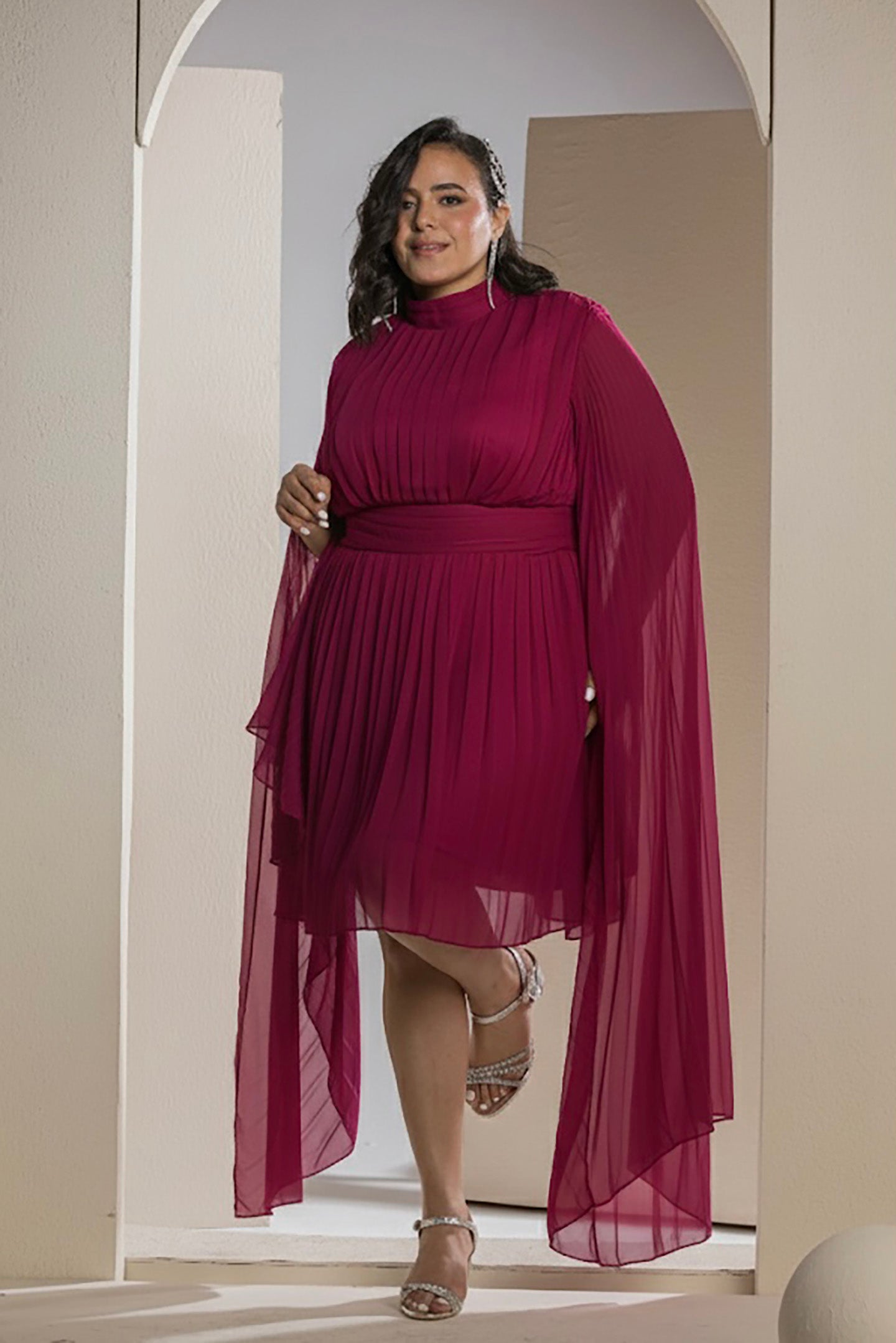 The Magenta Celestial Pleats Dress radiates timeless elegance with a modern twist. Designed in rich emerald chiffon, this dress features dramatic pleated cape sleeves that flow effortlessly with every movement. The high neckline and tiered pleated skirt add structure, balance, and a flattering silhouette. Sophisticated yet bold, this piece is perfect for evening soirées, engagement parties, or any occasion where you want to stand out with grace and confidence.