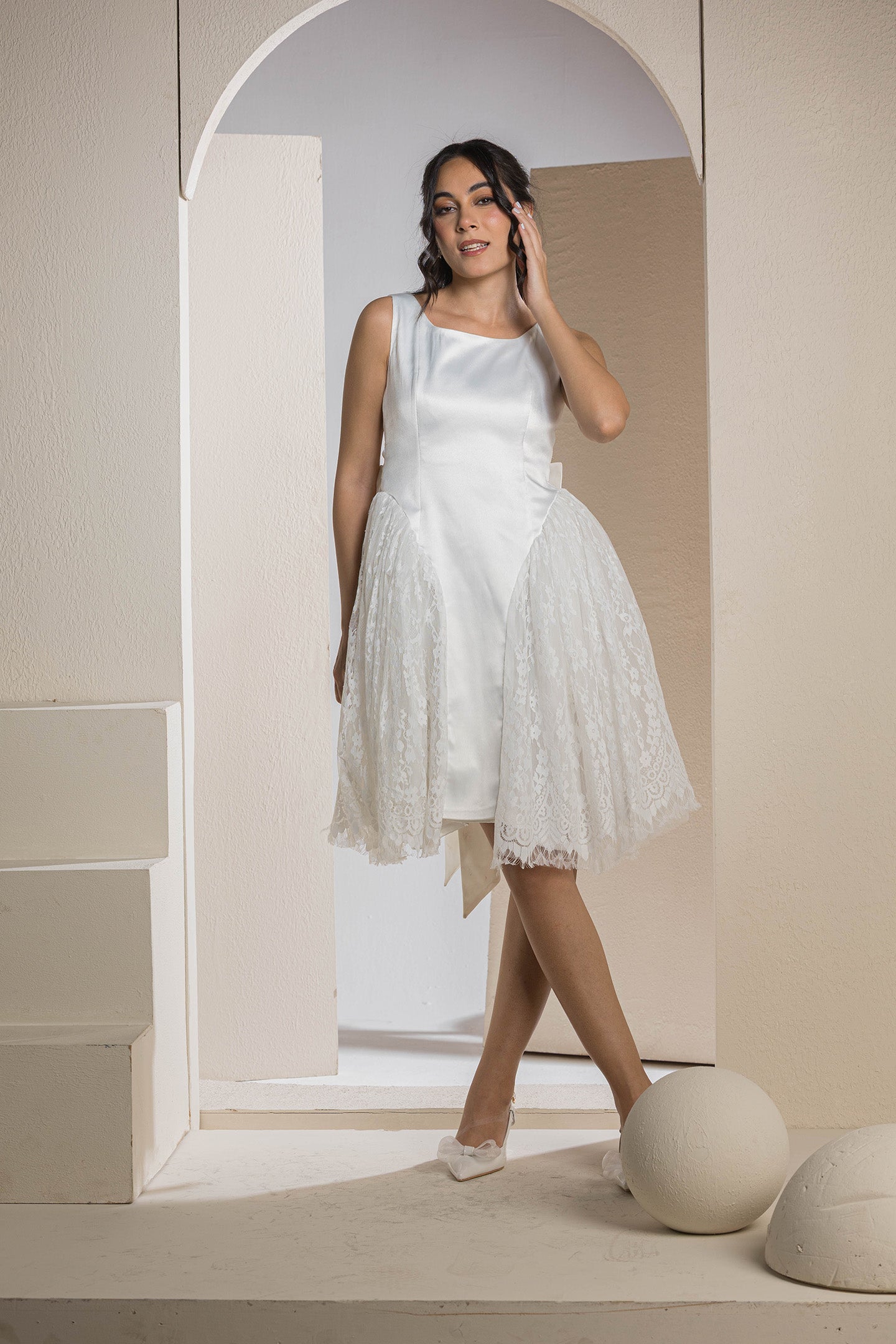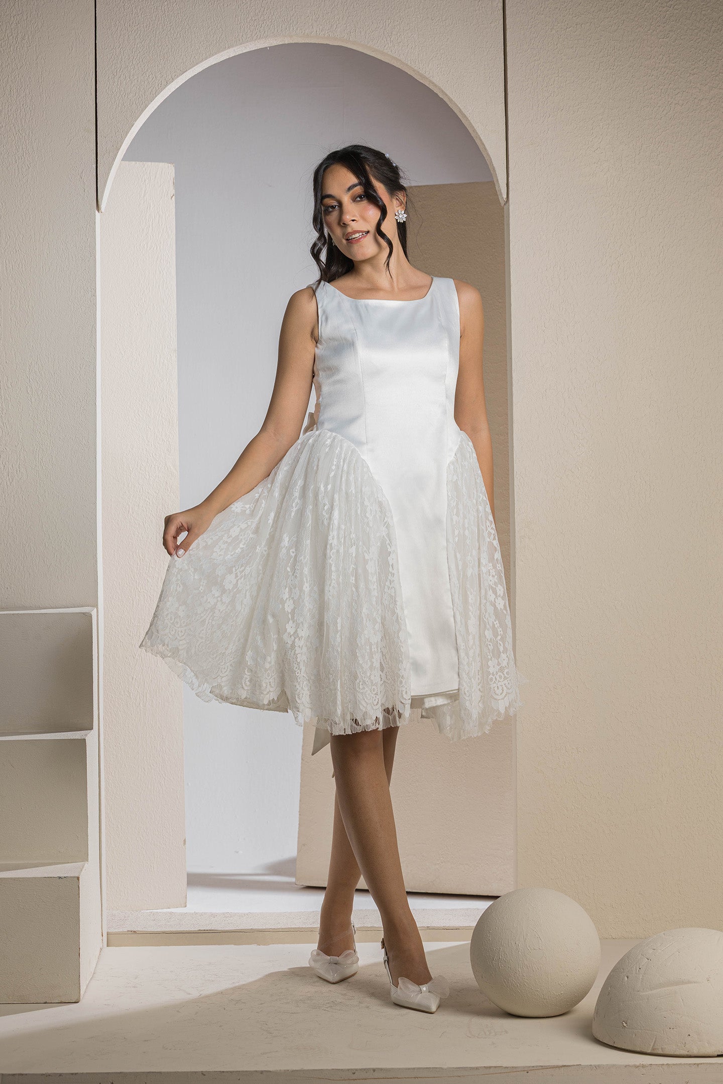 Step out in playful elegance with the Chic Mixed-Fabric Flare Mini Dress, a delightful piece that combines classic charm with modern flair. This white sleeveless dress features a smooth, fitted satin bodice with a graceful scoop neckline, creating a flattering and refined upper silhouette. The unique design then flares out dramatically at the hips with voluminous, textured lace panels, creating a stylish and whimsical bubble-like effect that adds movement and visual interest.