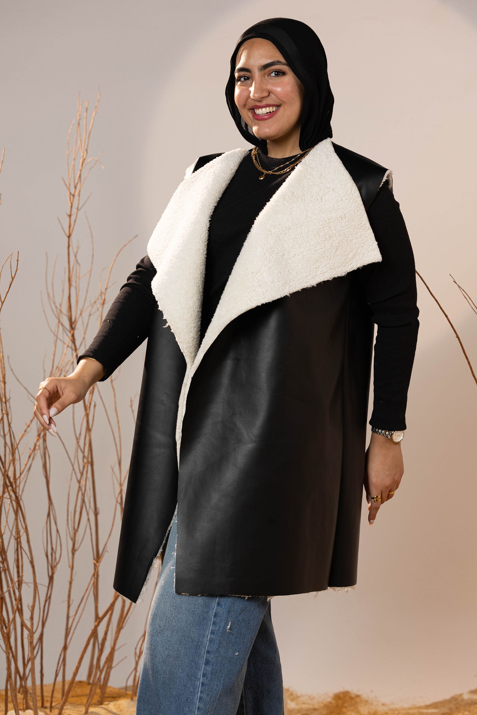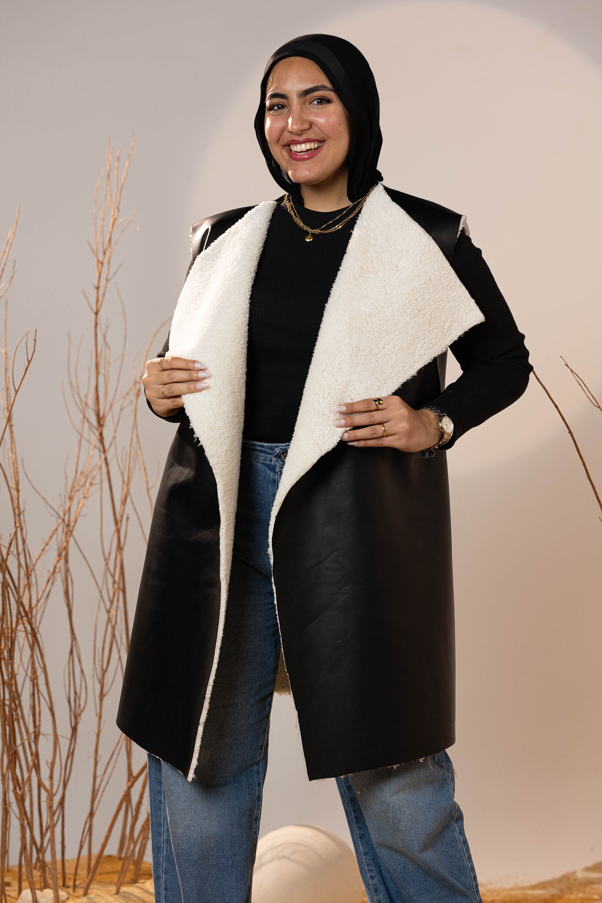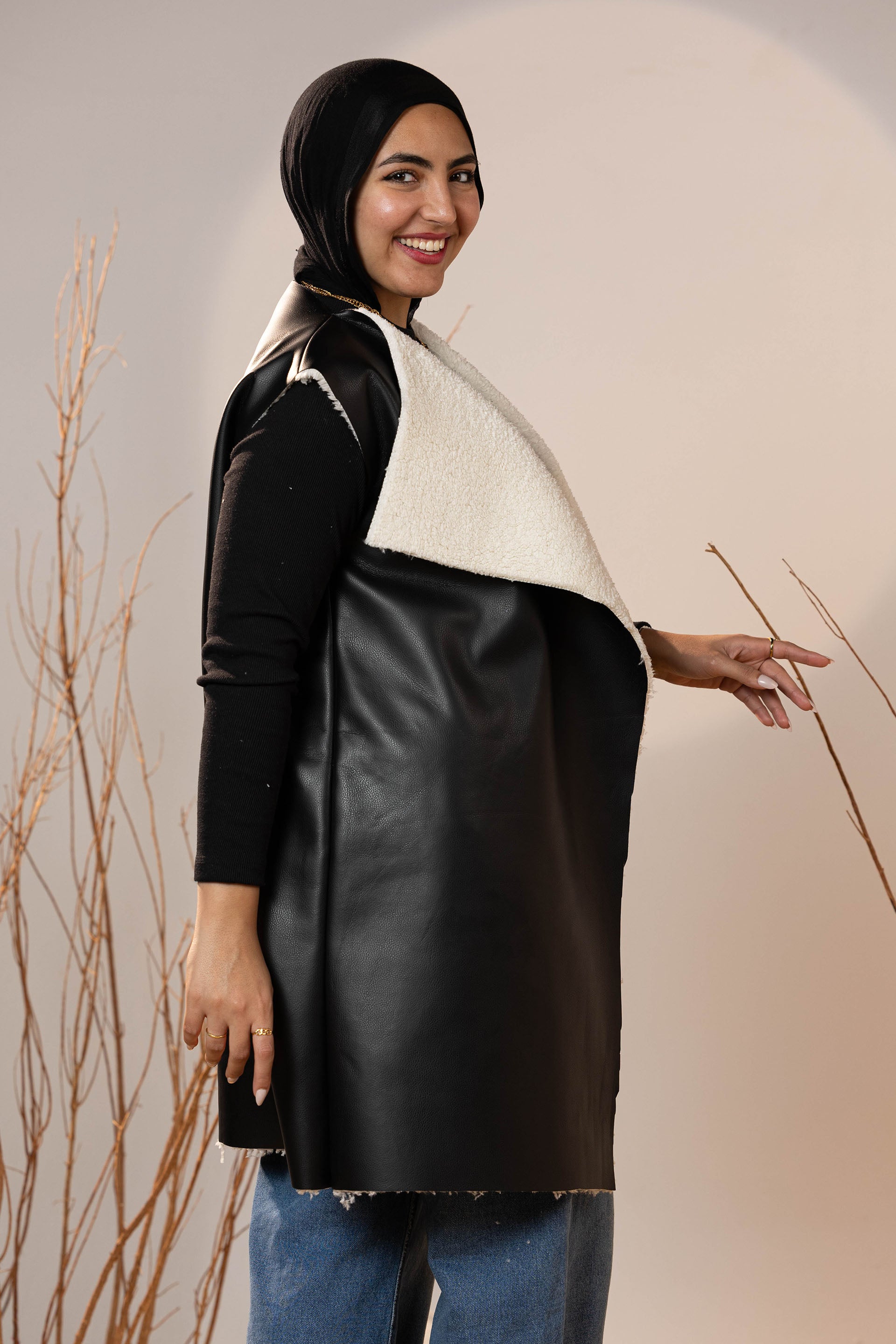 Designed with a sleek black leather-look exterior and a soft plush off-white lining, this long vest brings beautiful contrast and texture. The plush lining is visible along the wide lapels, framing the face and neckline with a cozy feel while the body remains structured and polished.