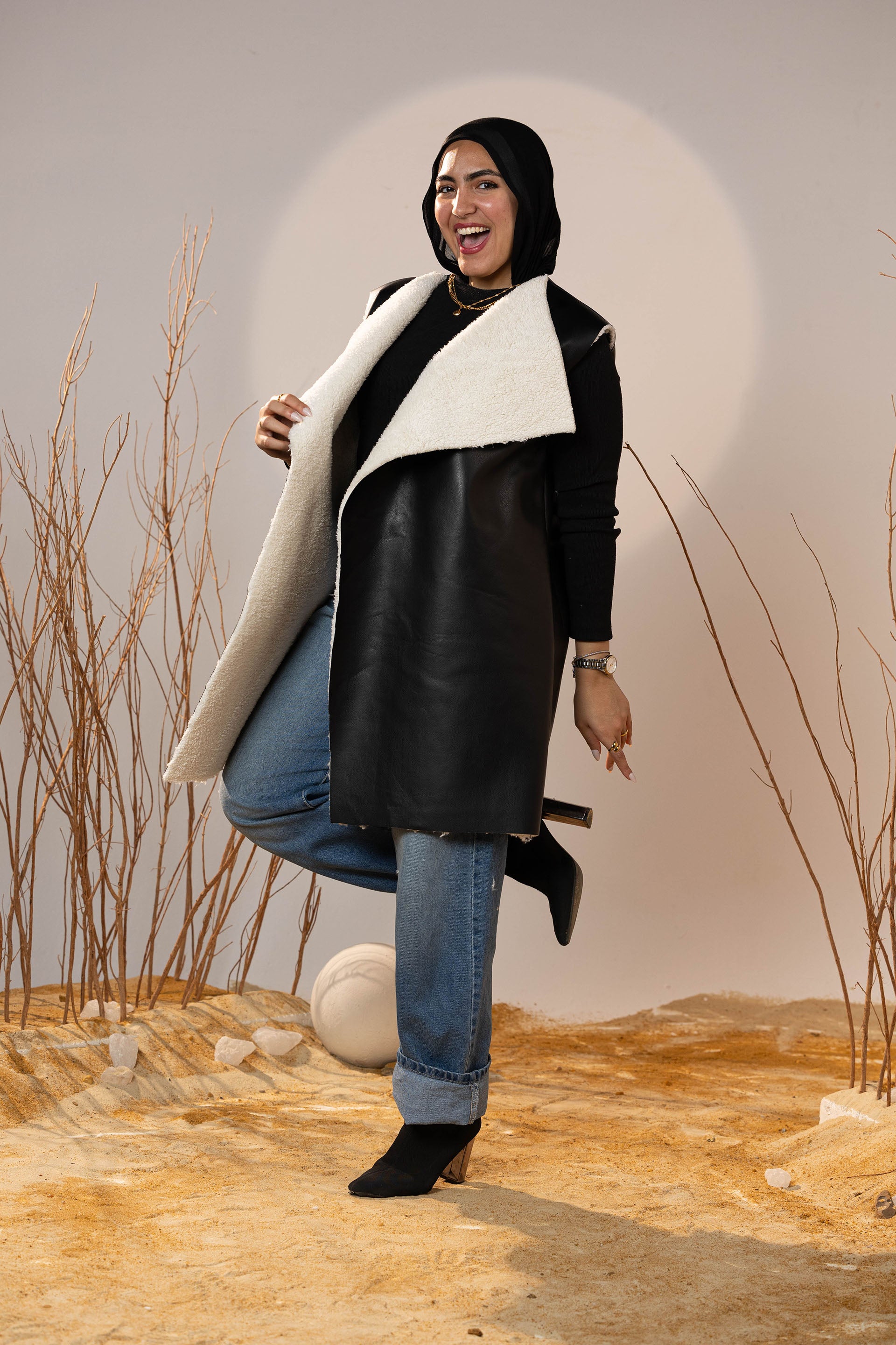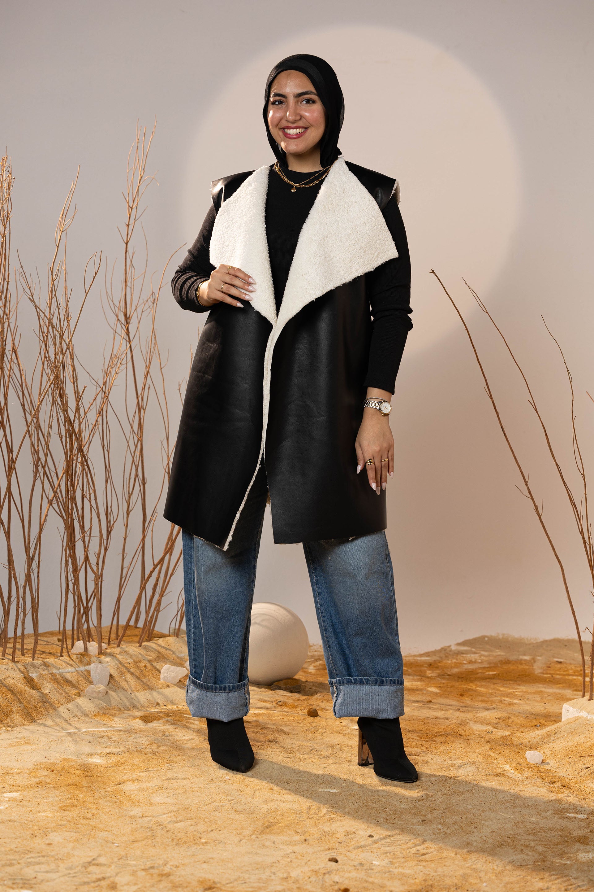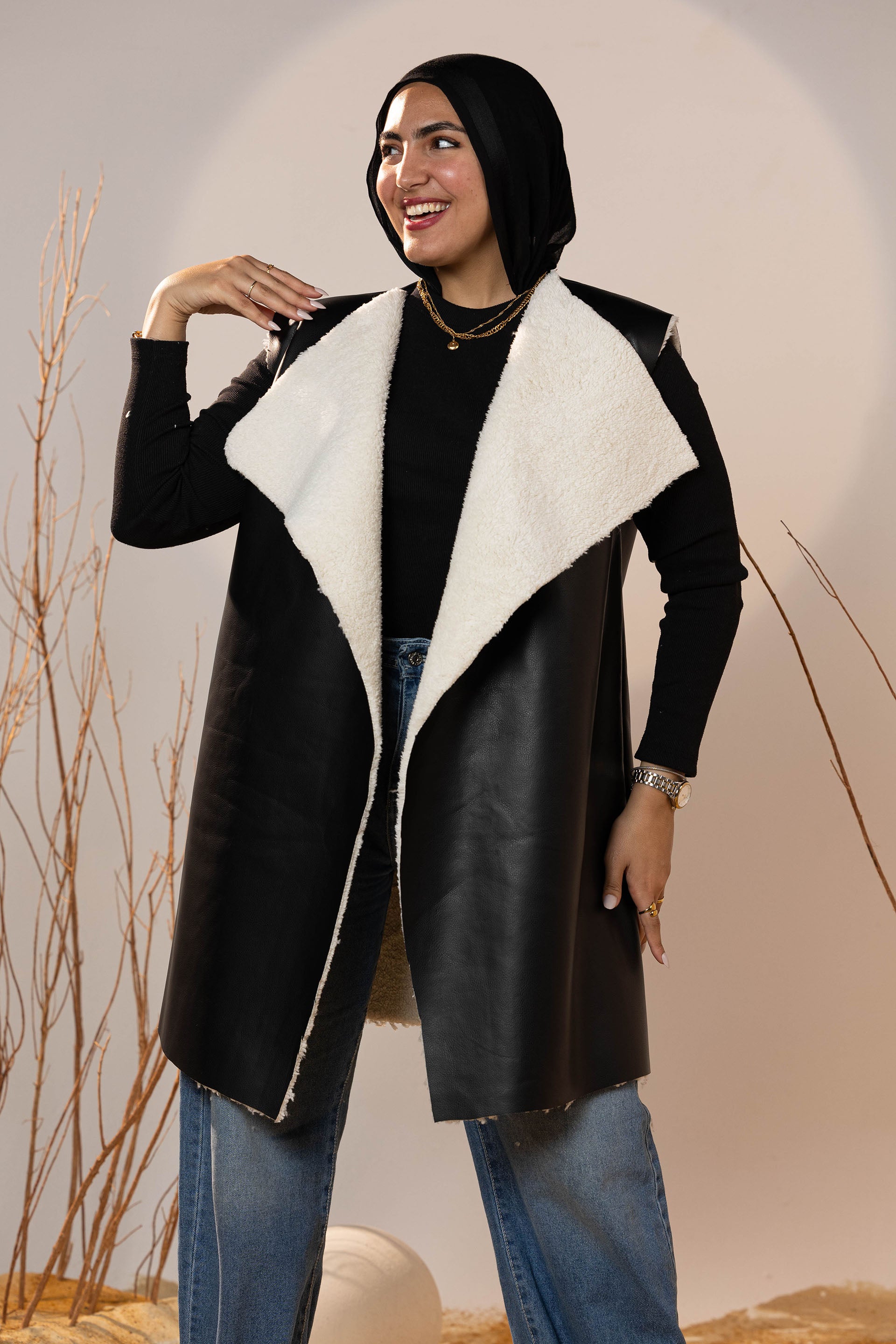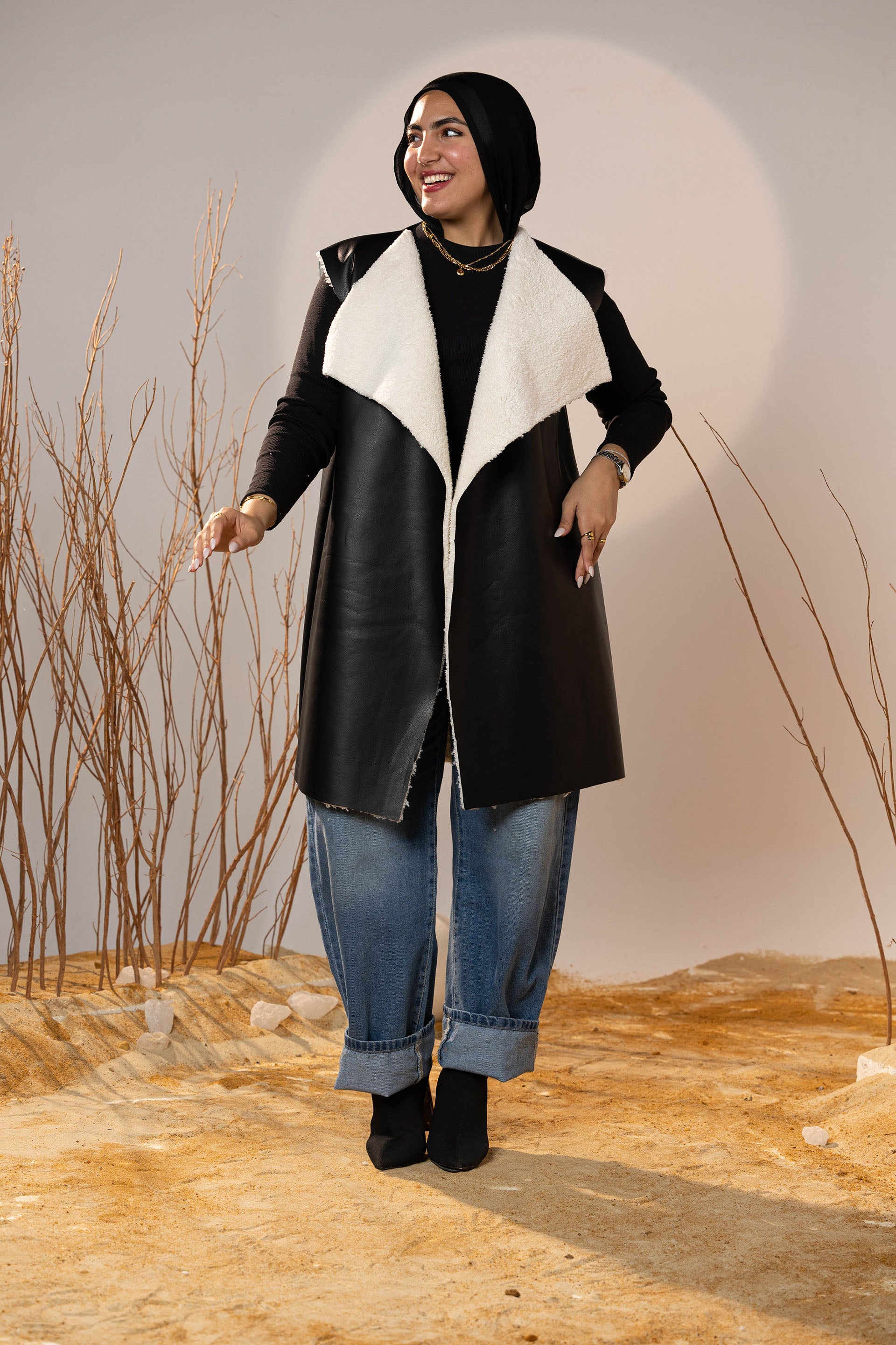 Designed with a sleek black leather-look exterior and a soft plush off-white lining, this long vest brings beautiful contrast and texture. The plush lining is visible along the wide lapels, framing the face and neckline with a cozy feel while the body remains structured and polished.