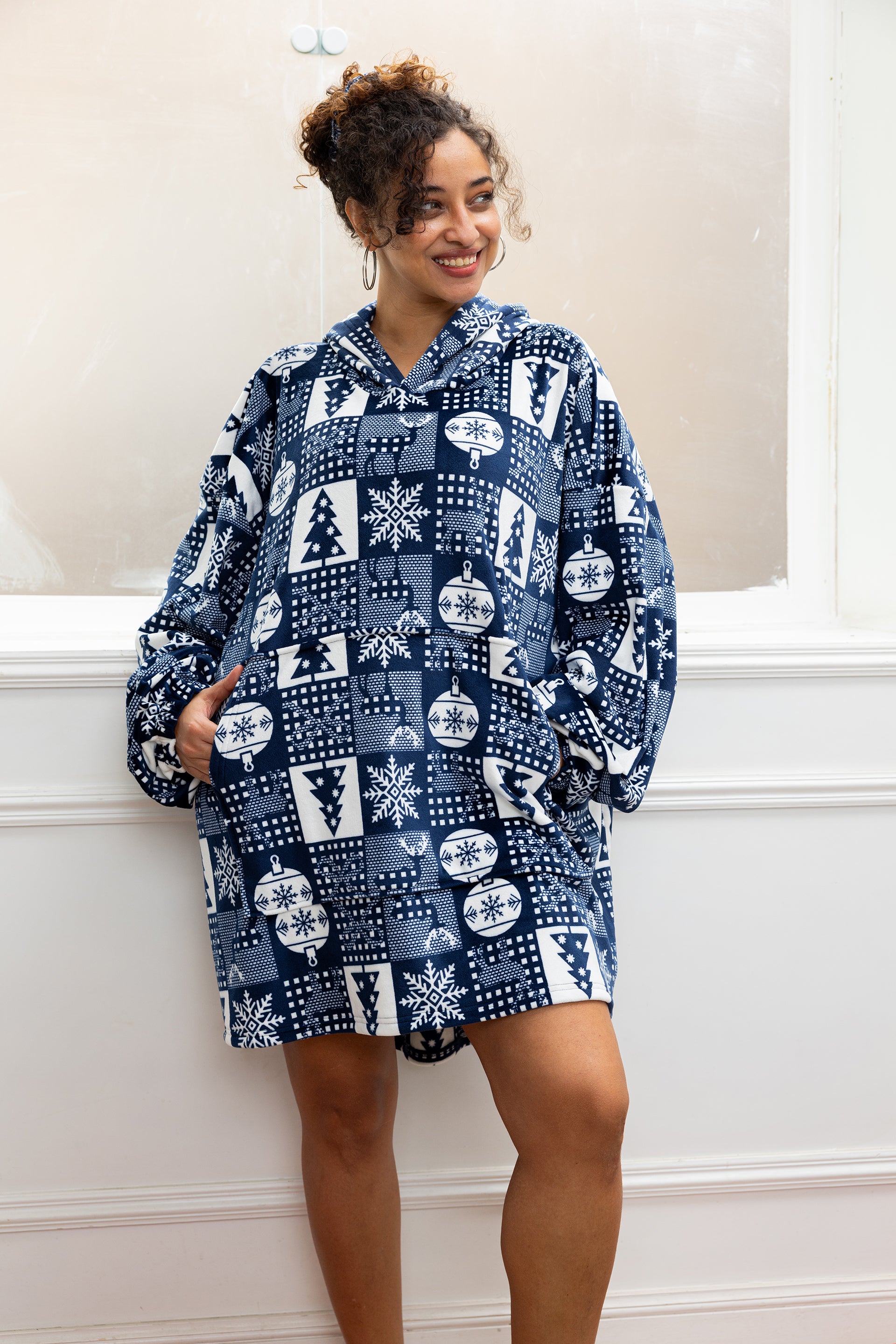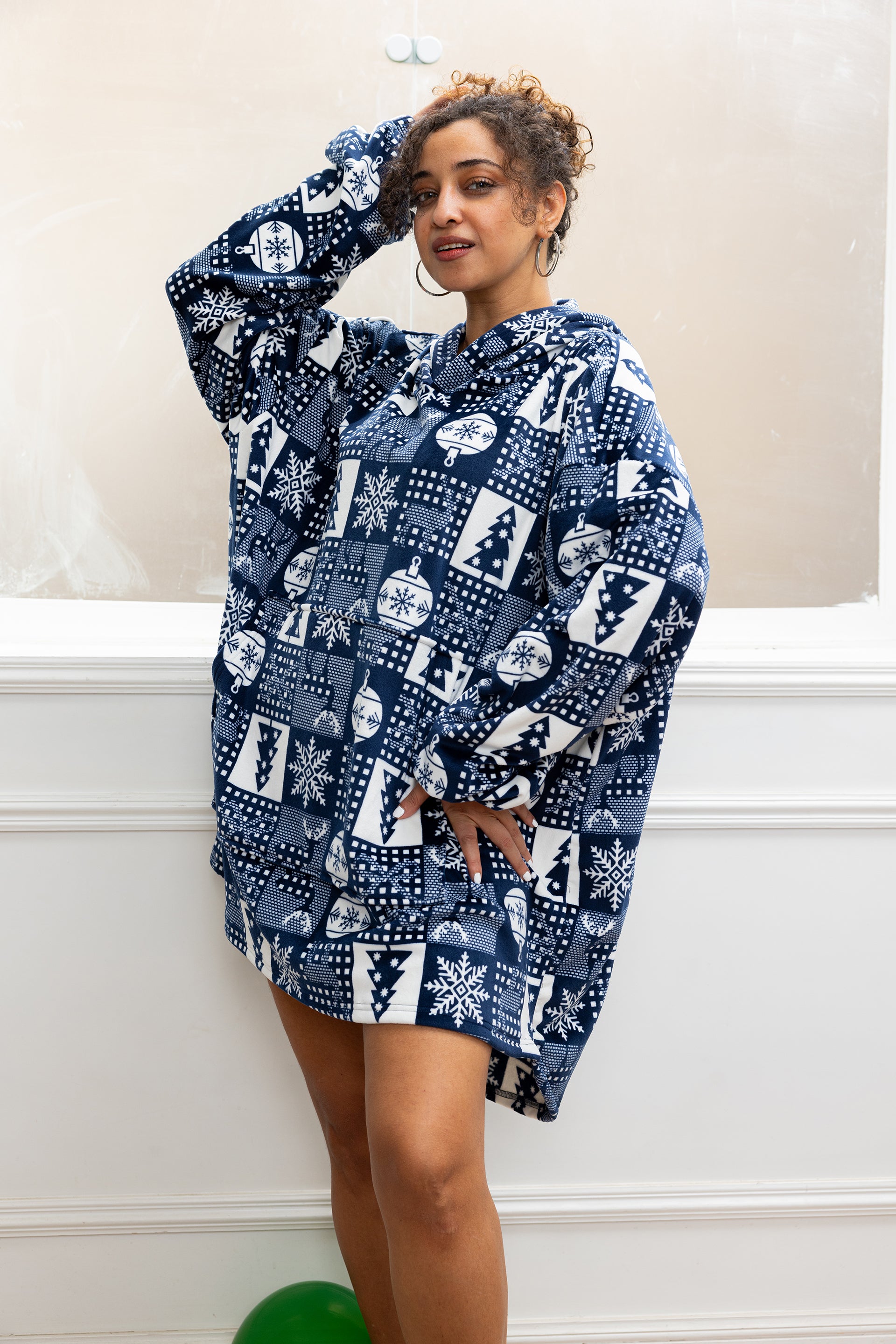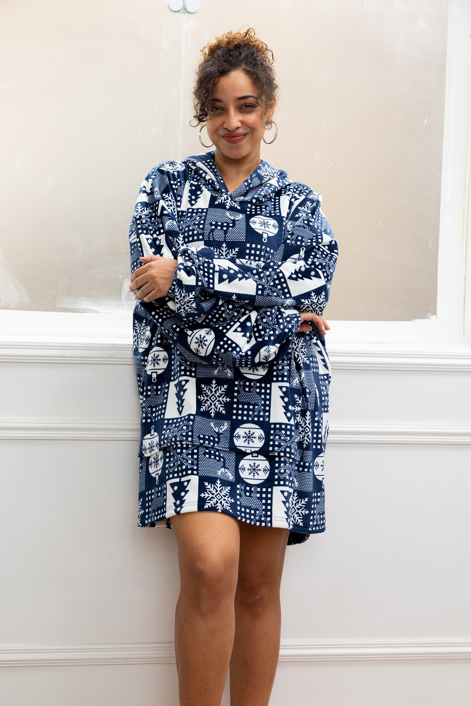 The Midnight Festive Hoodie Blanket is where cozy meets celebration. Designed in deep navy with snowy white festive prints, it wraps you in the warmth of the holidays while keeping your look effortlessly chic.