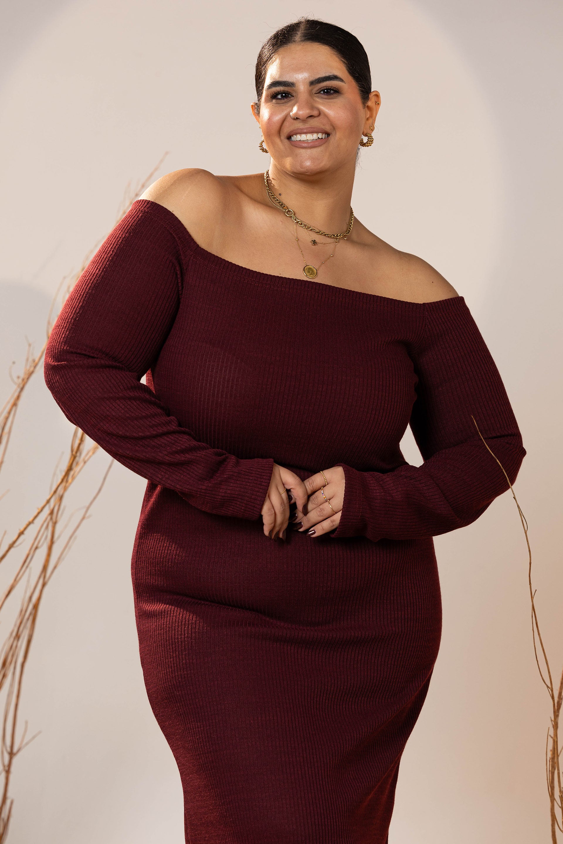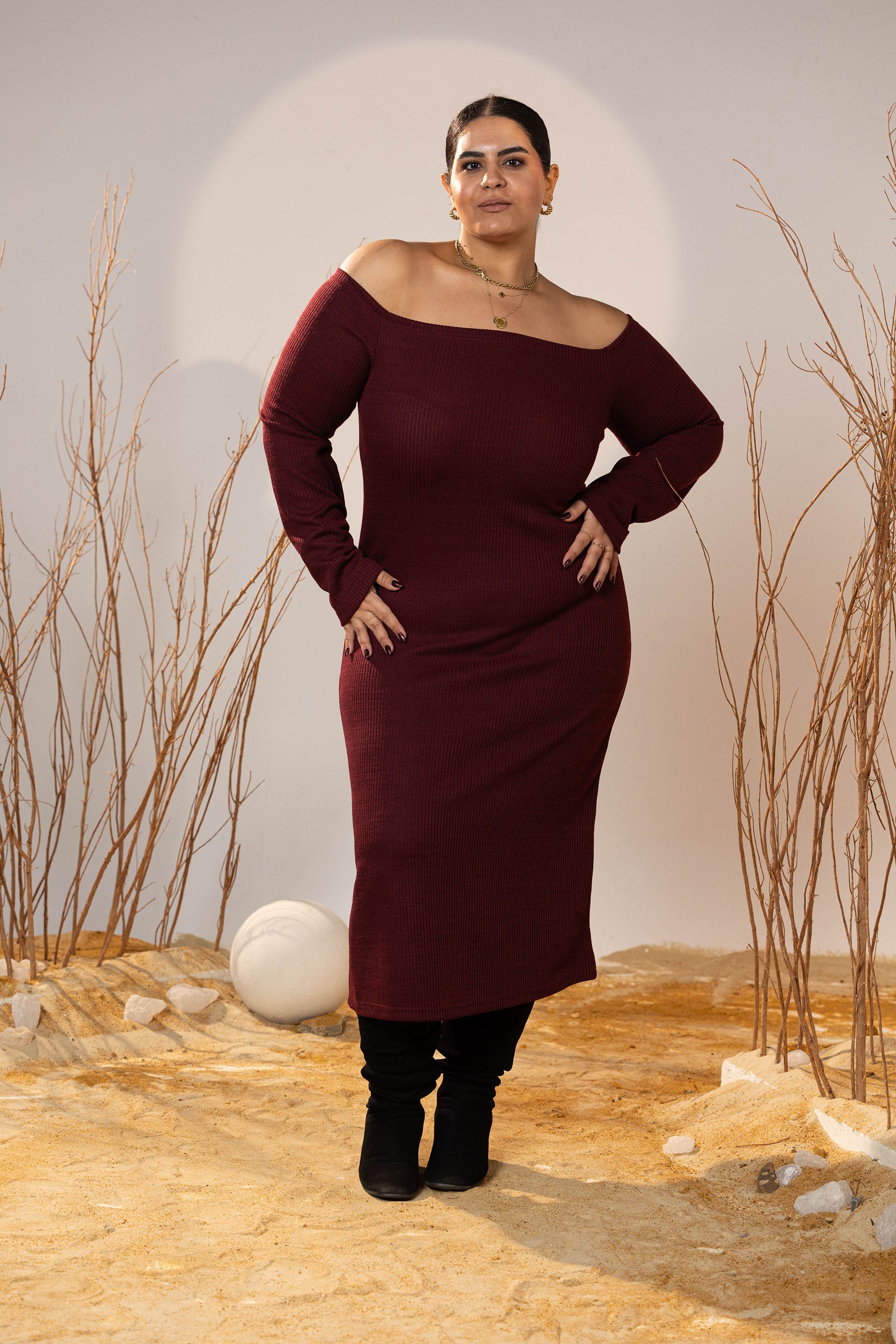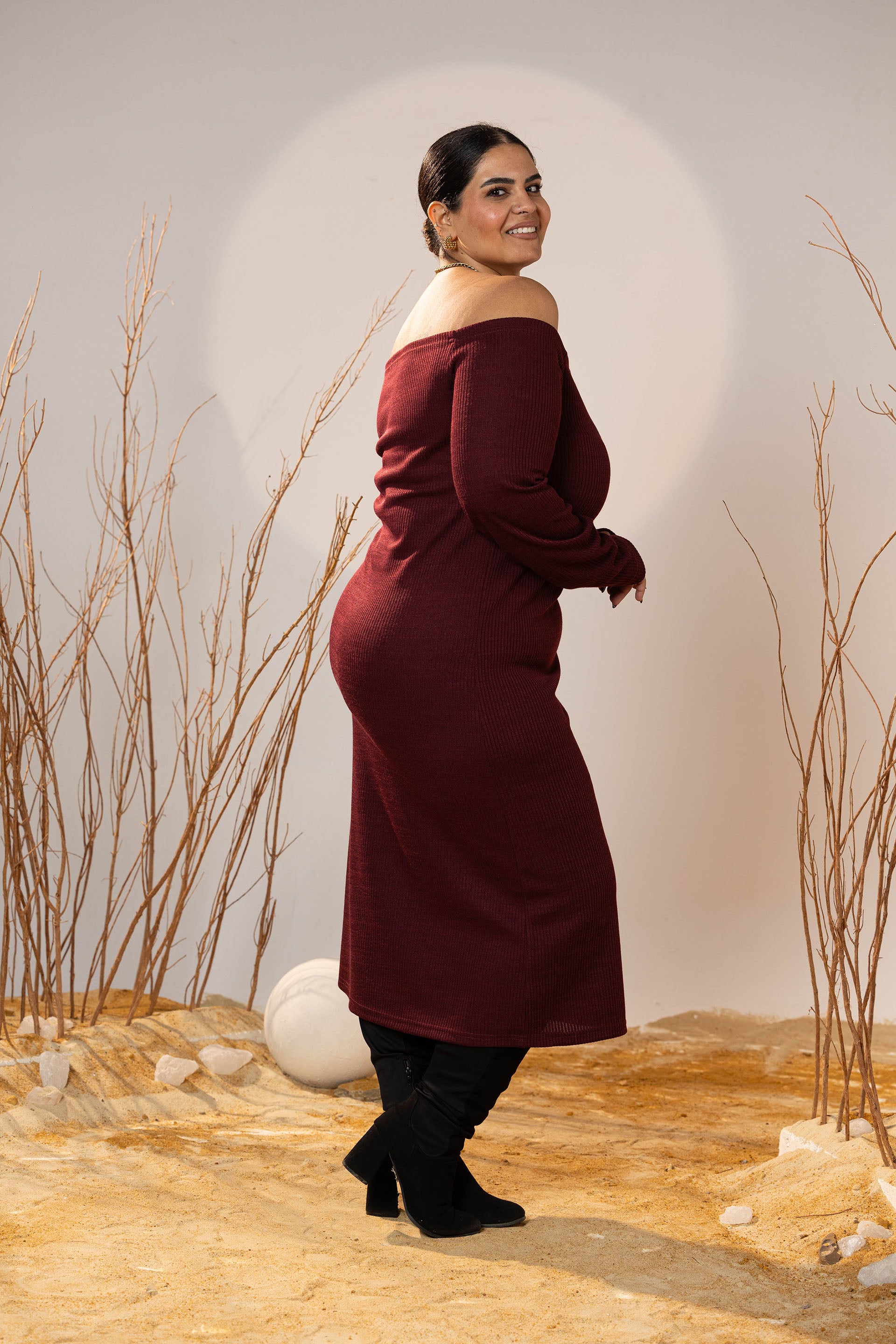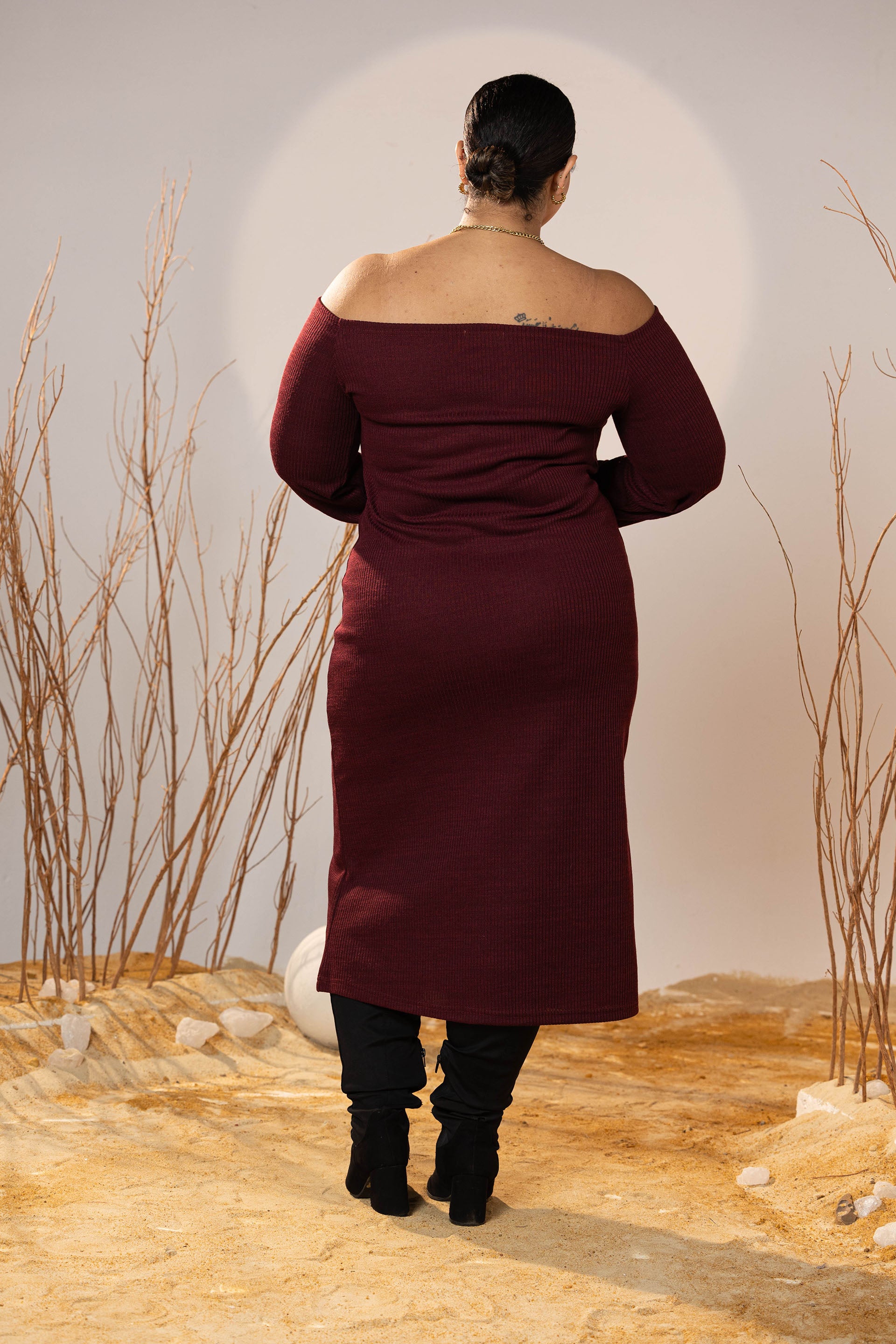 Off-Shoulder Maroon Mid-Calf Rib Dress