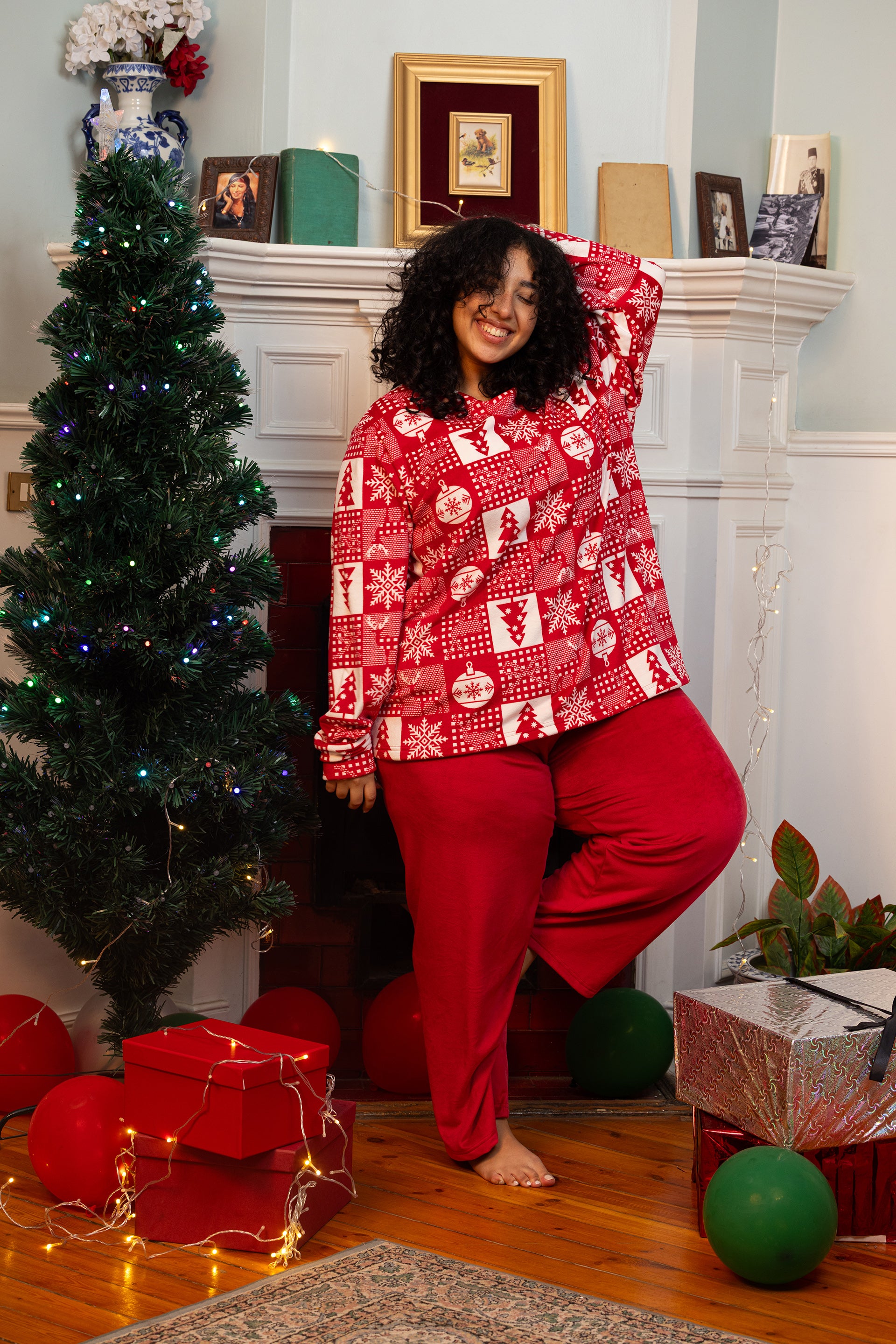 Wrap yourself in pure festive joy with the Holiday Cheer Set. The bright red top, covered in playful winter icons, brings instant Christmas spirit to your home days, while the soft velvety pants add cozy warmth you’ll never want to take off. Designed for comfort, movement, and feel-good moments — this set is your go-to for decorating the tree, sipping hot chocolate, or relaxing through winter nights. A cheerful, comfy classic for the season.